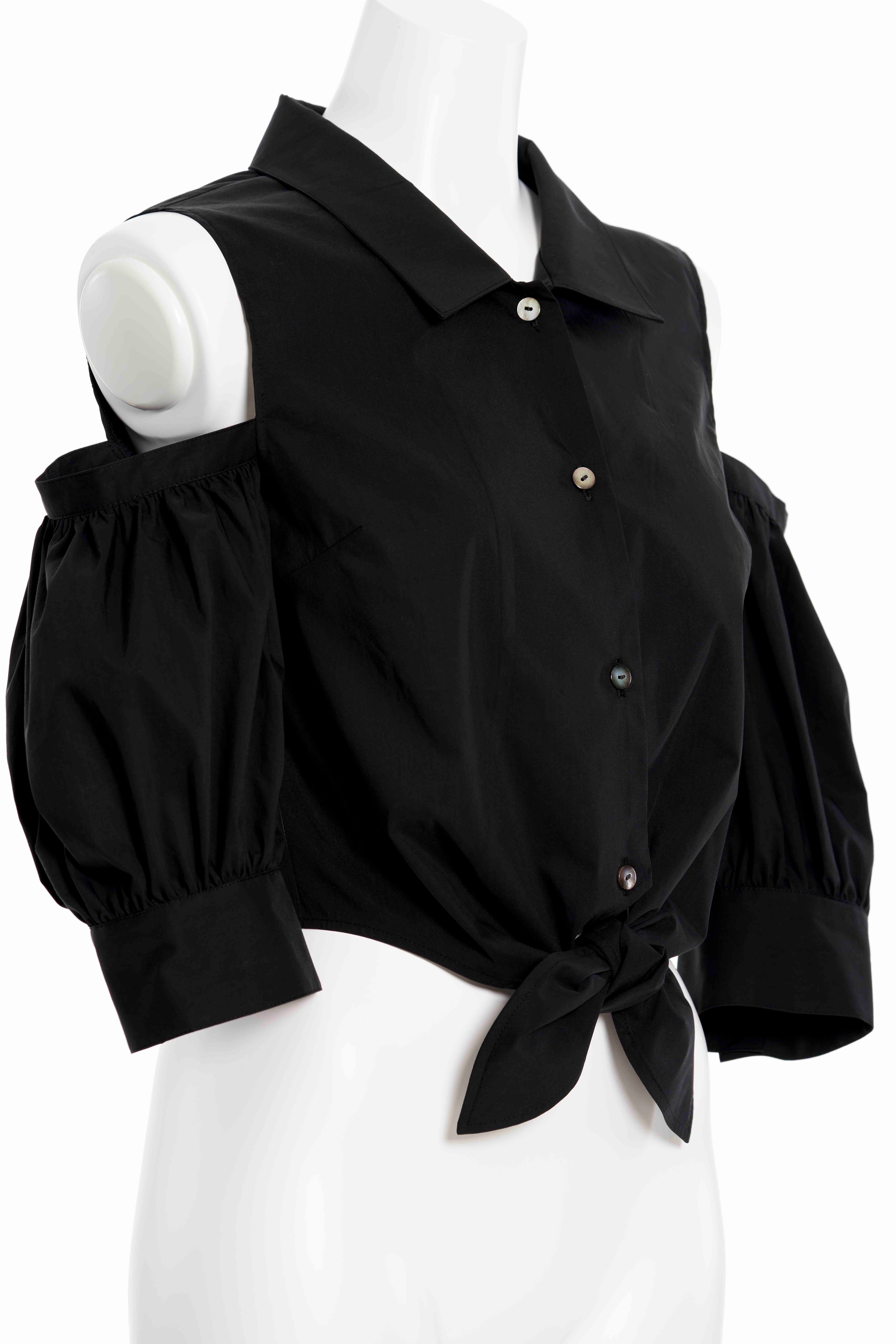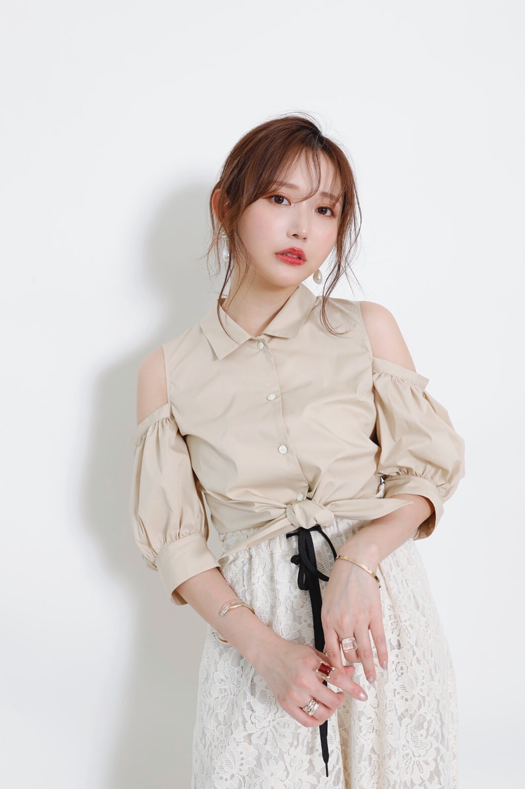 タイプライター生地に肩のあいたカットオフショルダーで、ふんわりボリュームのあるパフとコンパクトなシルエットが華奢感を演出。