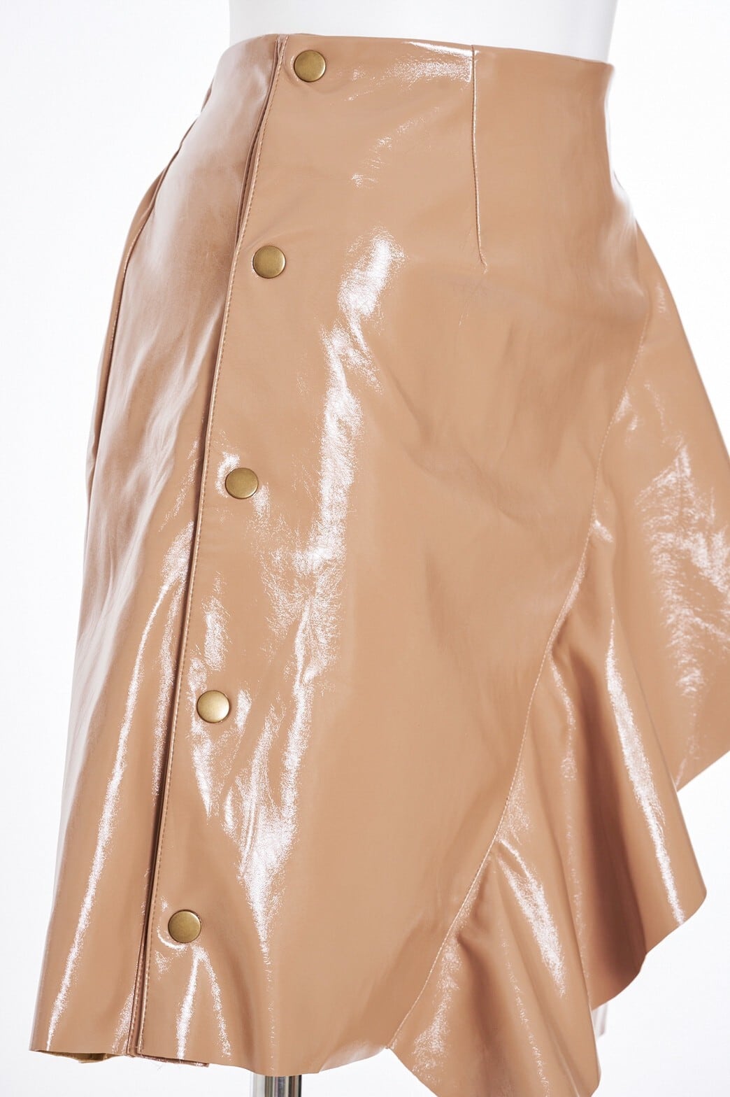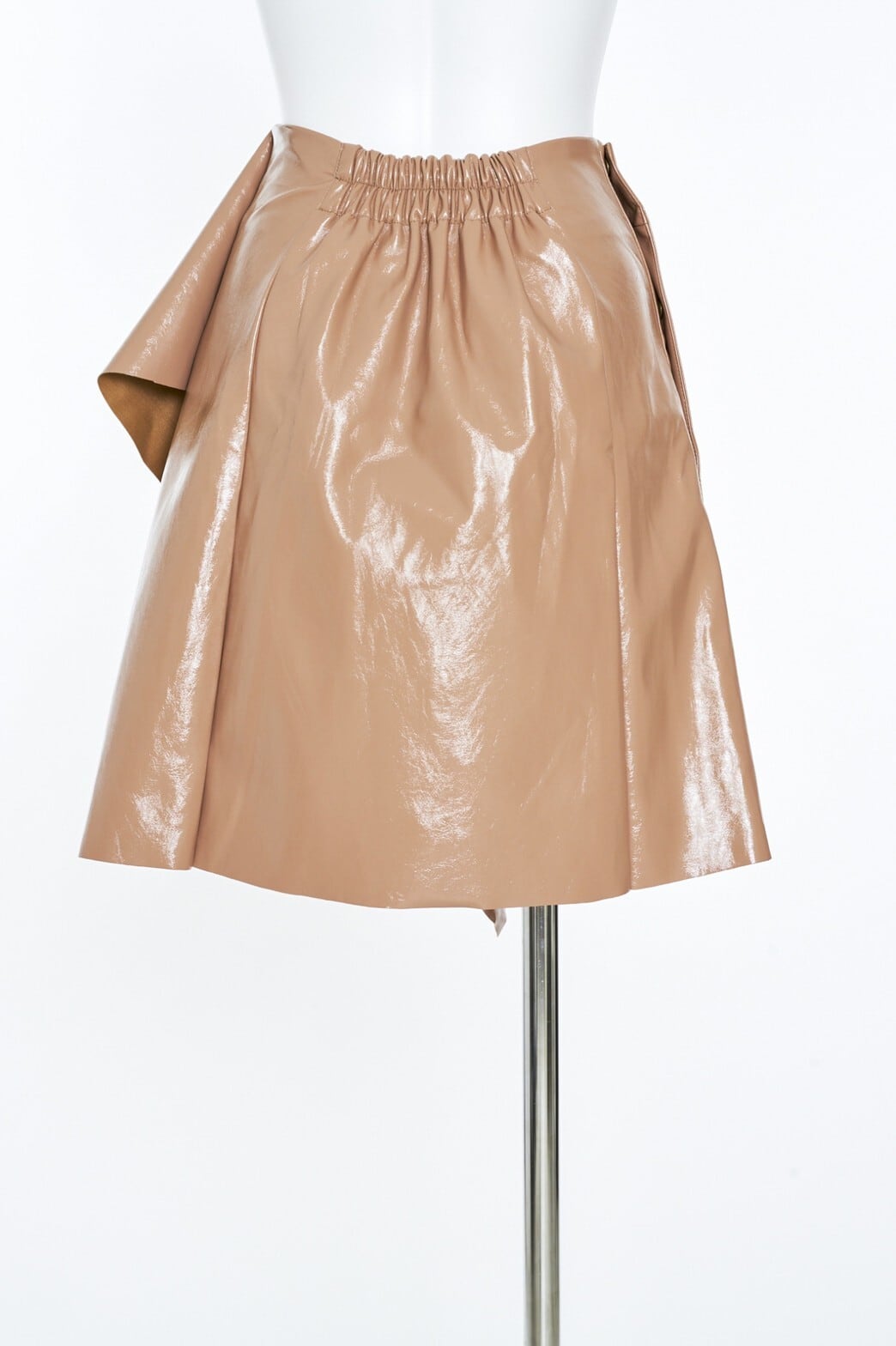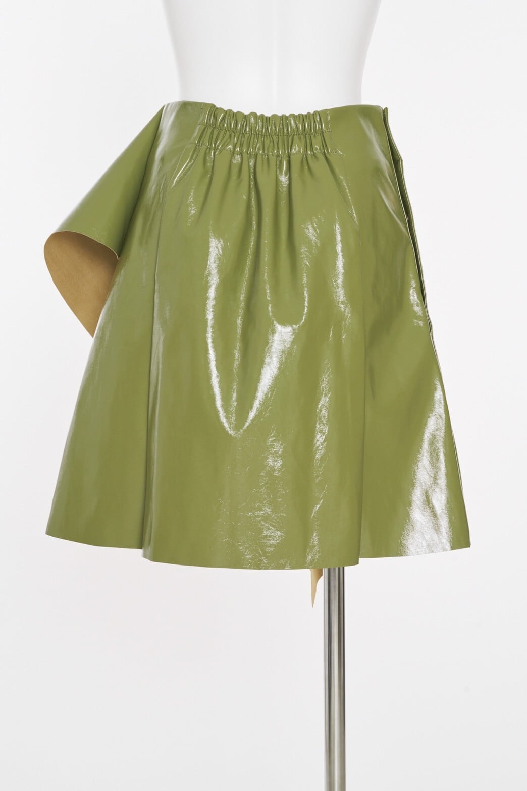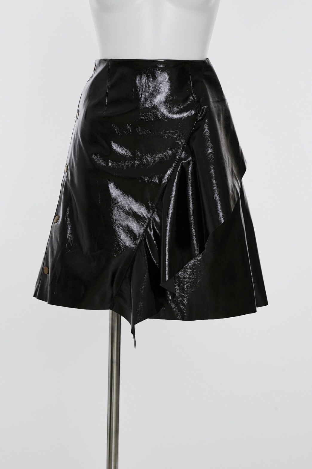 大きなフリルがポイントになった、フェティッシュなエナメル素材の台型スカート。