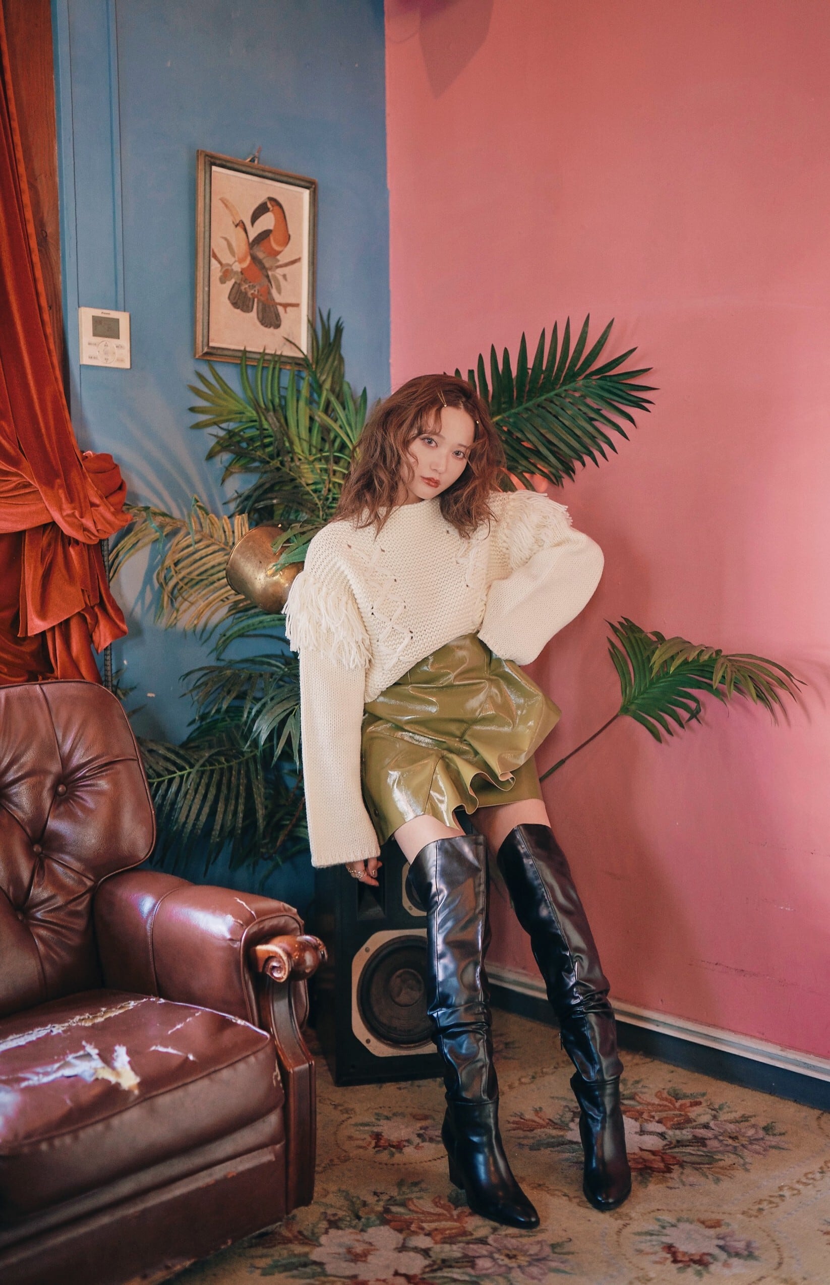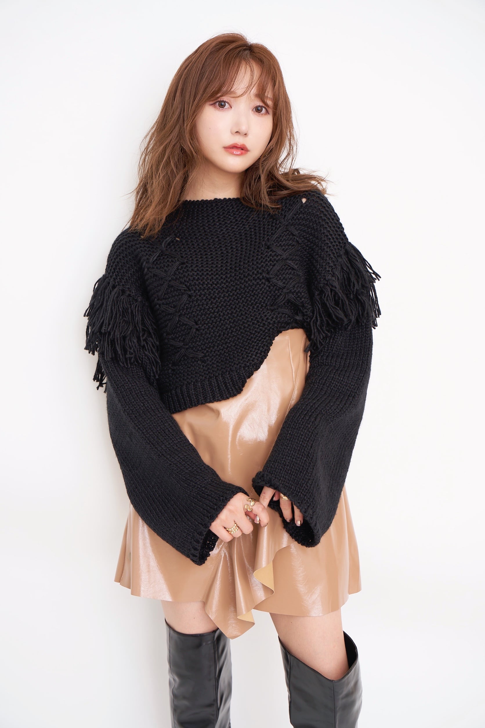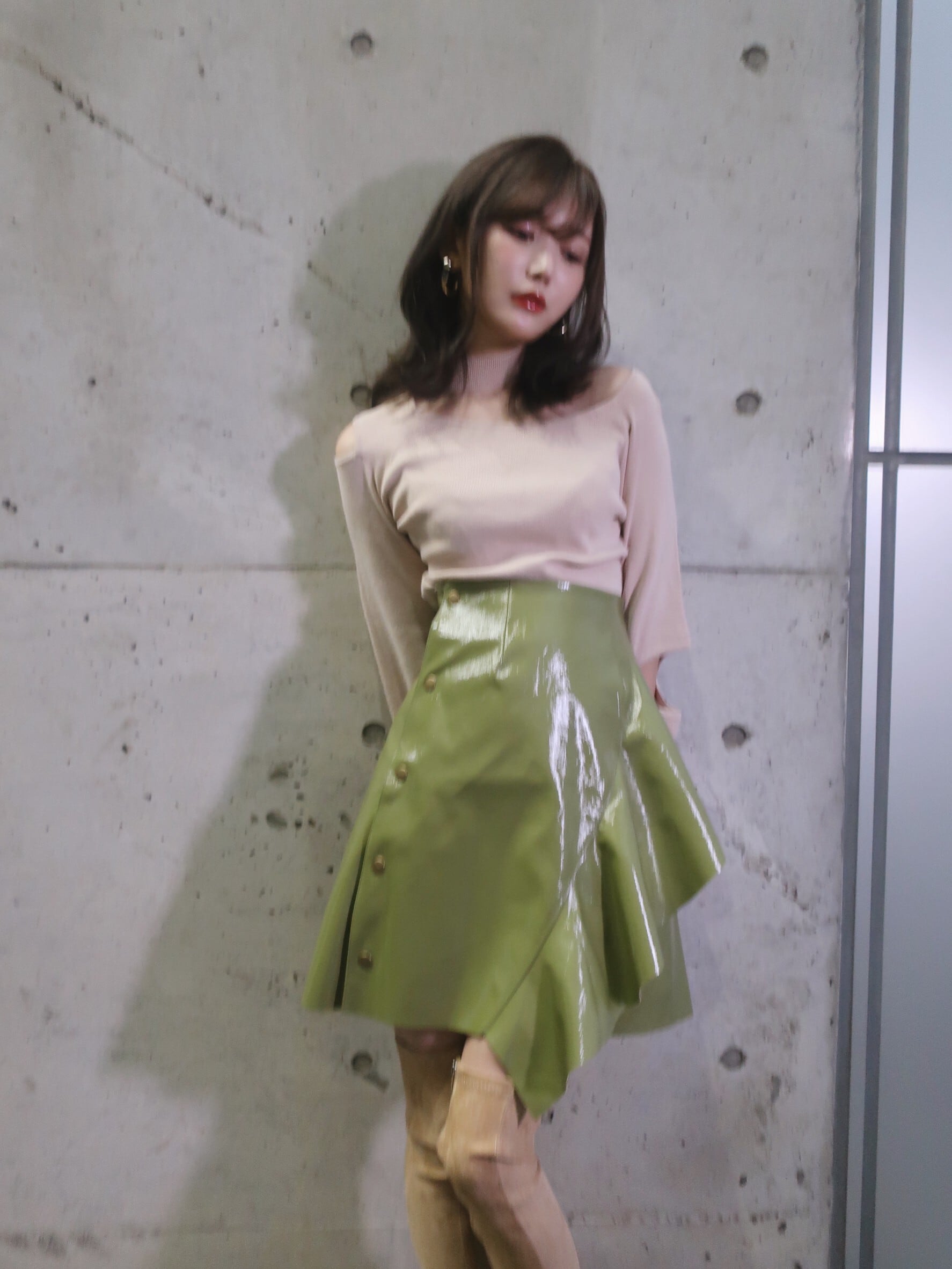 エナメルの辛さ×フリルの甘さがモードなバランスを生み、どんなトップスもトレンド感のあるコーデにまとまります。