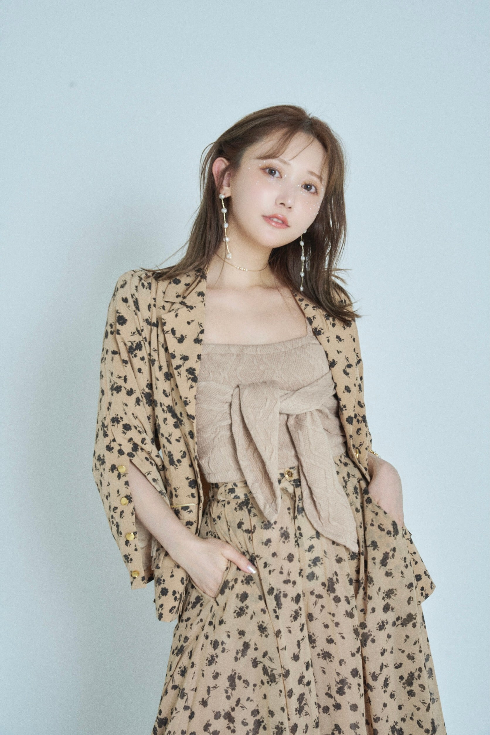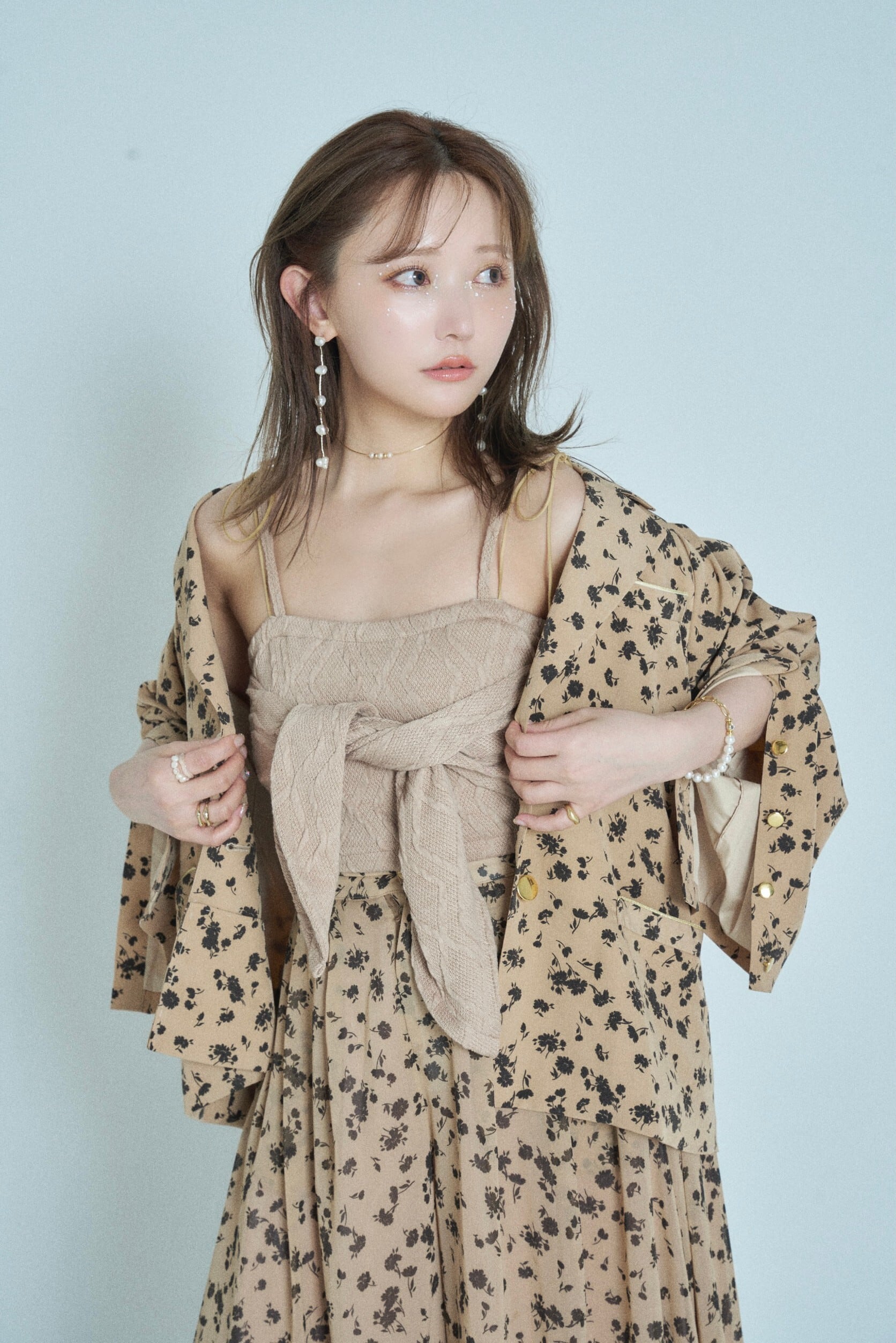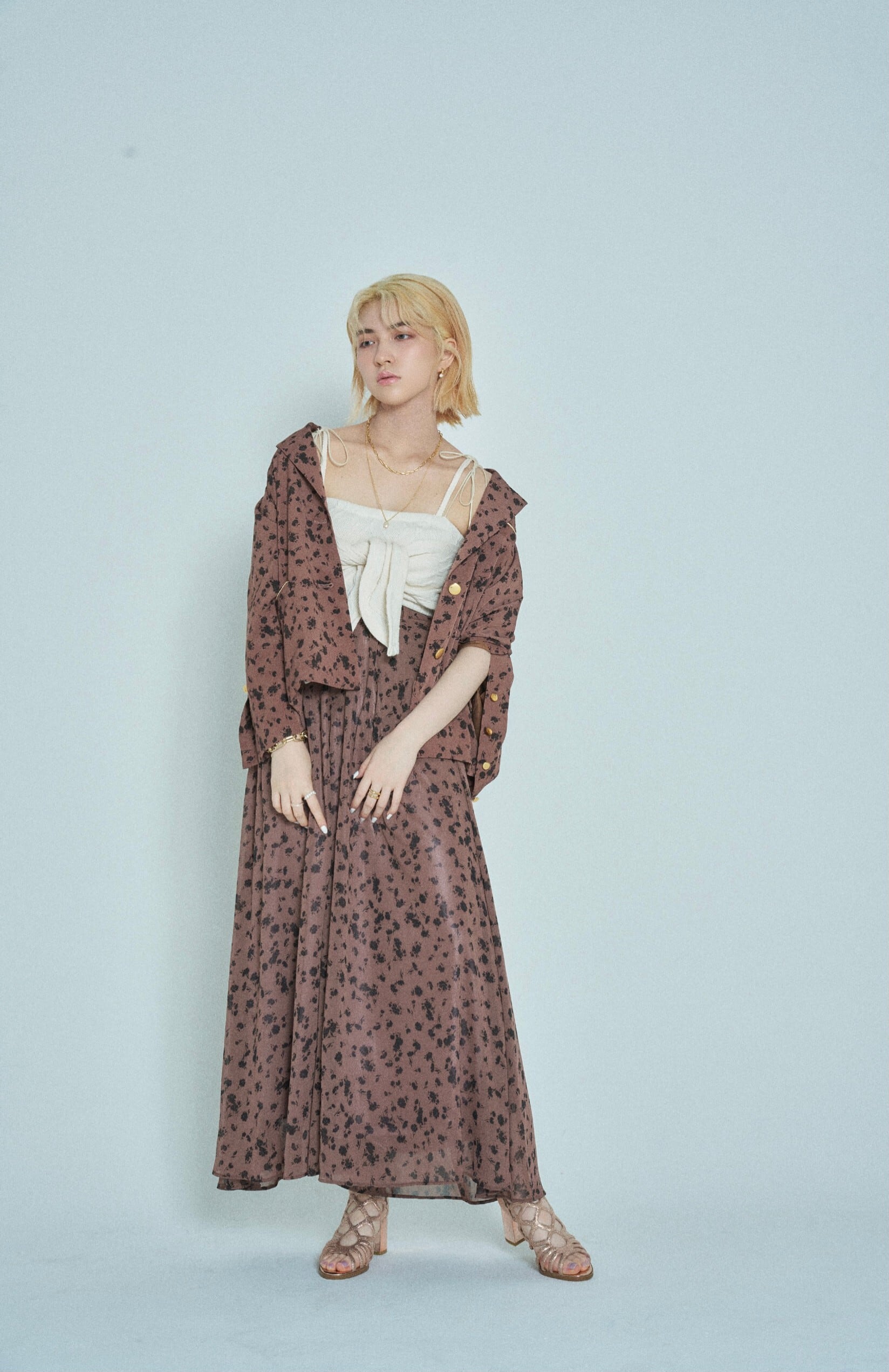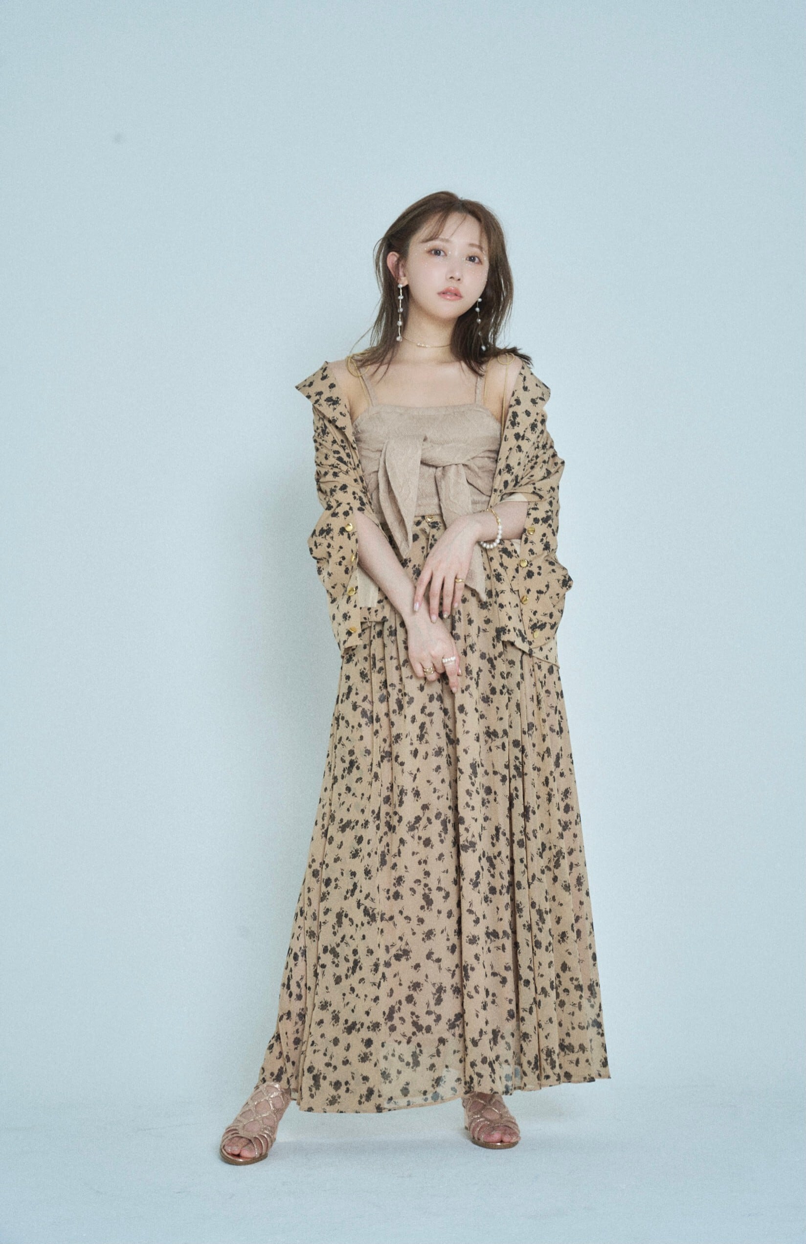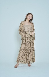 同柄シフォンを使用したペタルパンツを合わせた、セットアップスタイルが今季のおすすめ。