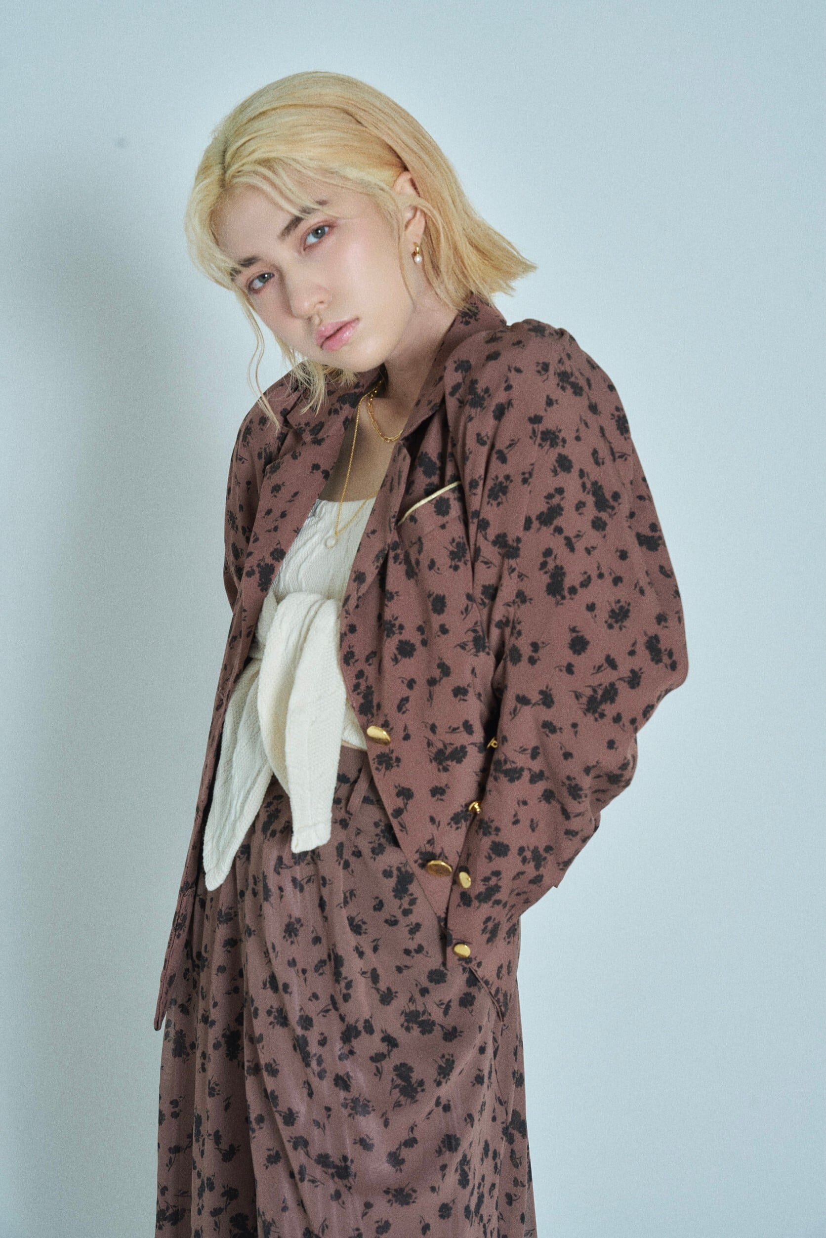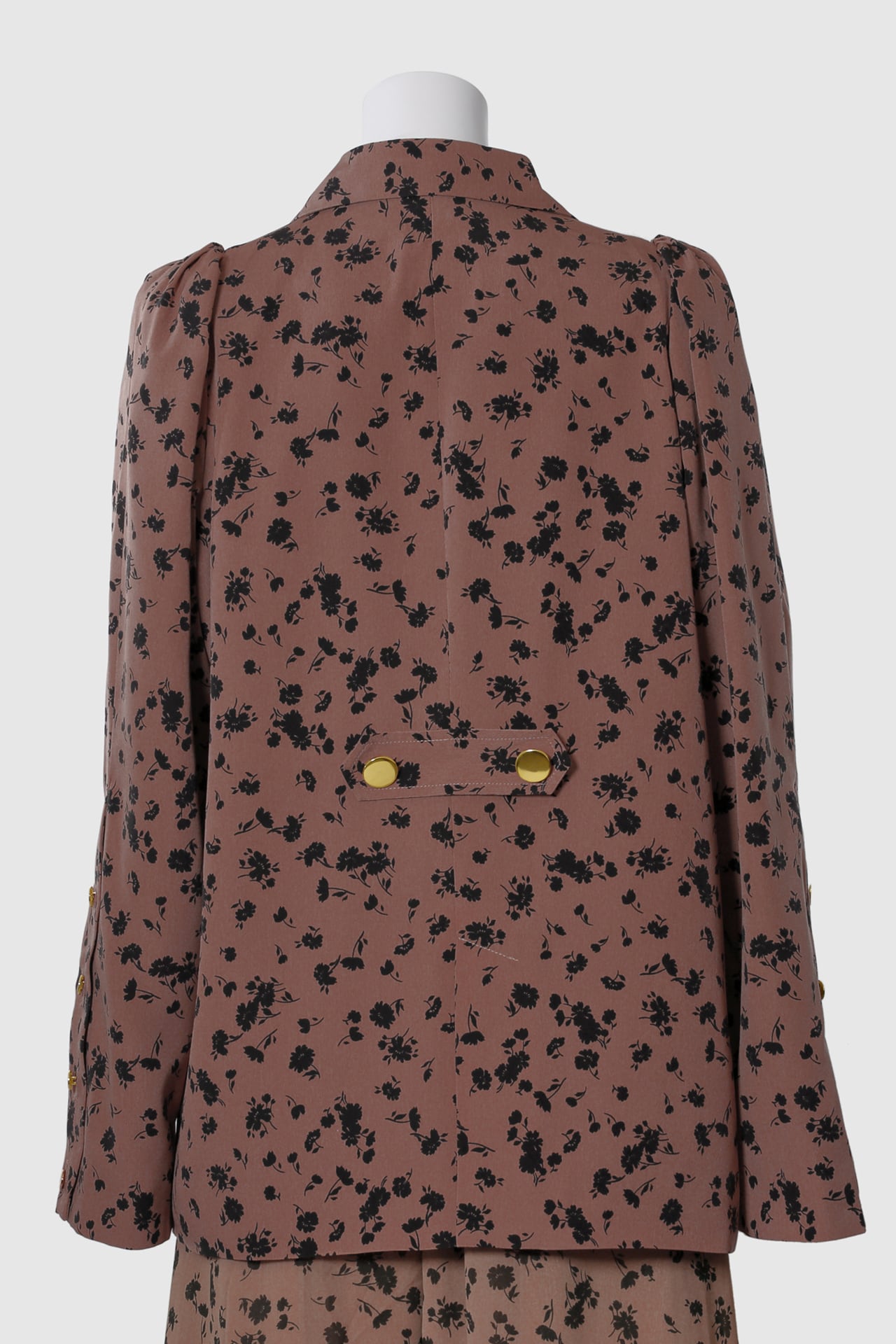 花影舞うジャケットは、袖の4連ボタンを外せばスリットスリーブになり、腕周りをすっきり魅せて着こなしに鮮度をもたらします。
