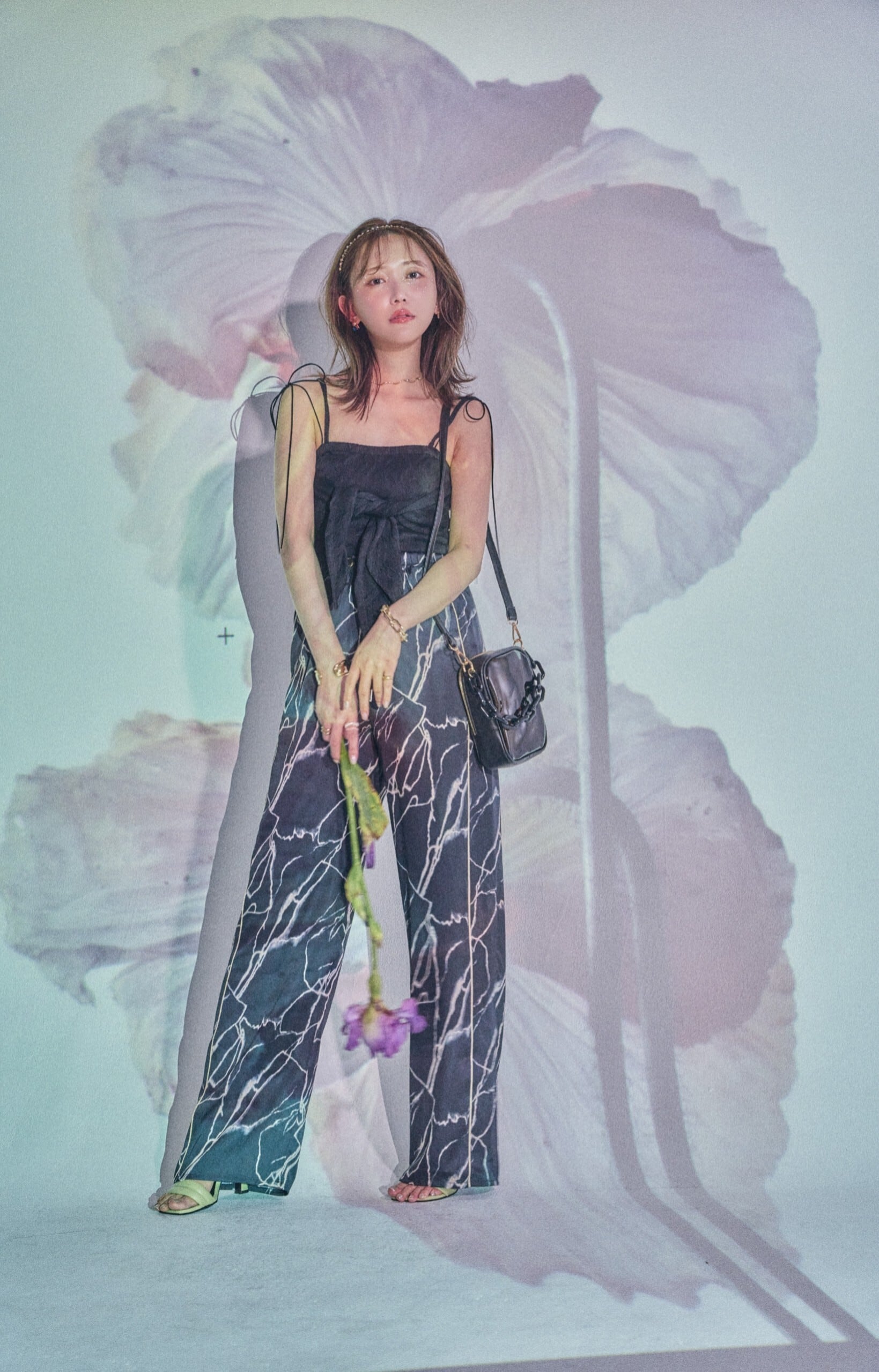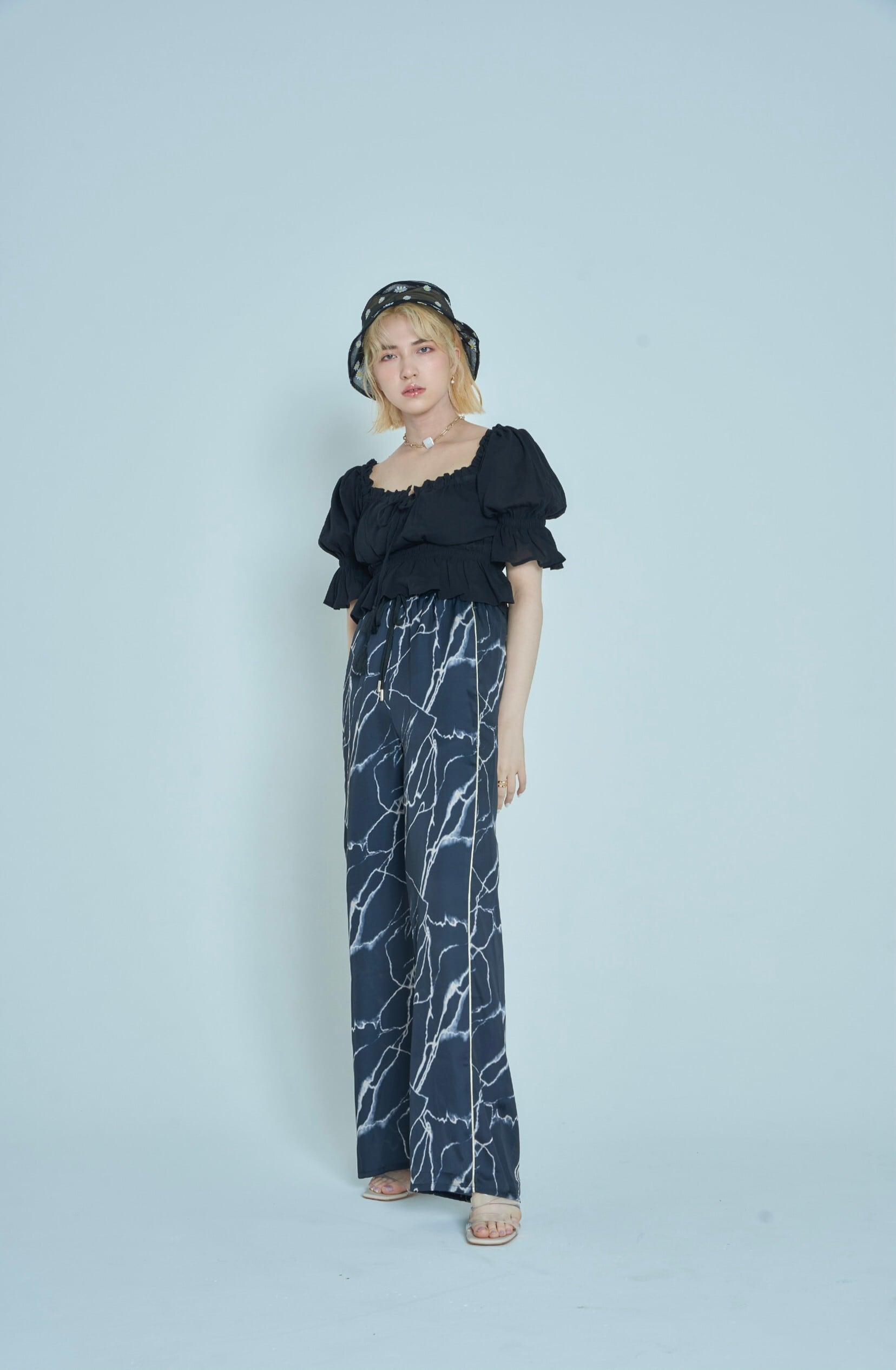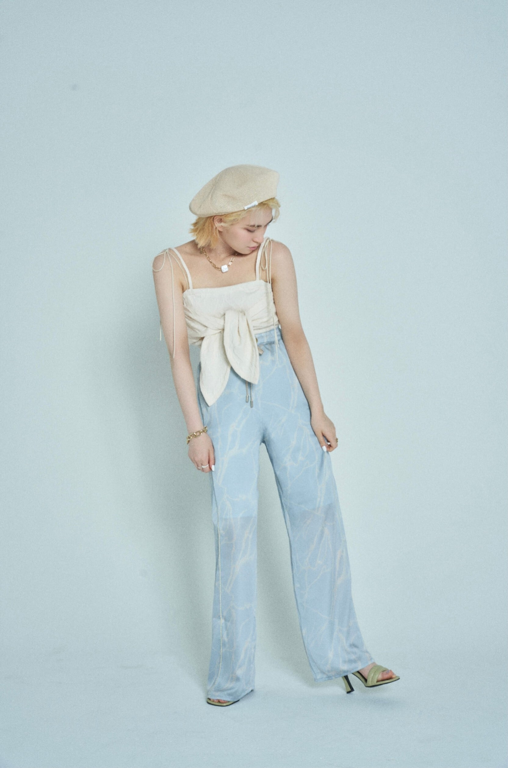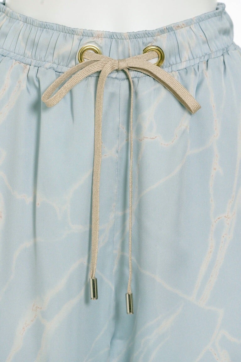 アンニュイな存在感と上品な高級感を与えるアイレットリボンパンツ。