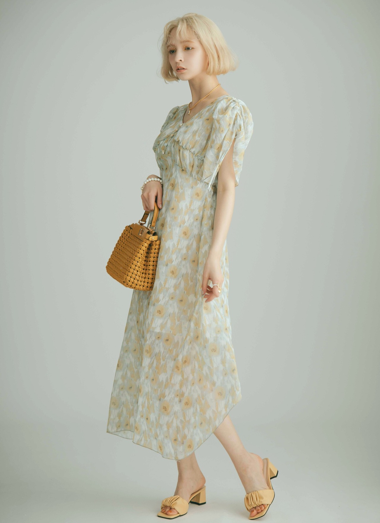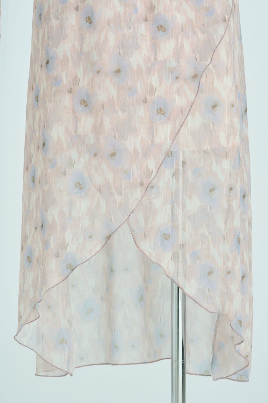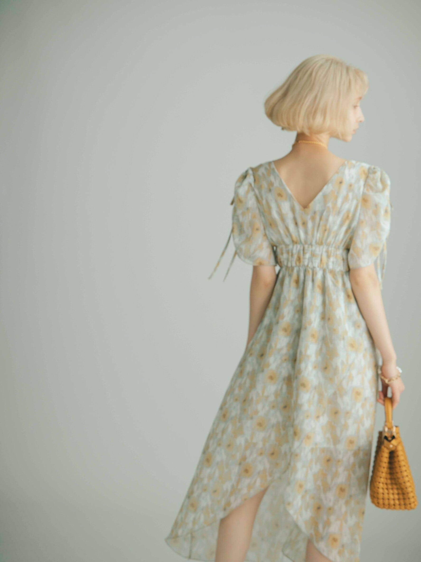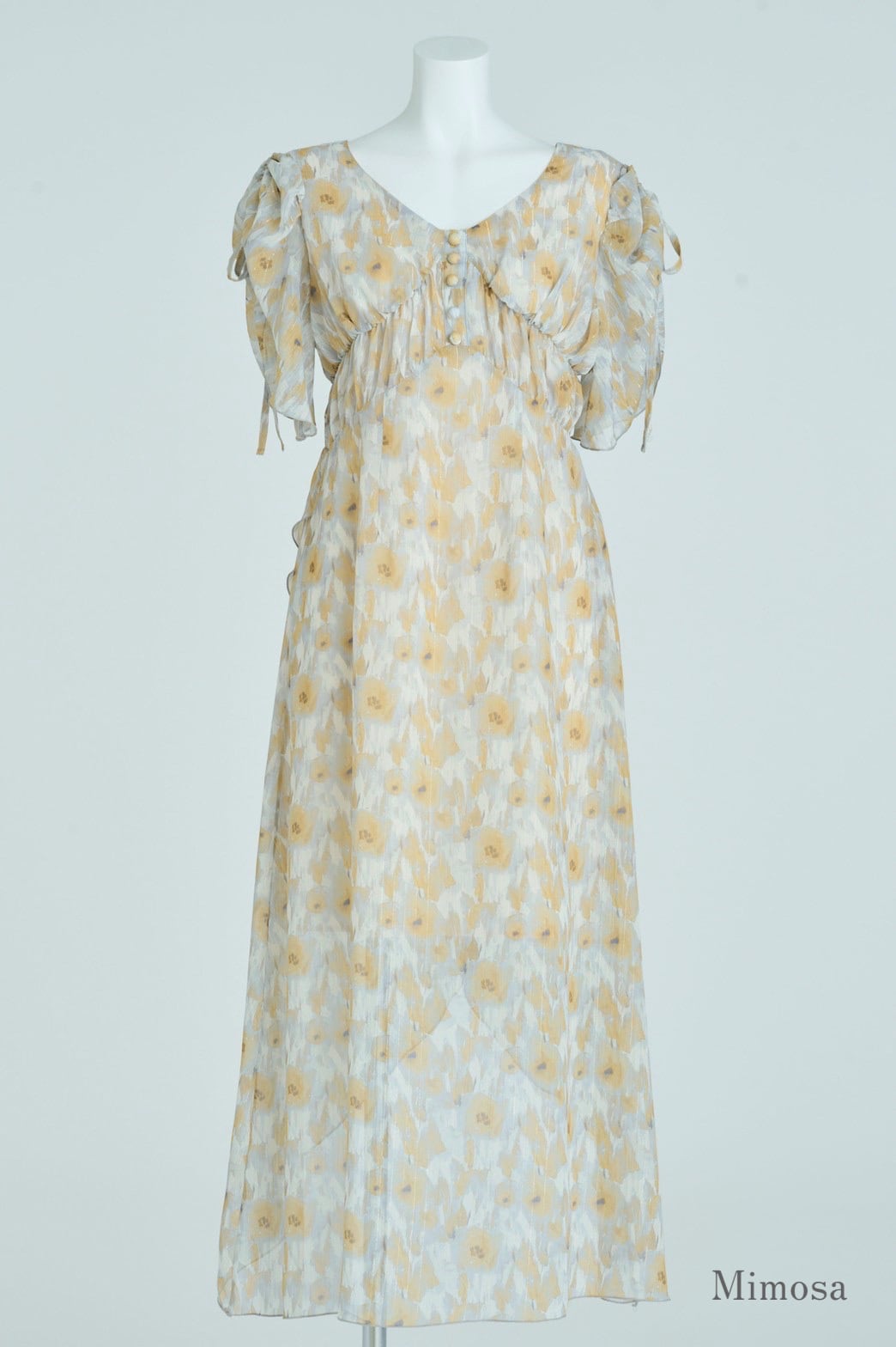 水彩画を落とし込んだ抽象花柄が、アンニュイで儚げなムードを纏う楊柳シフォンドレス。