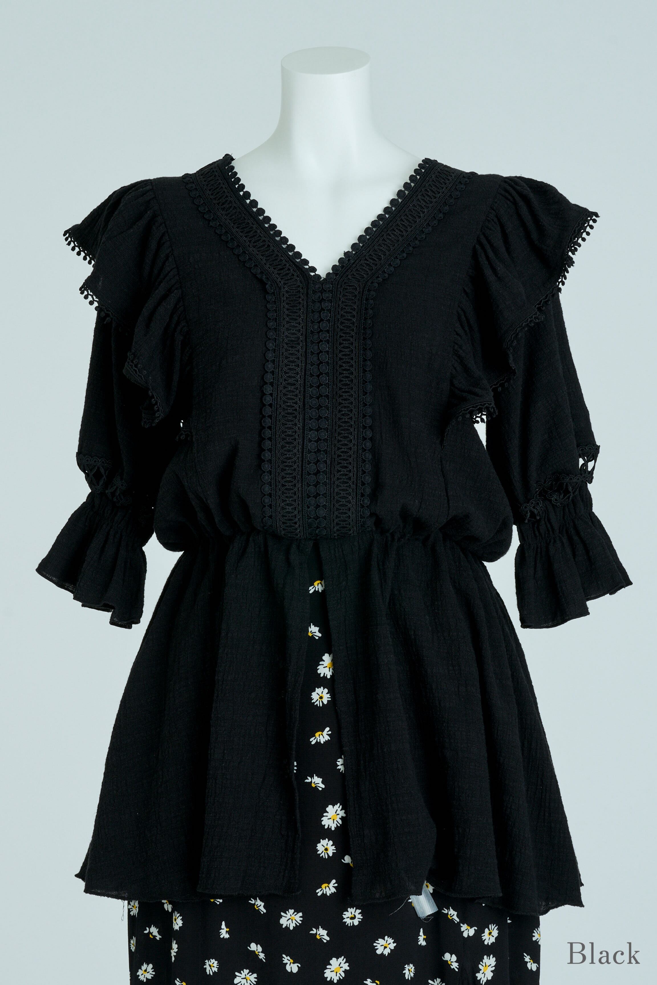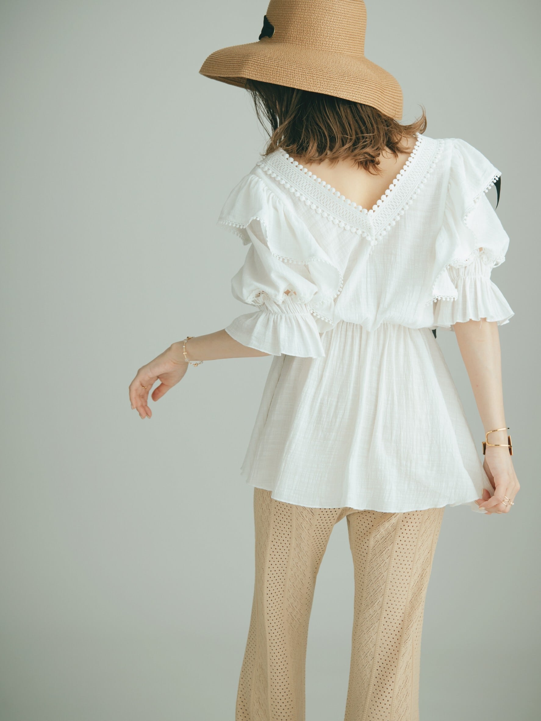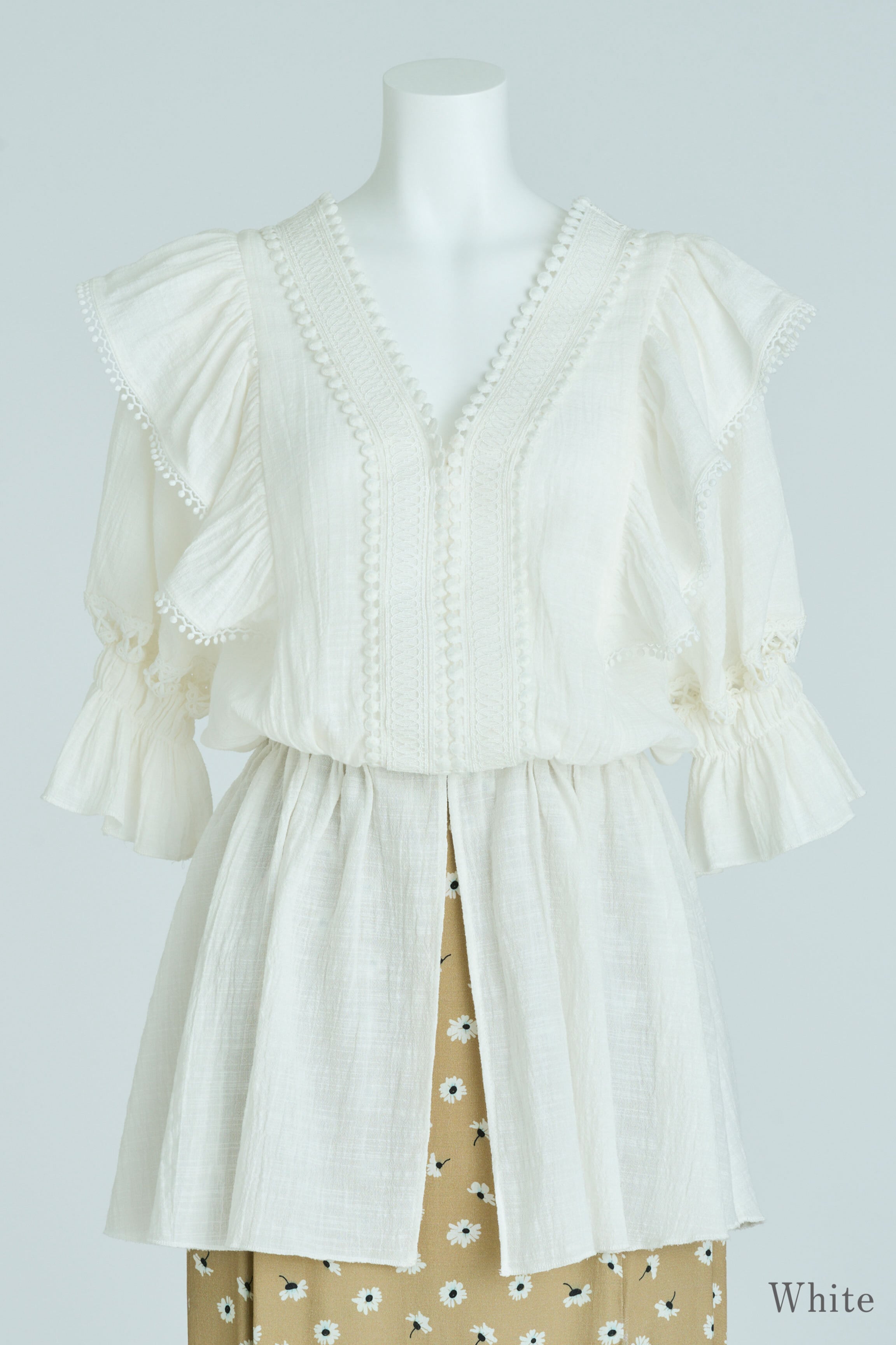 たっぷりと施した繊細なはしごレースのブラウスは、ヴィンテージのブラウスのような手の込んだデザイン。