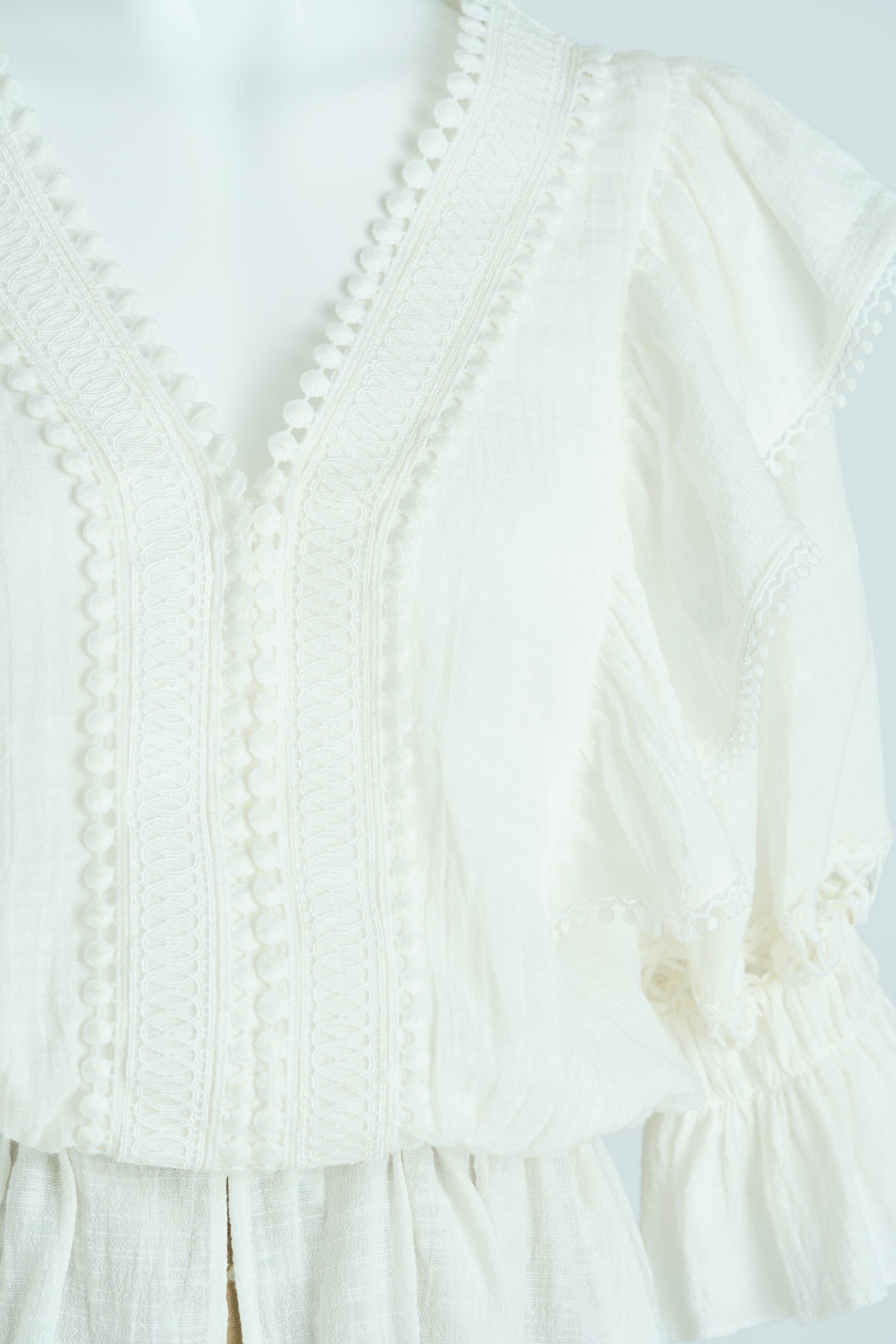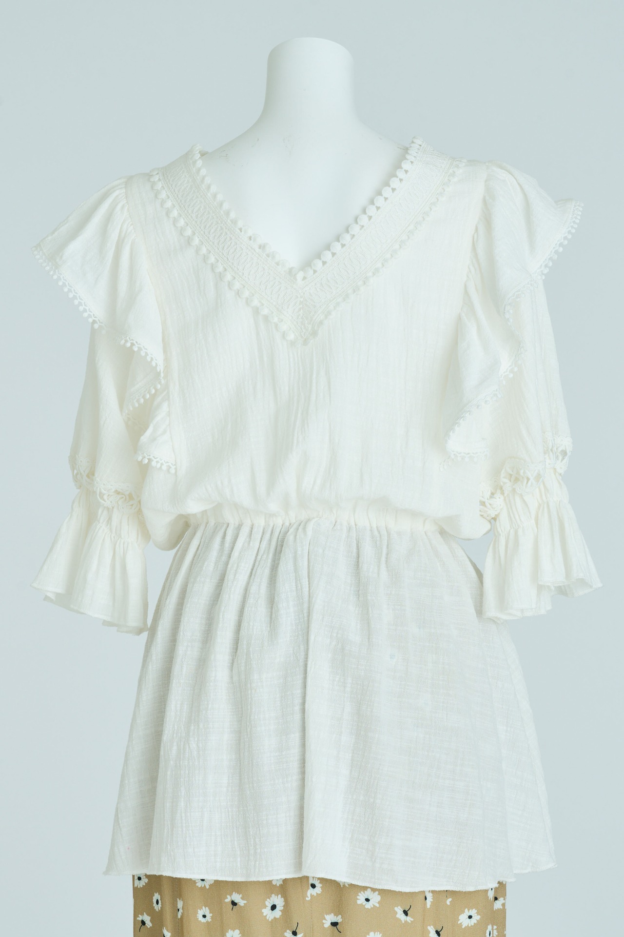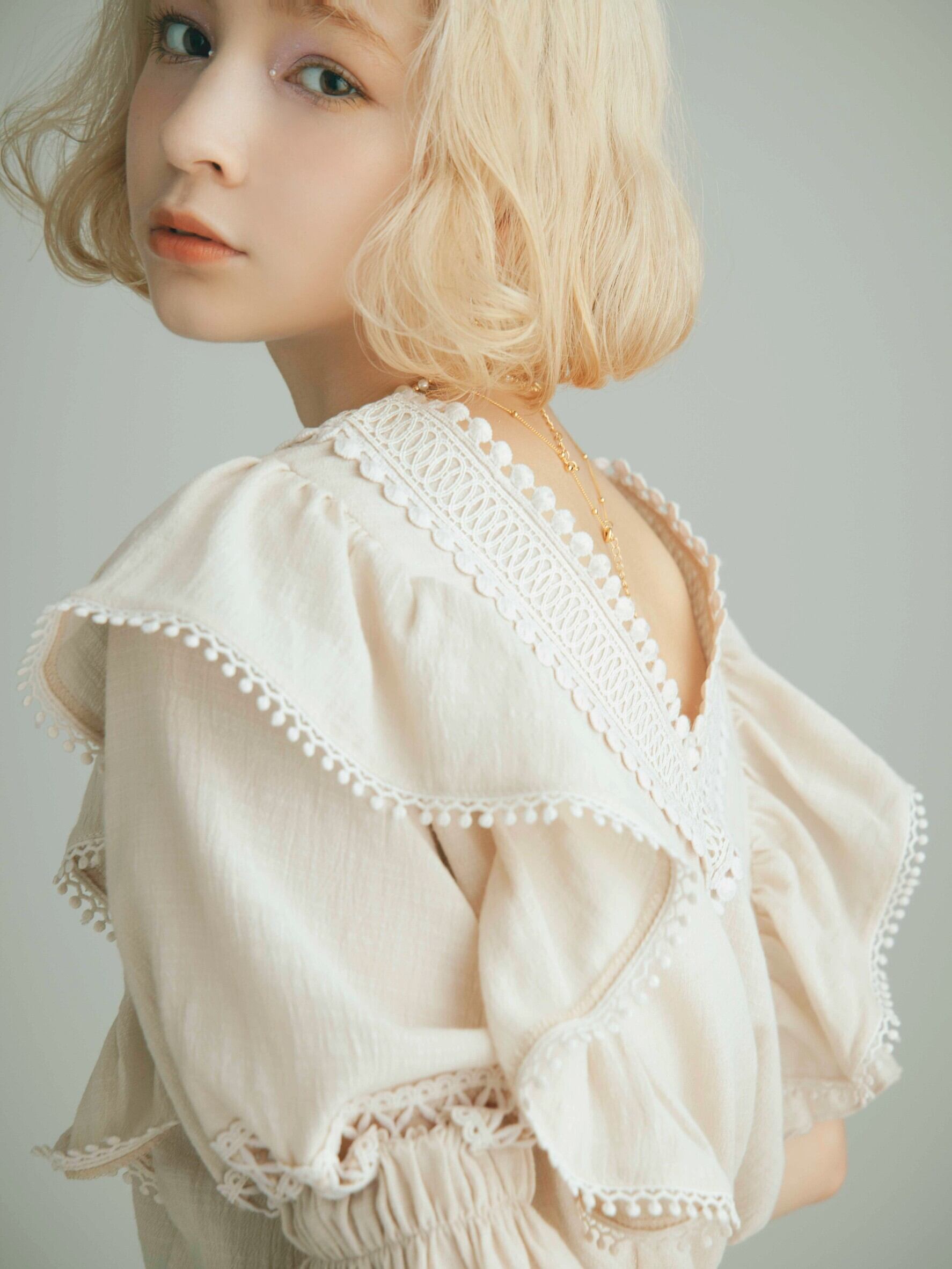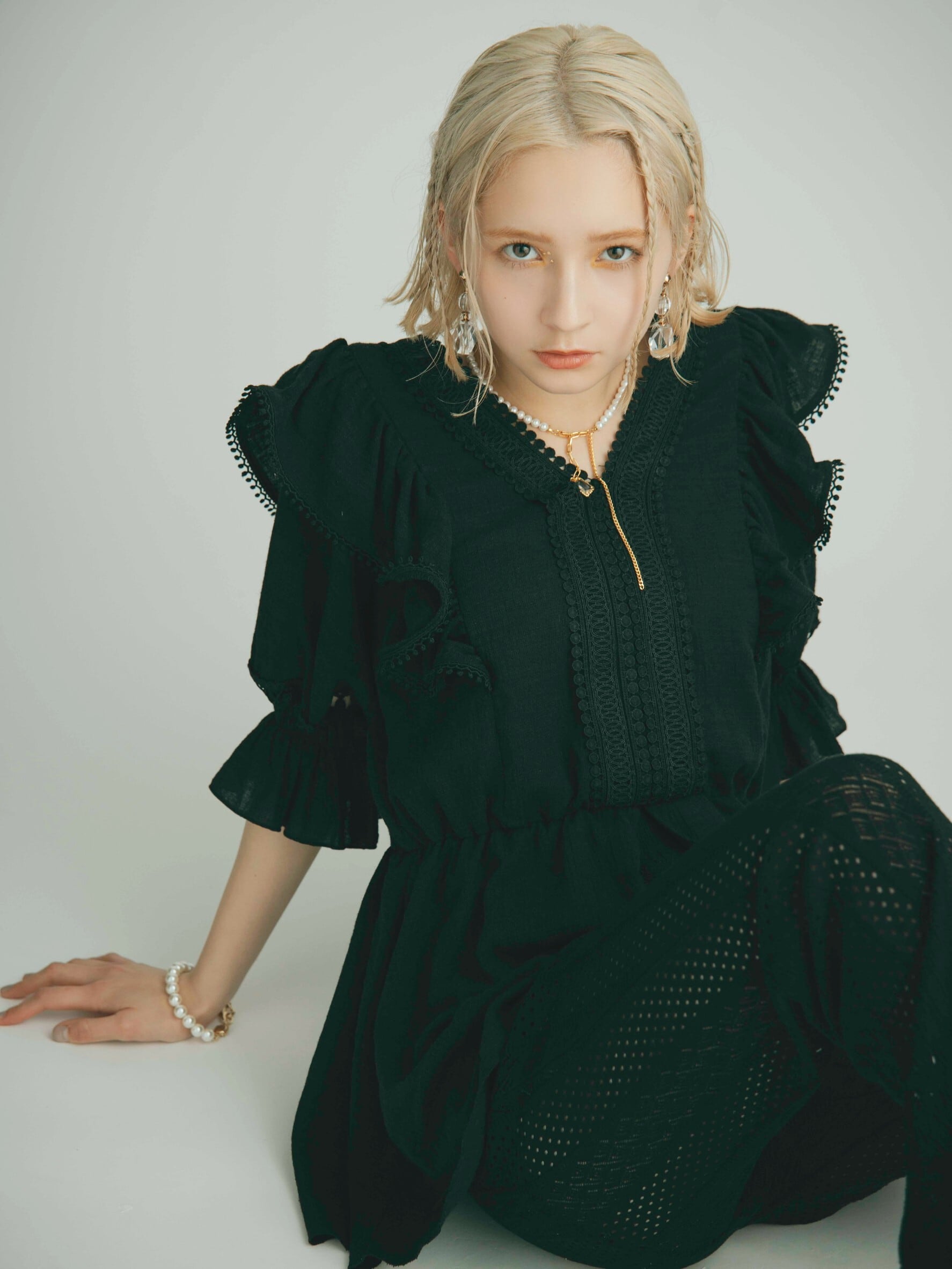 アクセントとなるショルダーのラッフルフリルにはポンポンレースを施し、