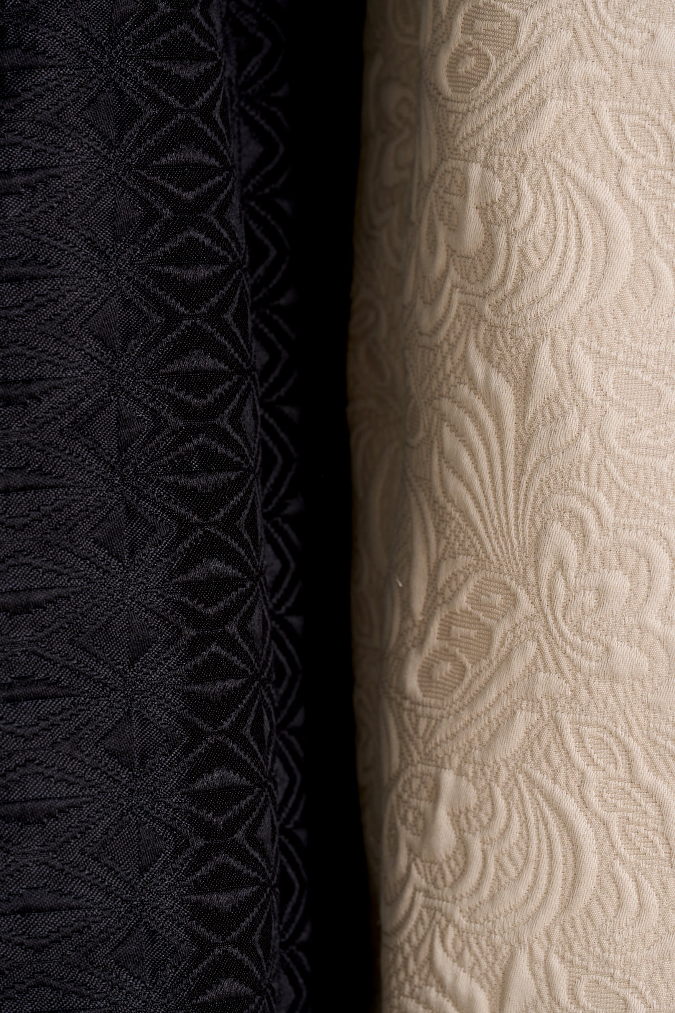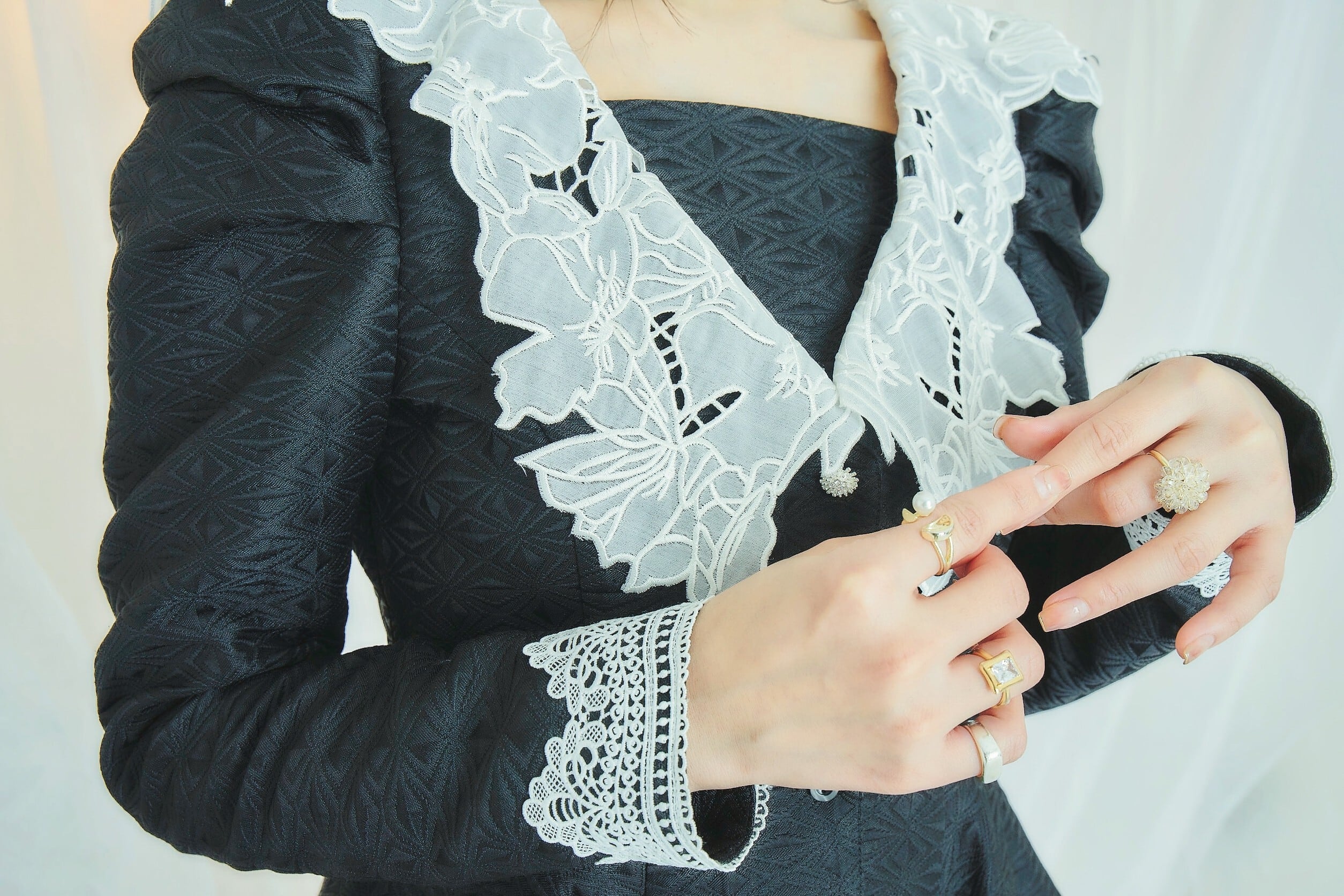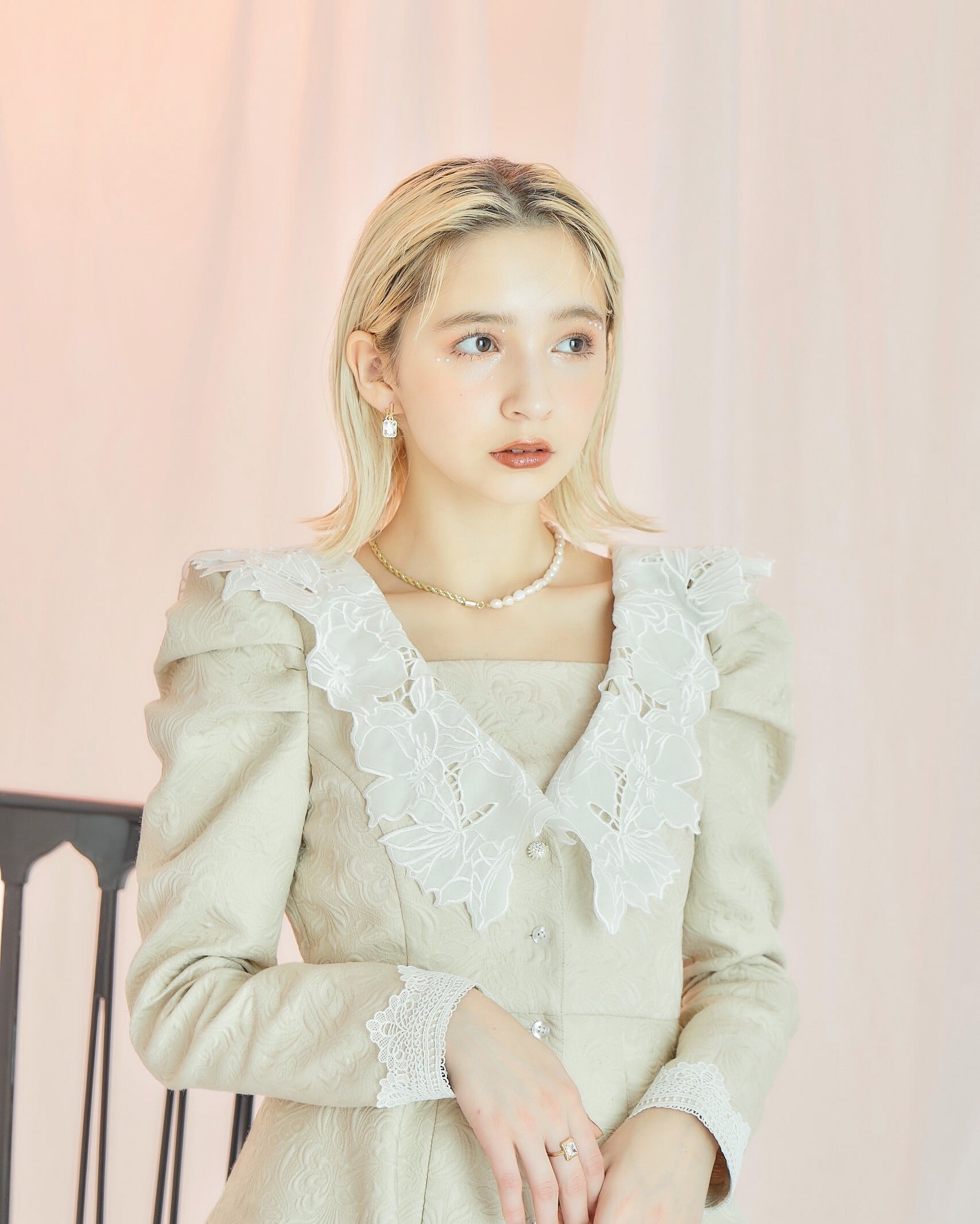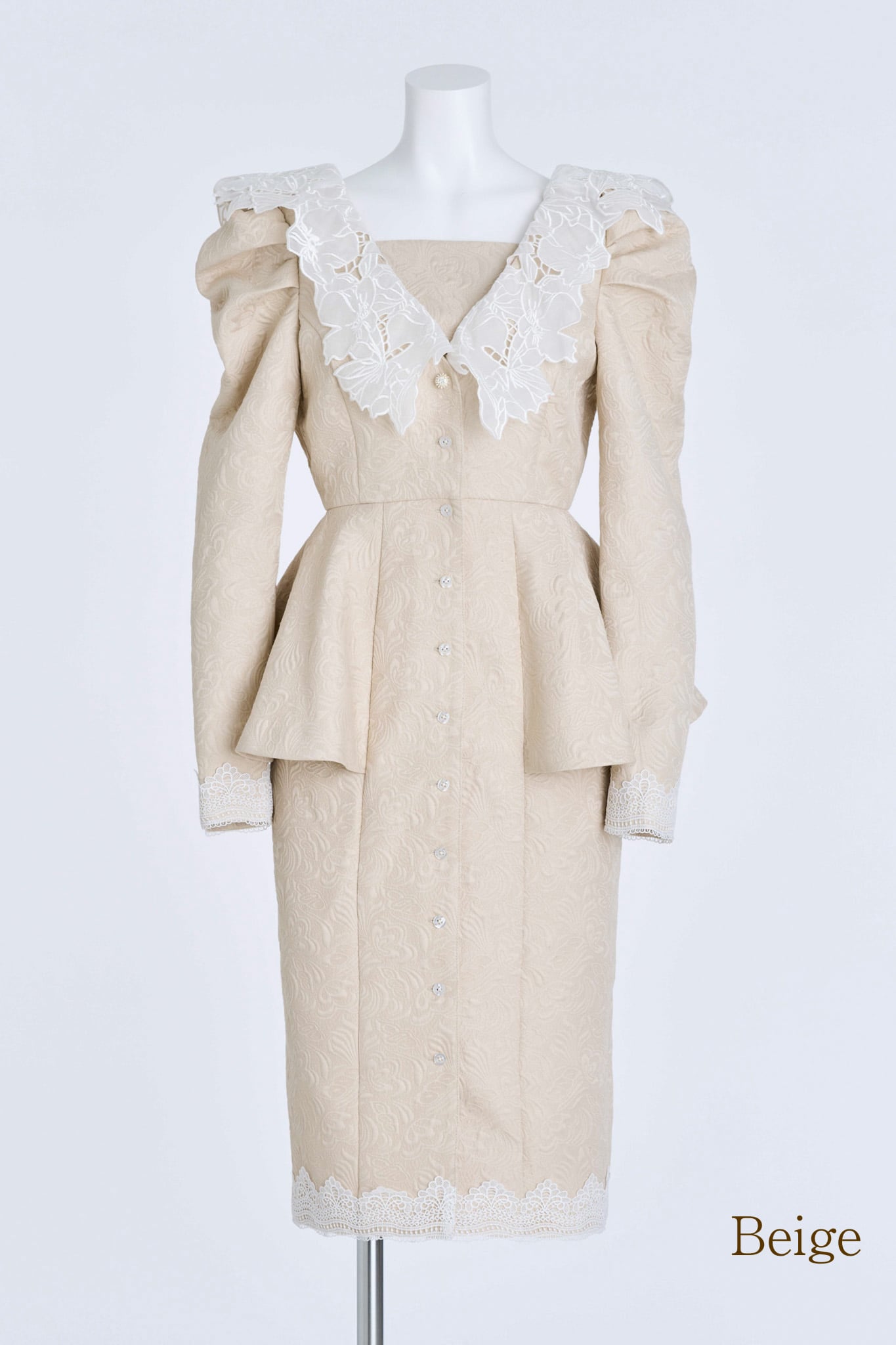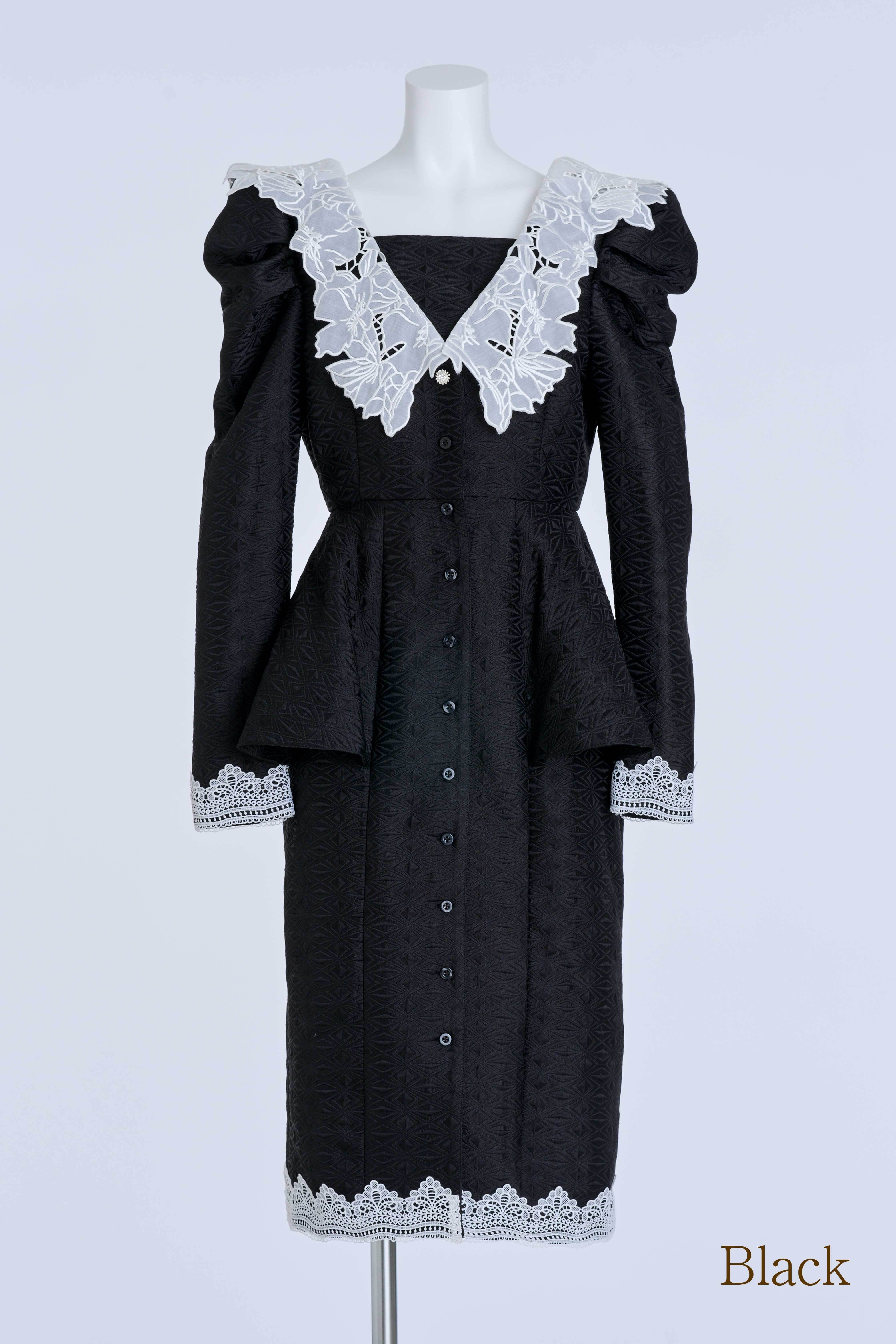 繊細なカットレース襟が目を惹く、しっかりとしたジャガード素材を使用したクラシカルな雰囲気のドレス。