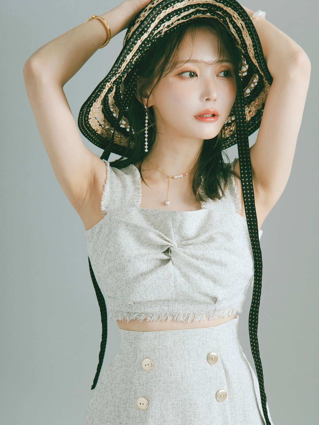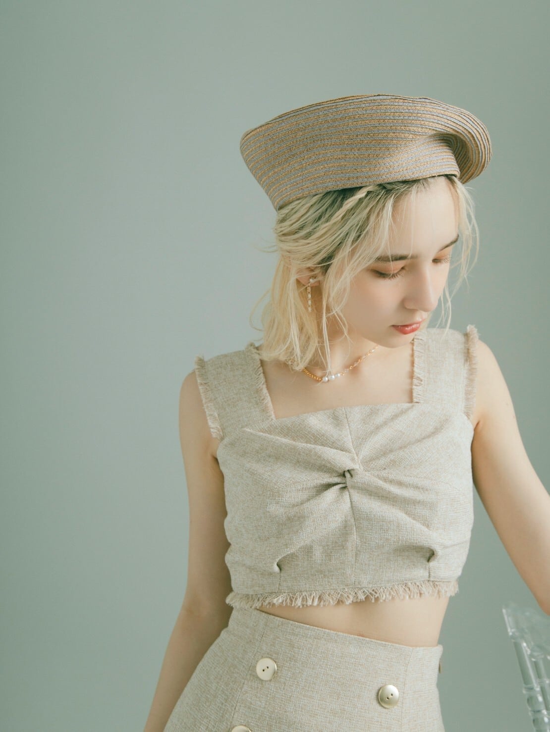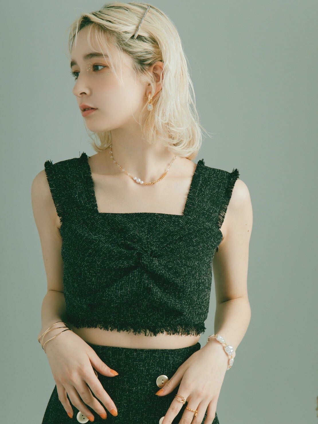 ビスチェはフロントのツイストが立体感とアクセントを生み、肩紐や裾に施したフリンジが程よいカジュアルさをプラス。