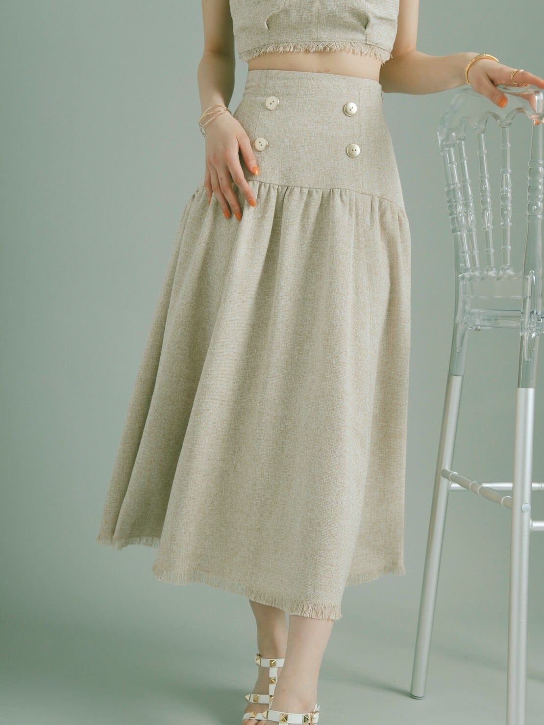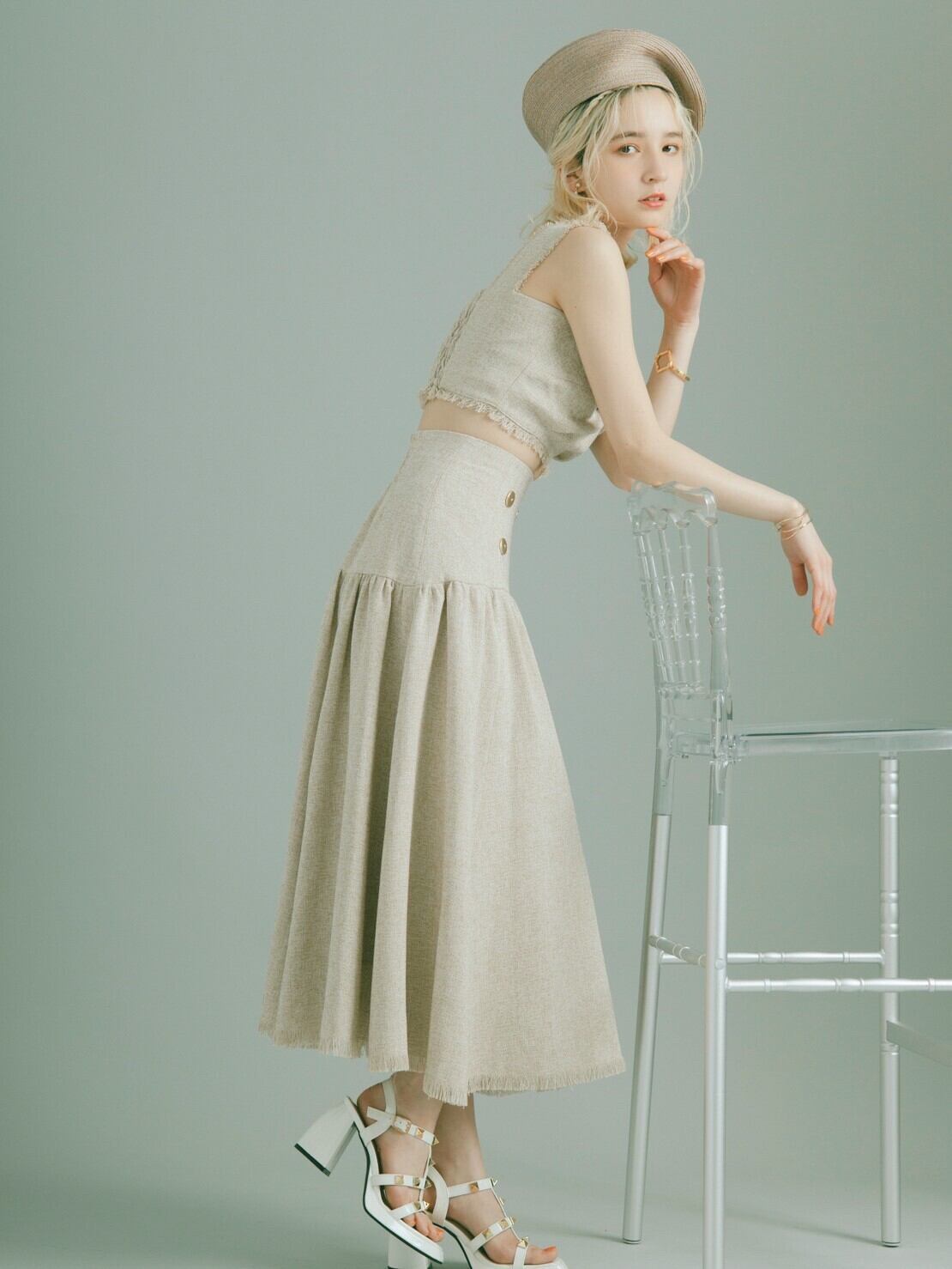 スカートのフロントには存在感のあるゴールドボタンを配し、夏らしいマリンテイストなアクセントを。