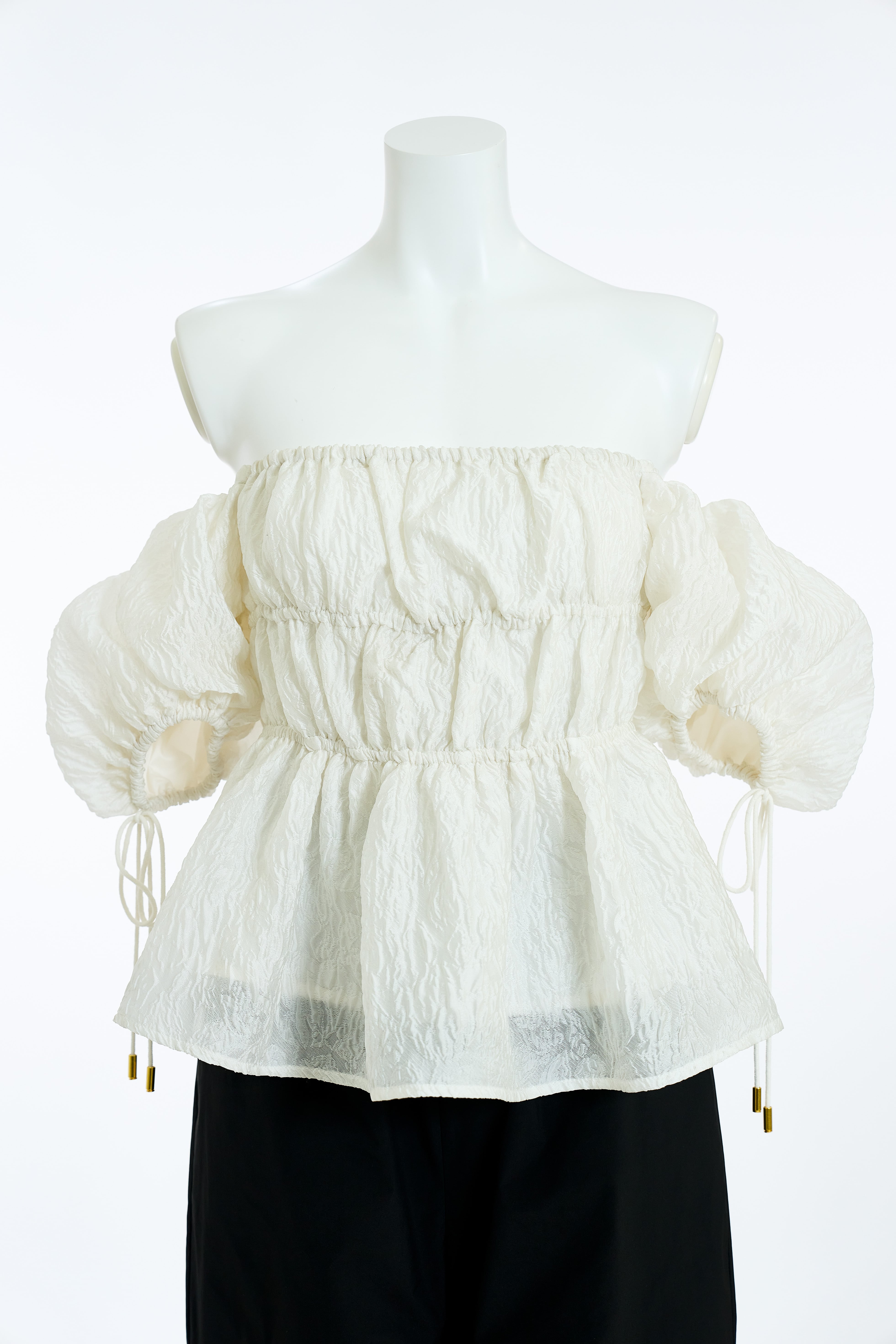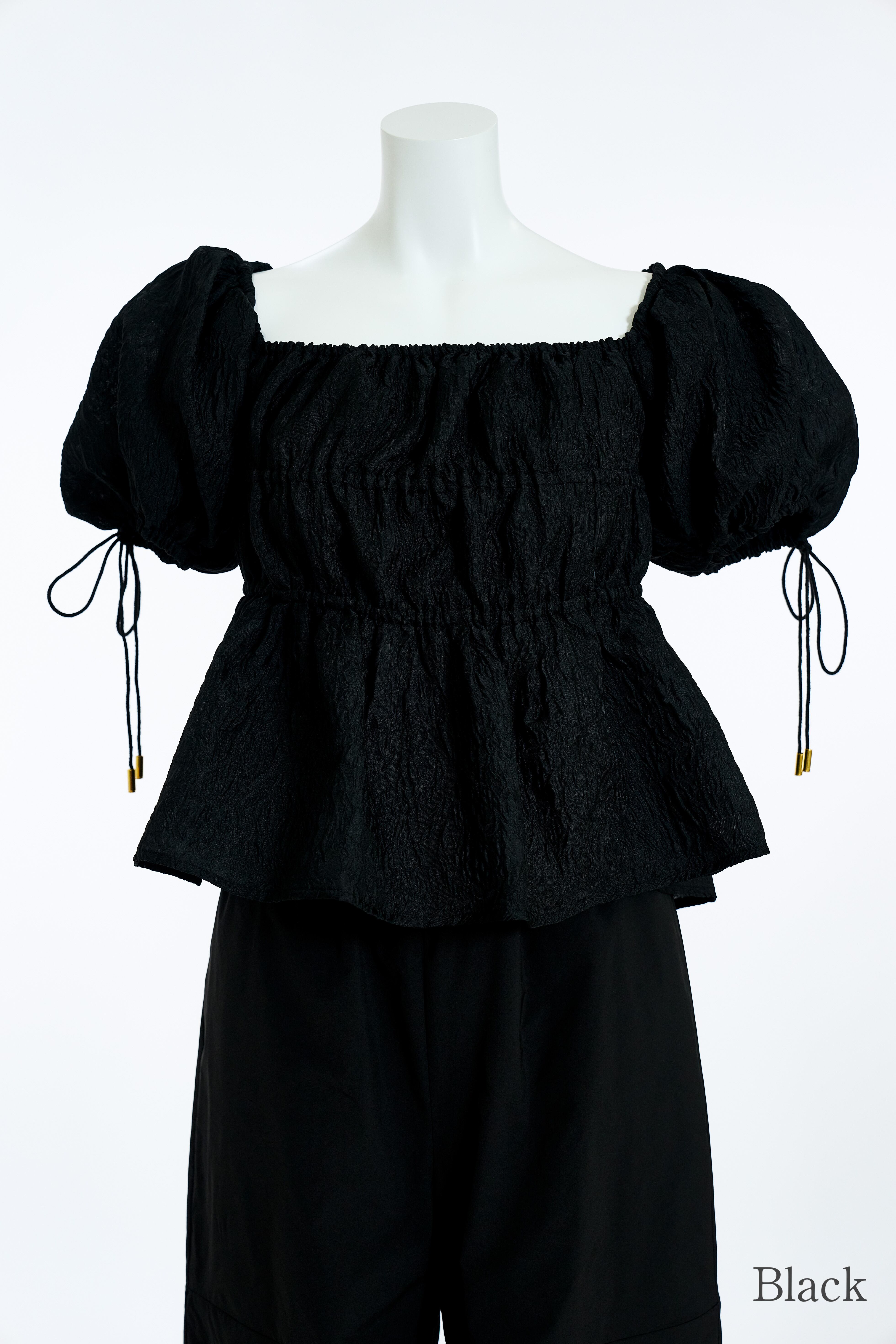 品のあるボリュームスリーブと女性らしいペプラムシルエットがポイントのジャガードブラウス。