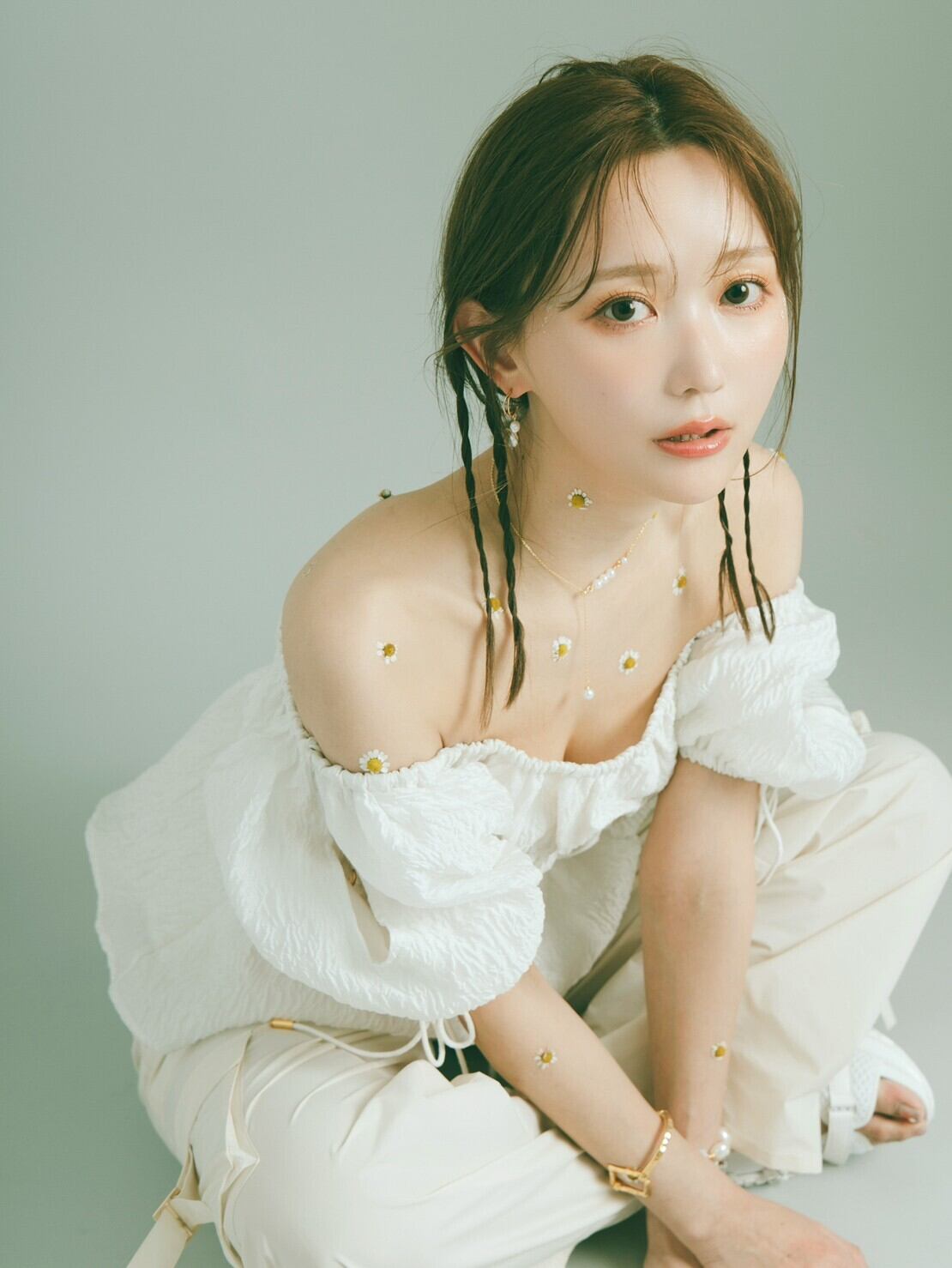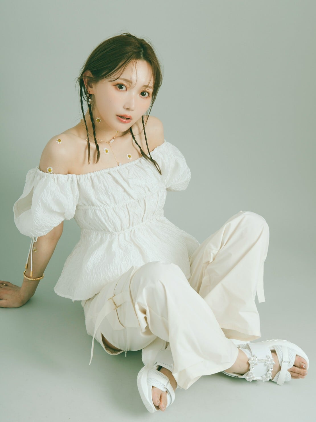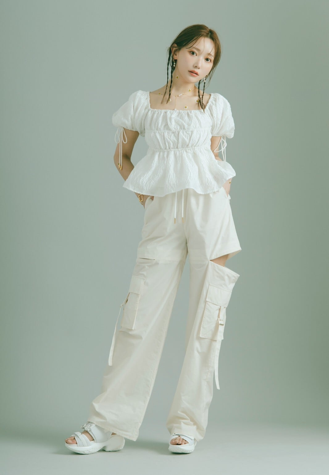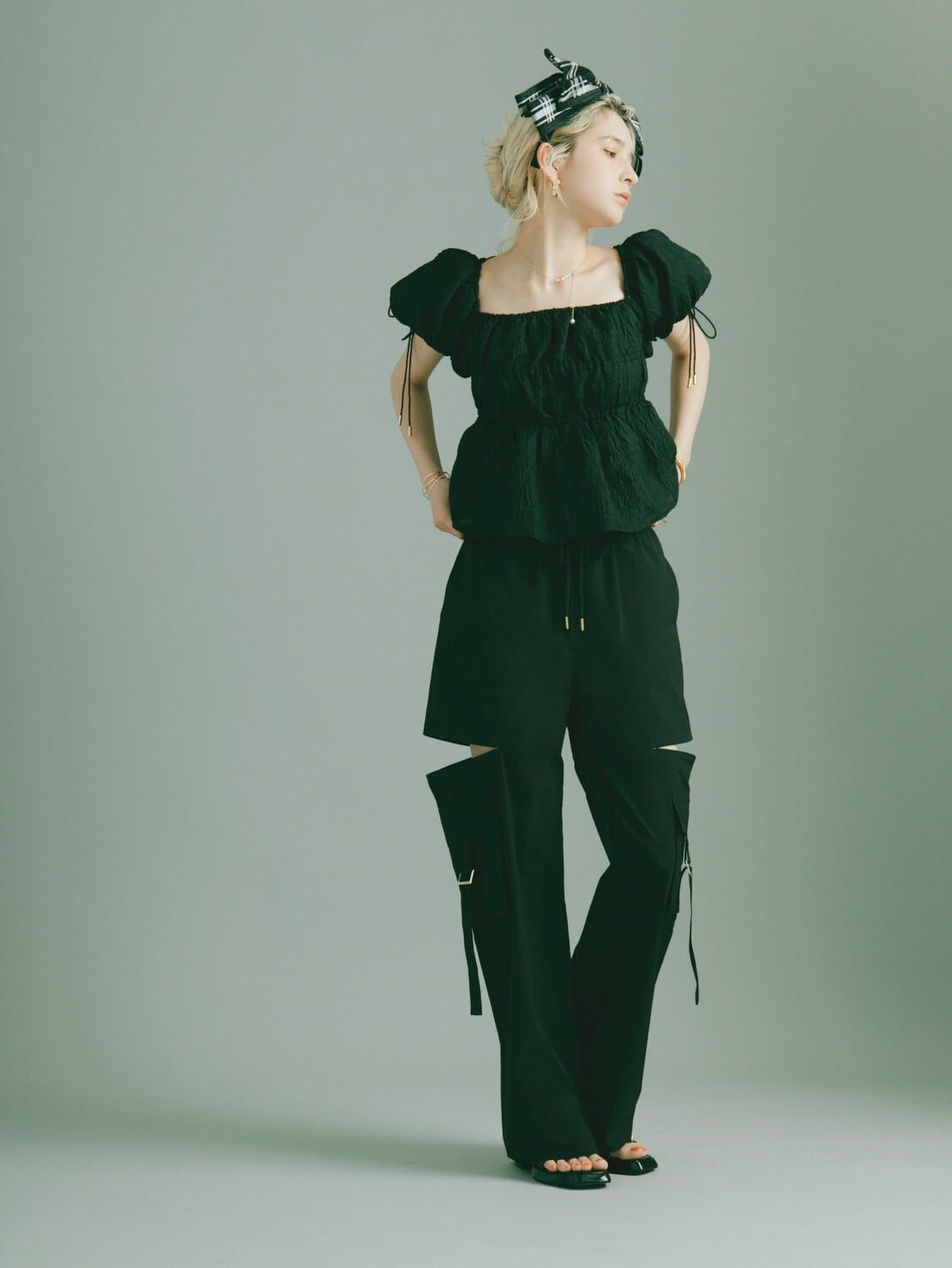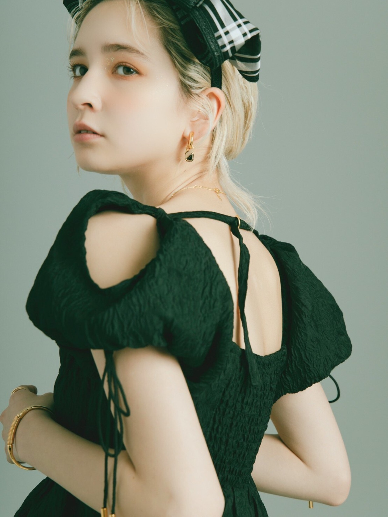 ボリュームスリーブにはスリットを入れ程よい肌見せで抜け感を、バックスタイルには華奢なベルトを施し、フェティッシュな印象をプラス。