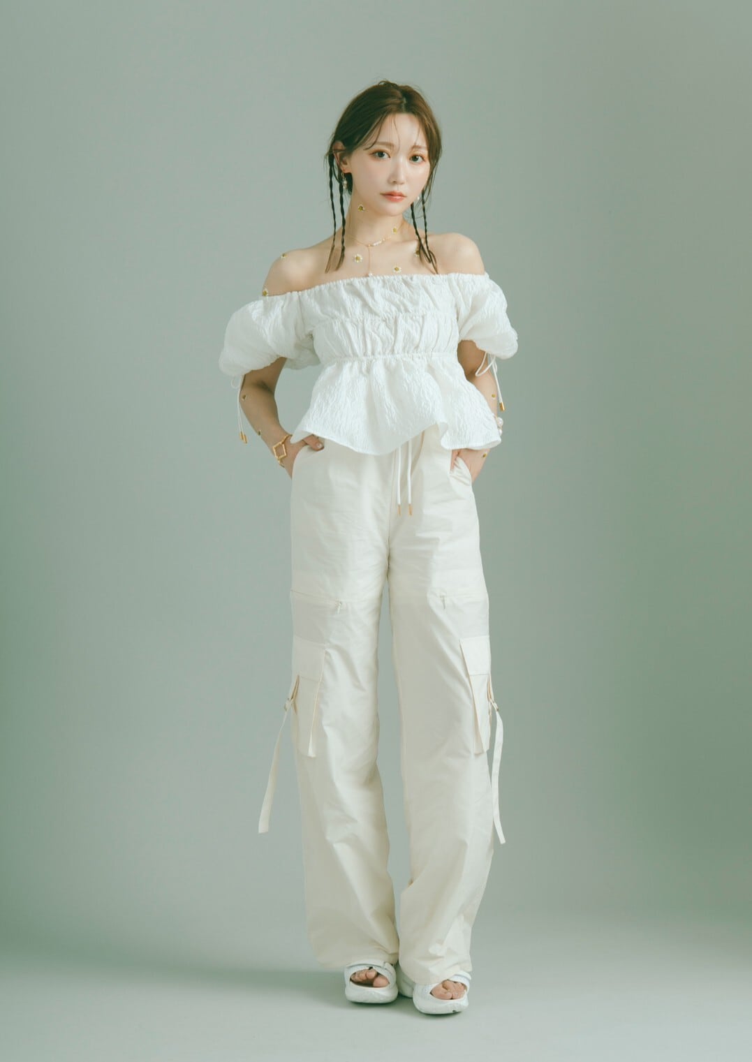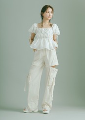 フレアに広がるペプラムシルエットなので、カーゴパンツやマーメイドスカート、デニムなどすっきりとしたボトムスとの合わせがおすすめです。