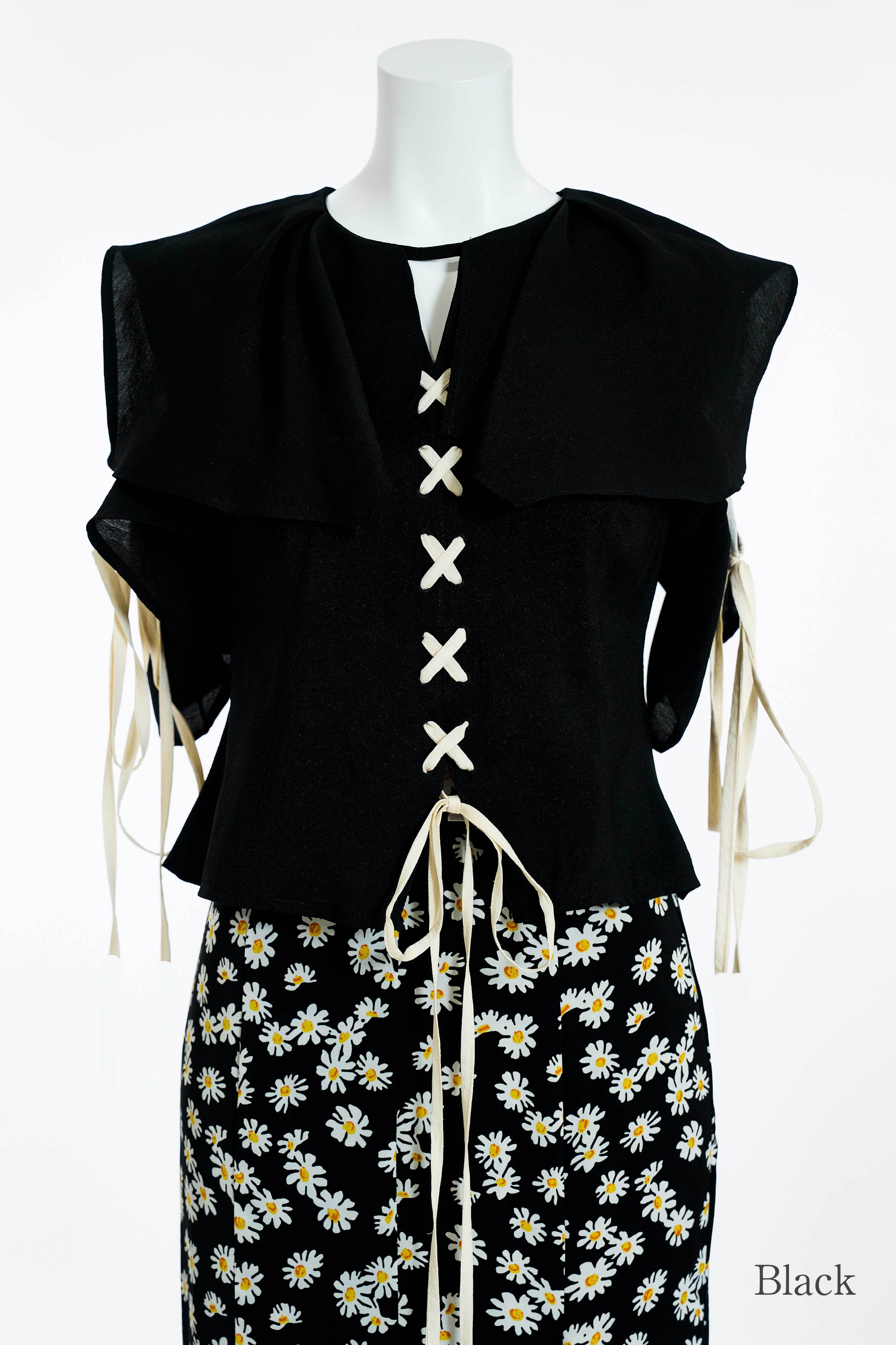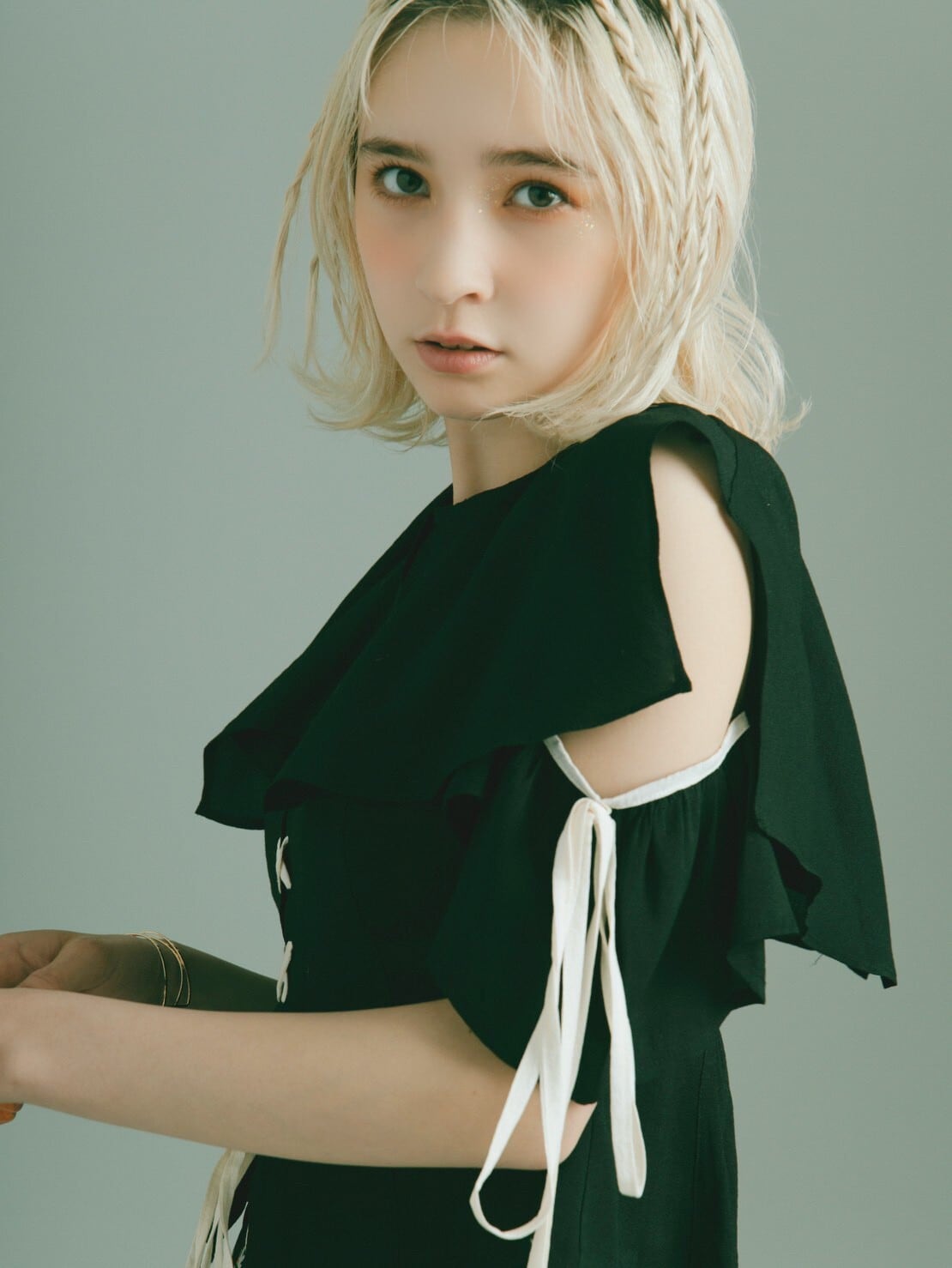 サイドのリボンをそのまま結べば、オープンショルダーで女性らしい肌見せを。