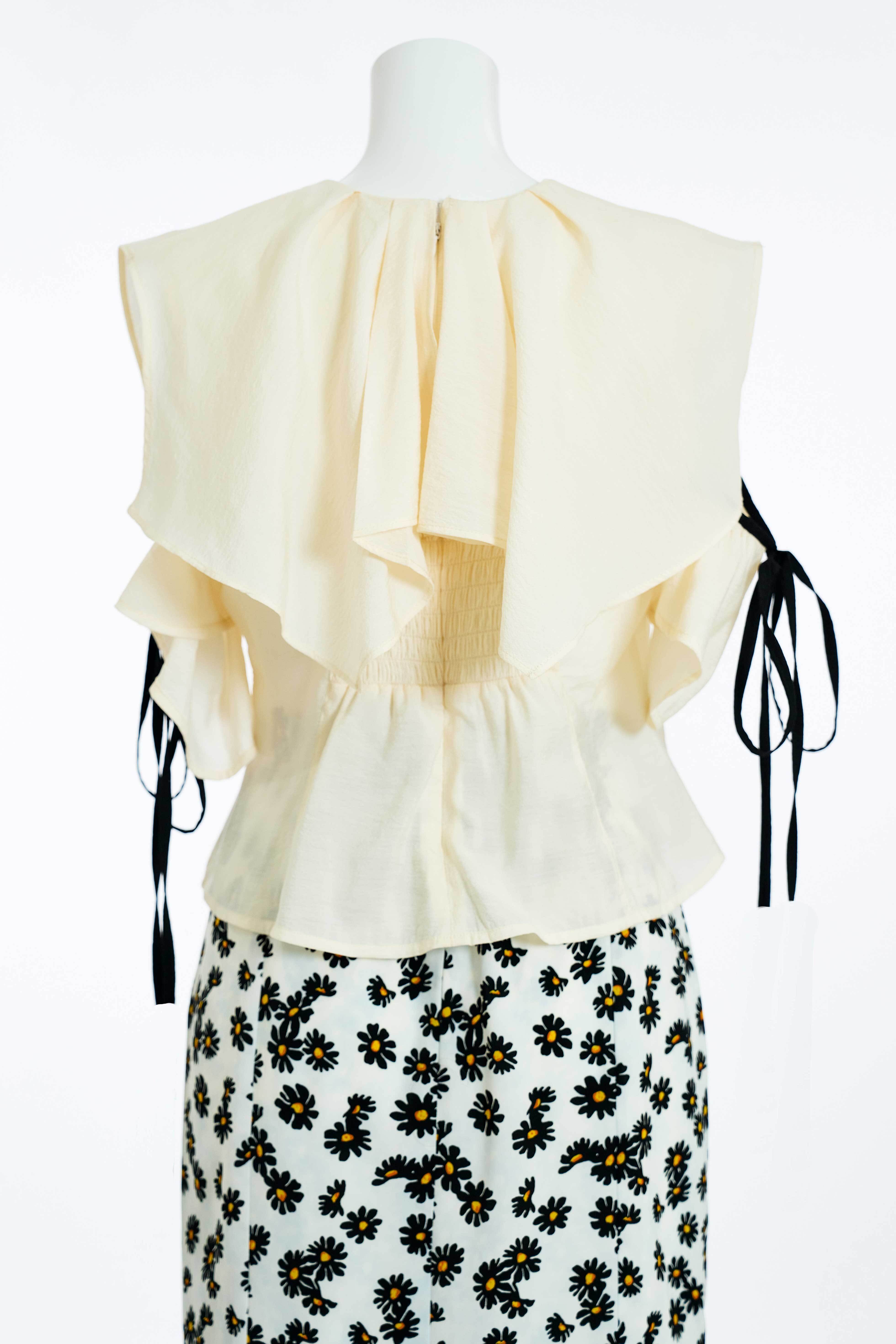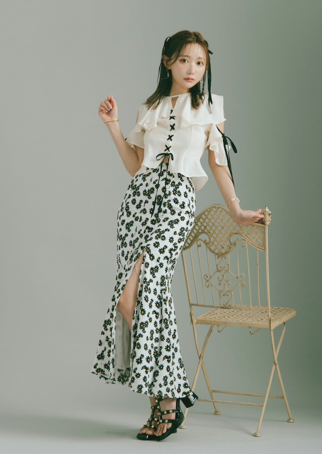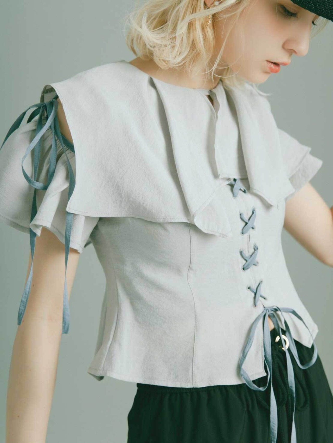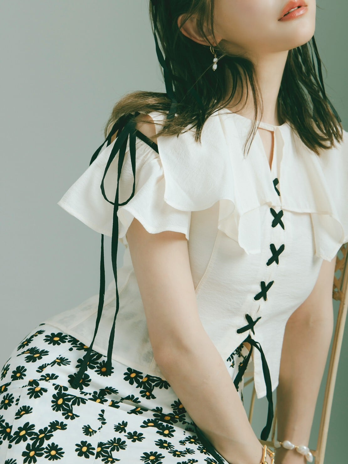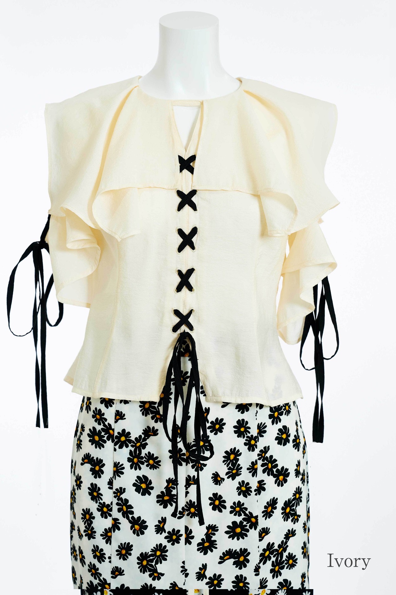 バイカラーな配色のレースアップがアクセントとなったフリルブラウス。