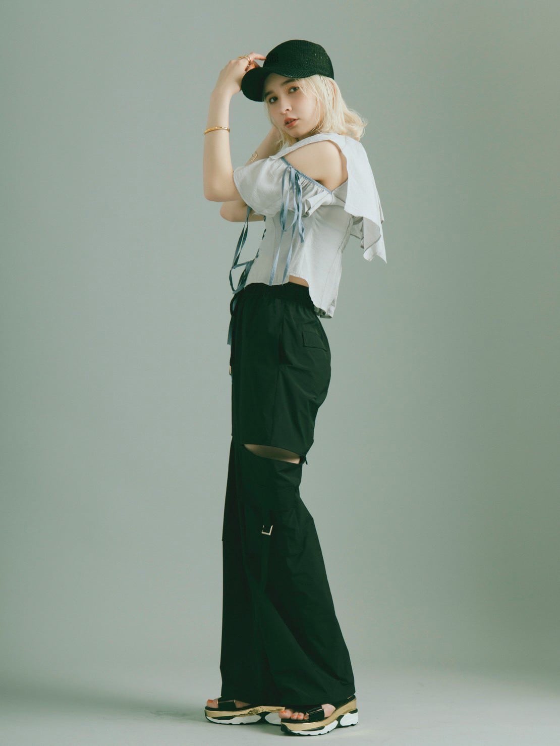 肩先のループを通して結べば、スリットとして肩がチラッと覗くさりげない肌見せが叶います。