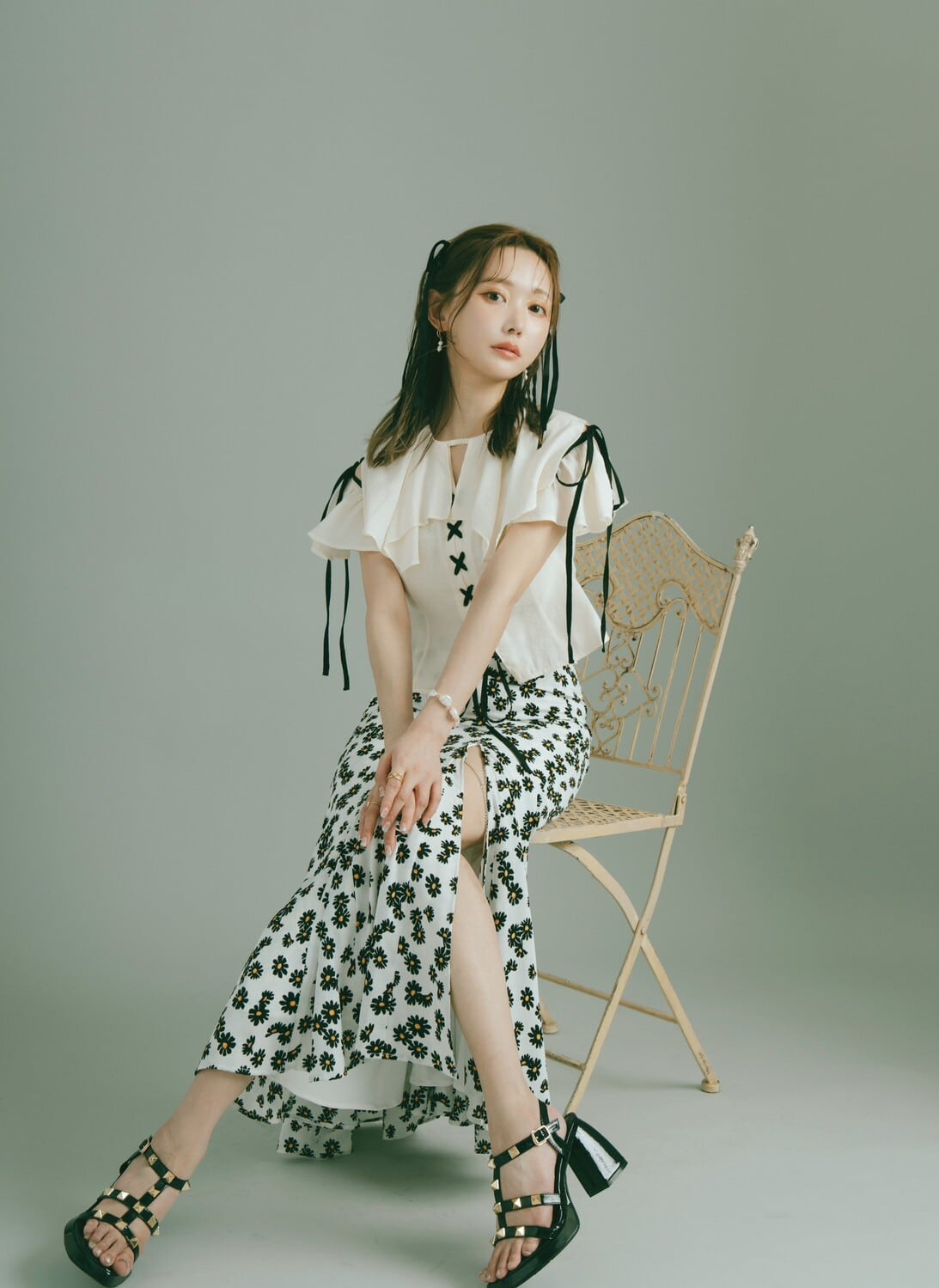 センターと袖口に施された配色の細リボンが、コーディネートを引き締め、