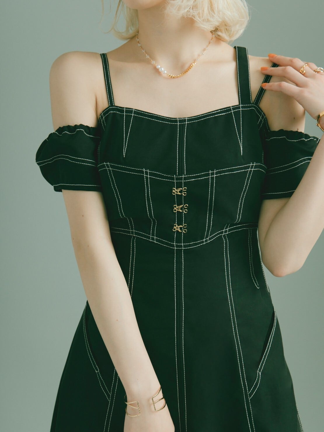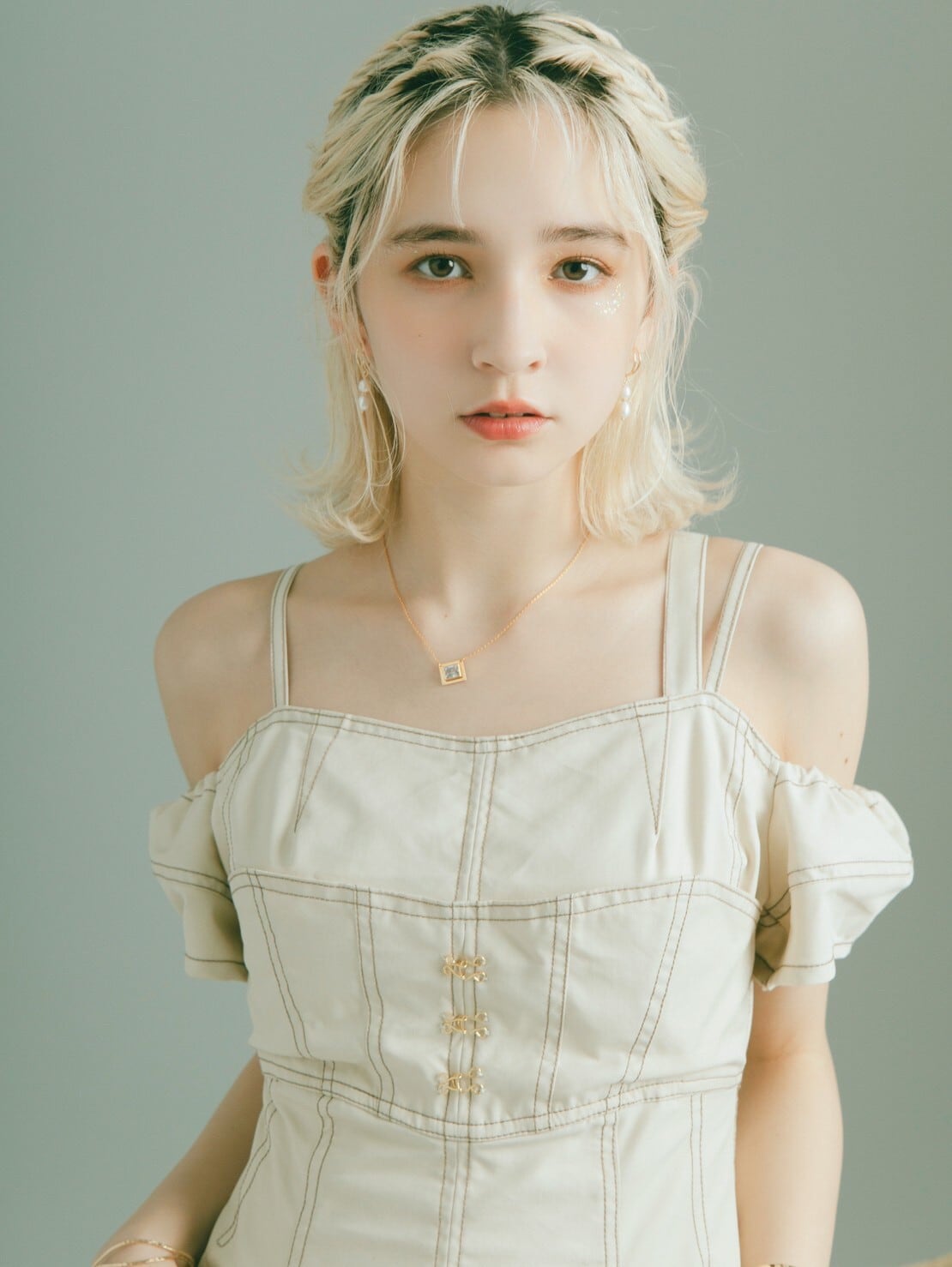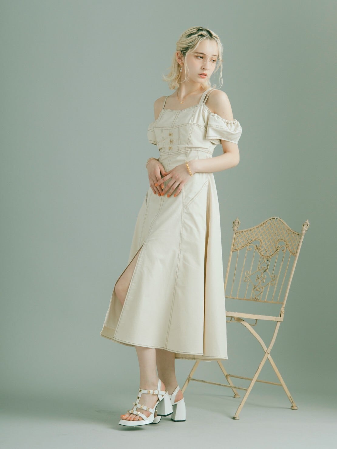 左右アシンメトリーな肩紐はこなれ感と女性らしい華奢な印象へと導きます。