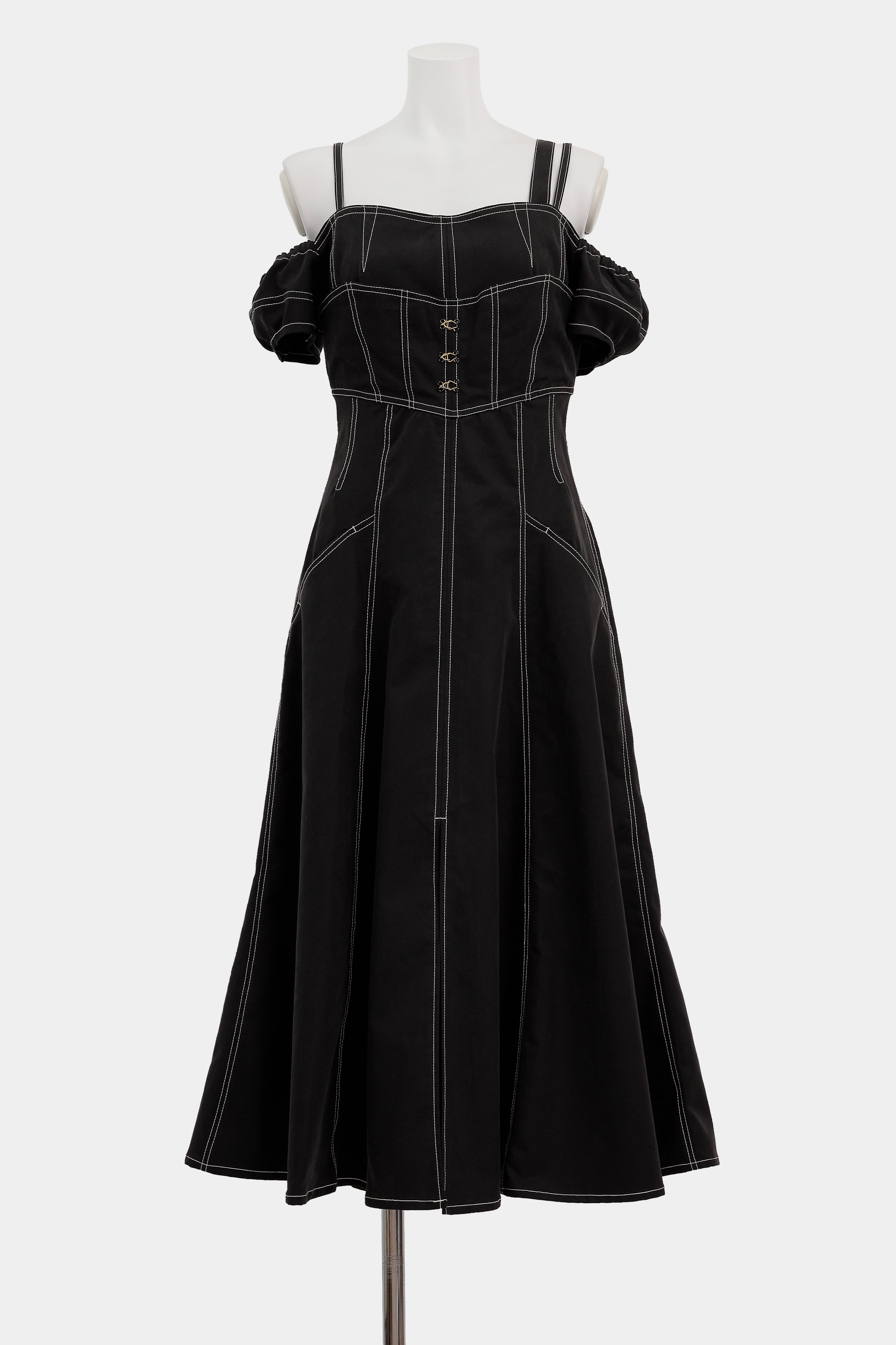 胸元のダブルビスチェデザインがフェティッシュなモードをプラス。