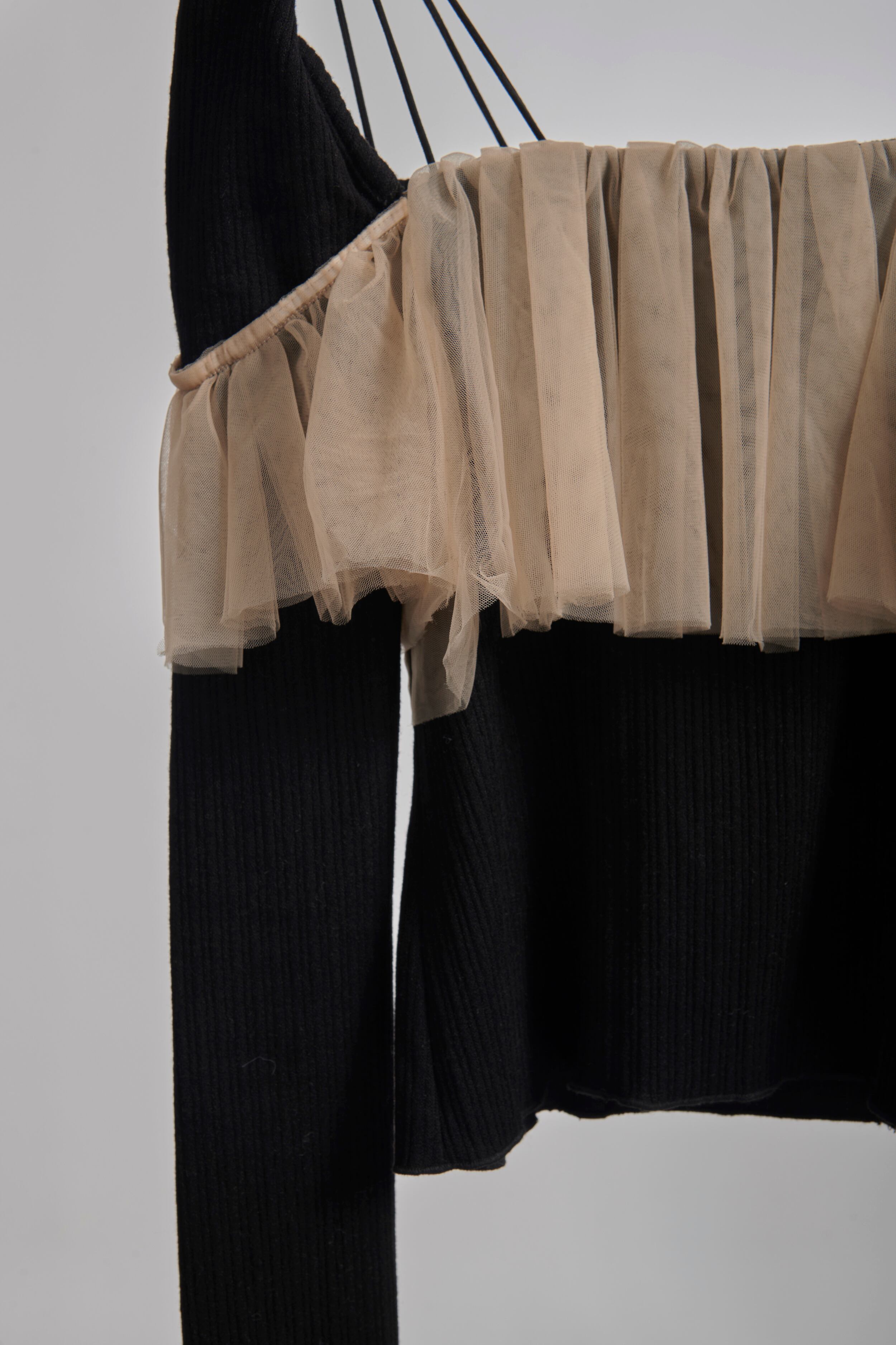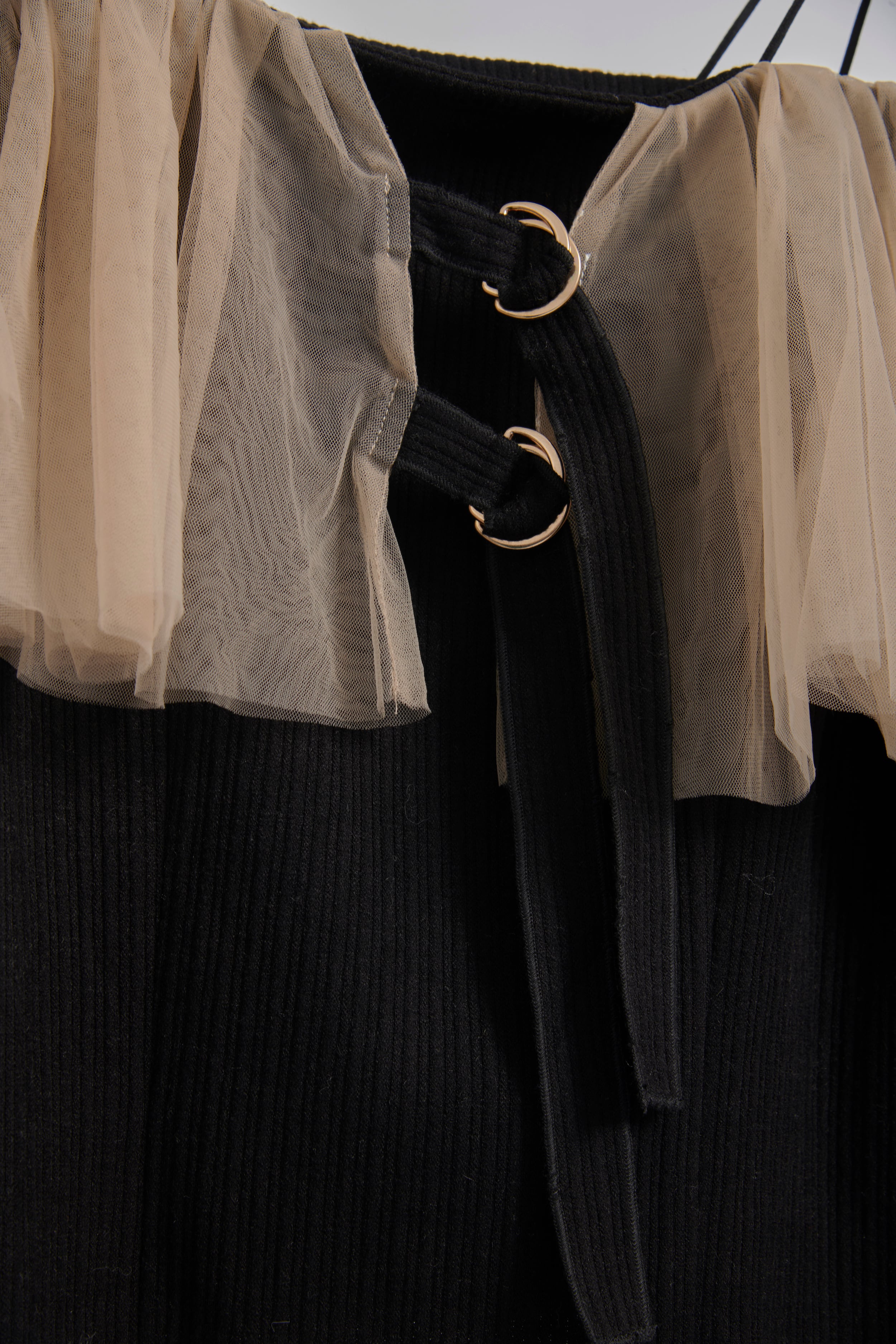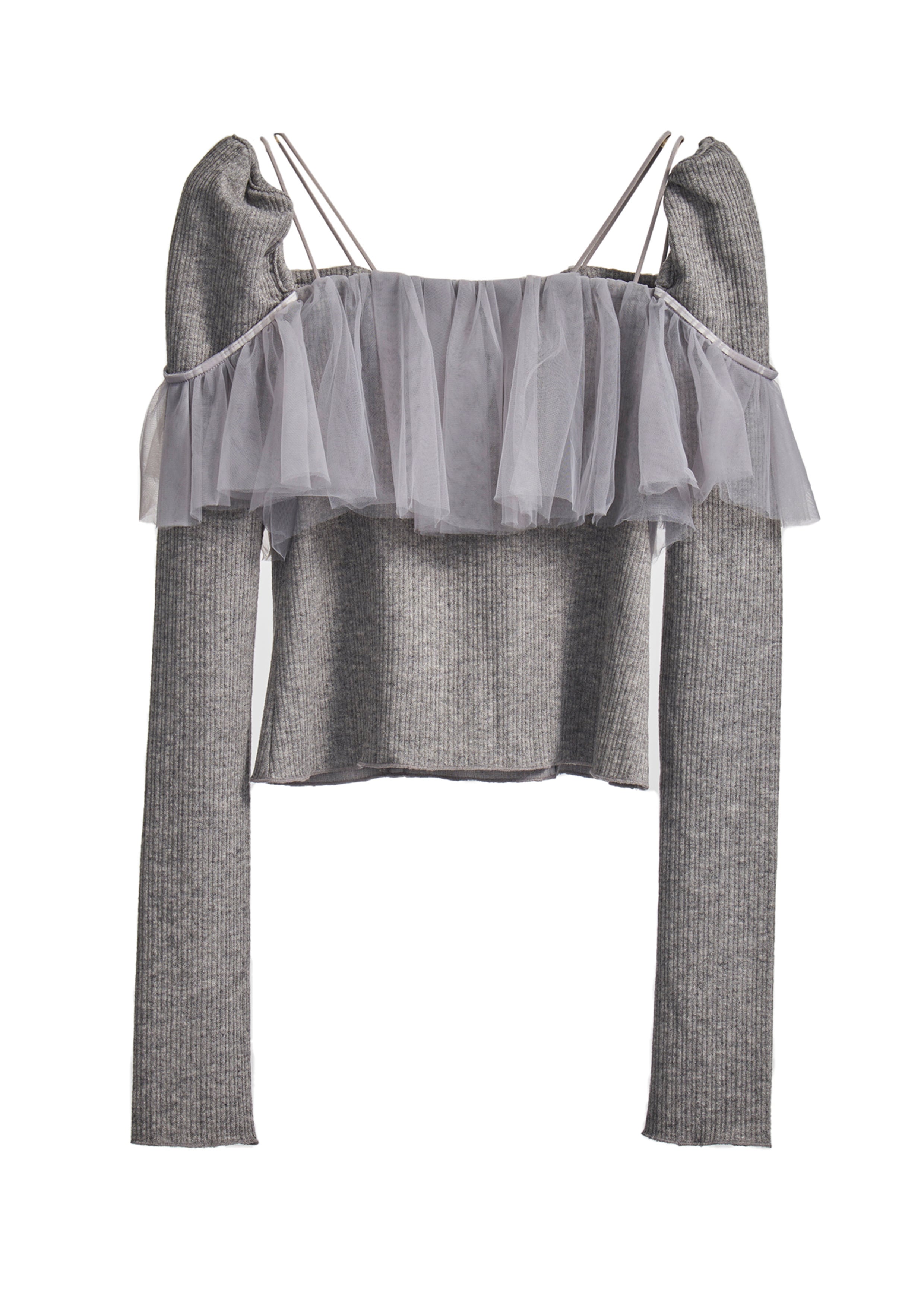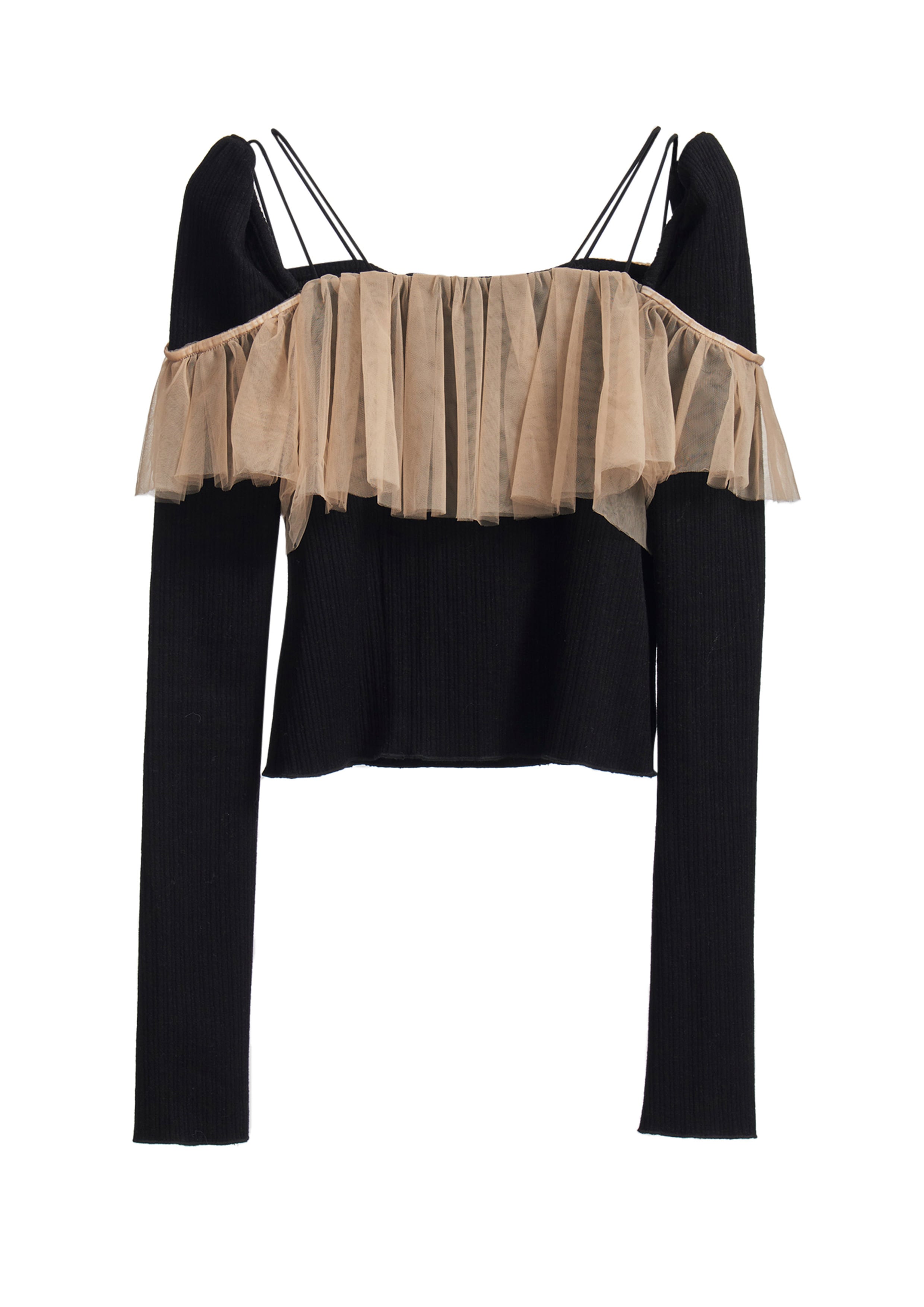 リブカットソーにチュールをふんだんにドッキングした華やかなトップス。