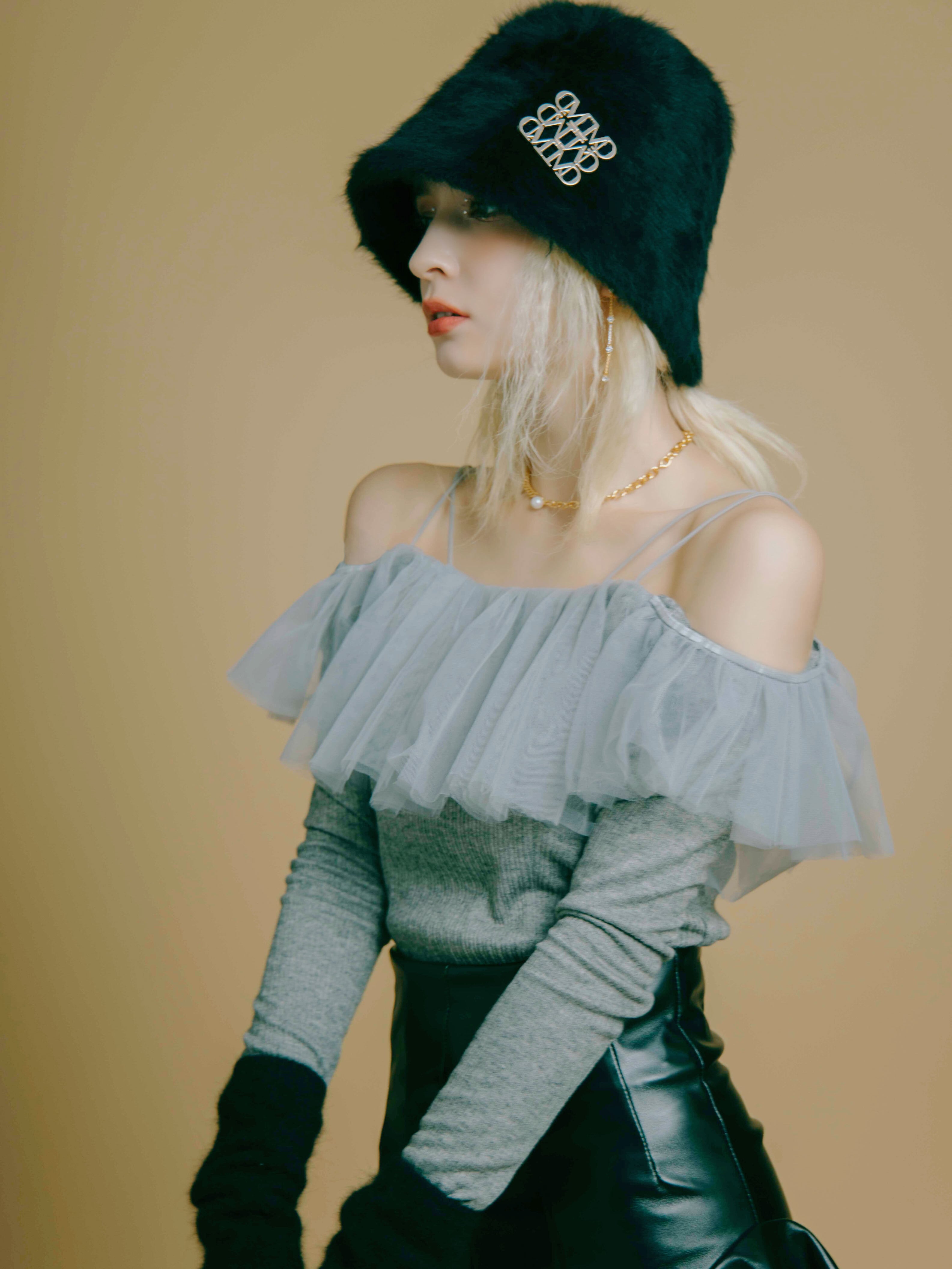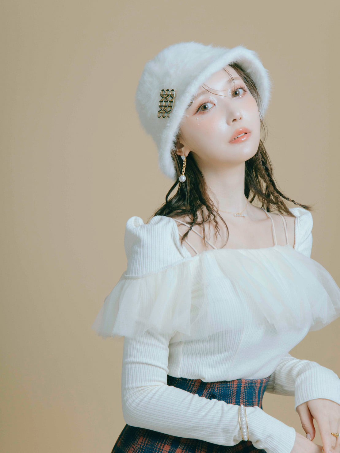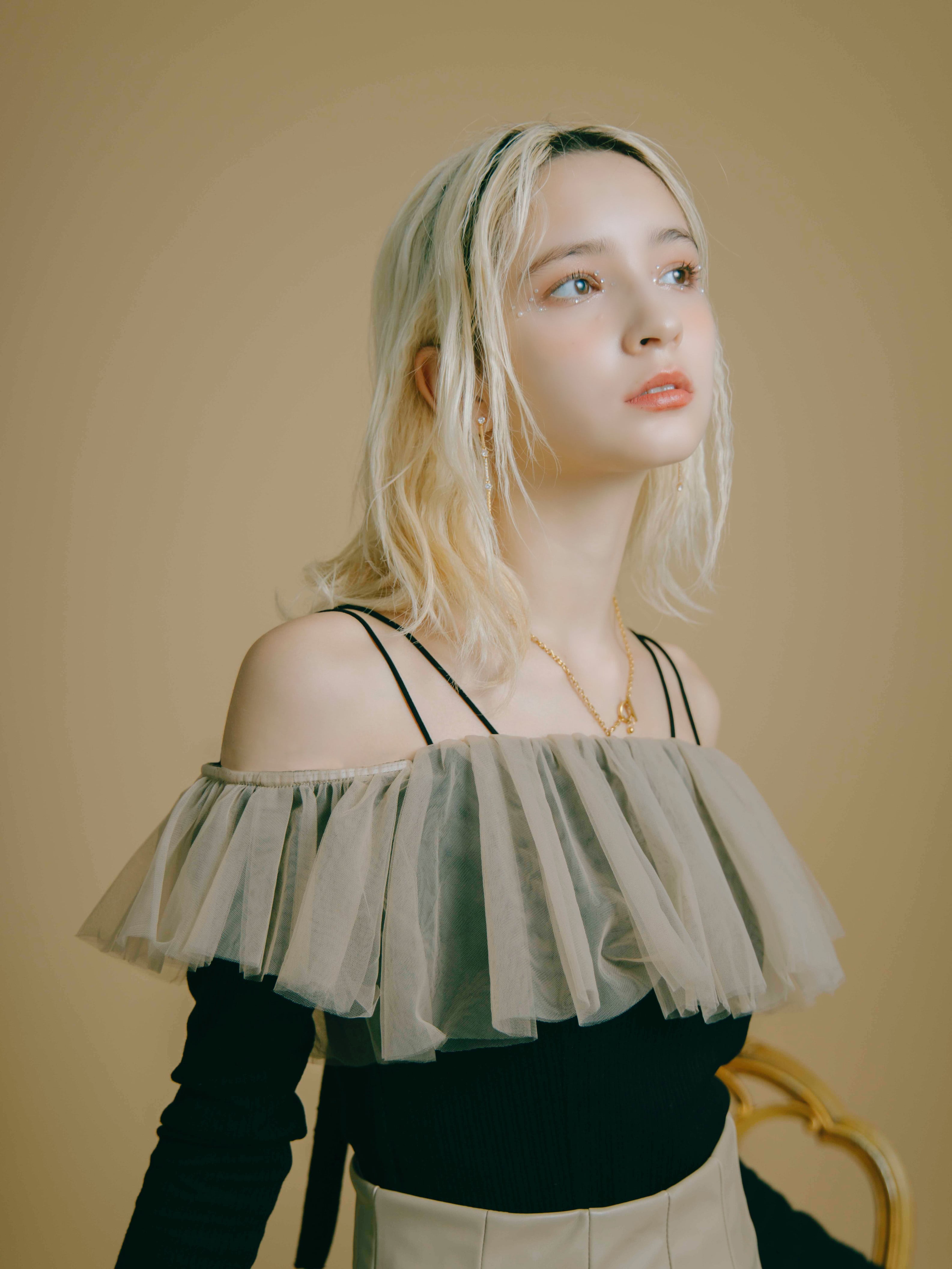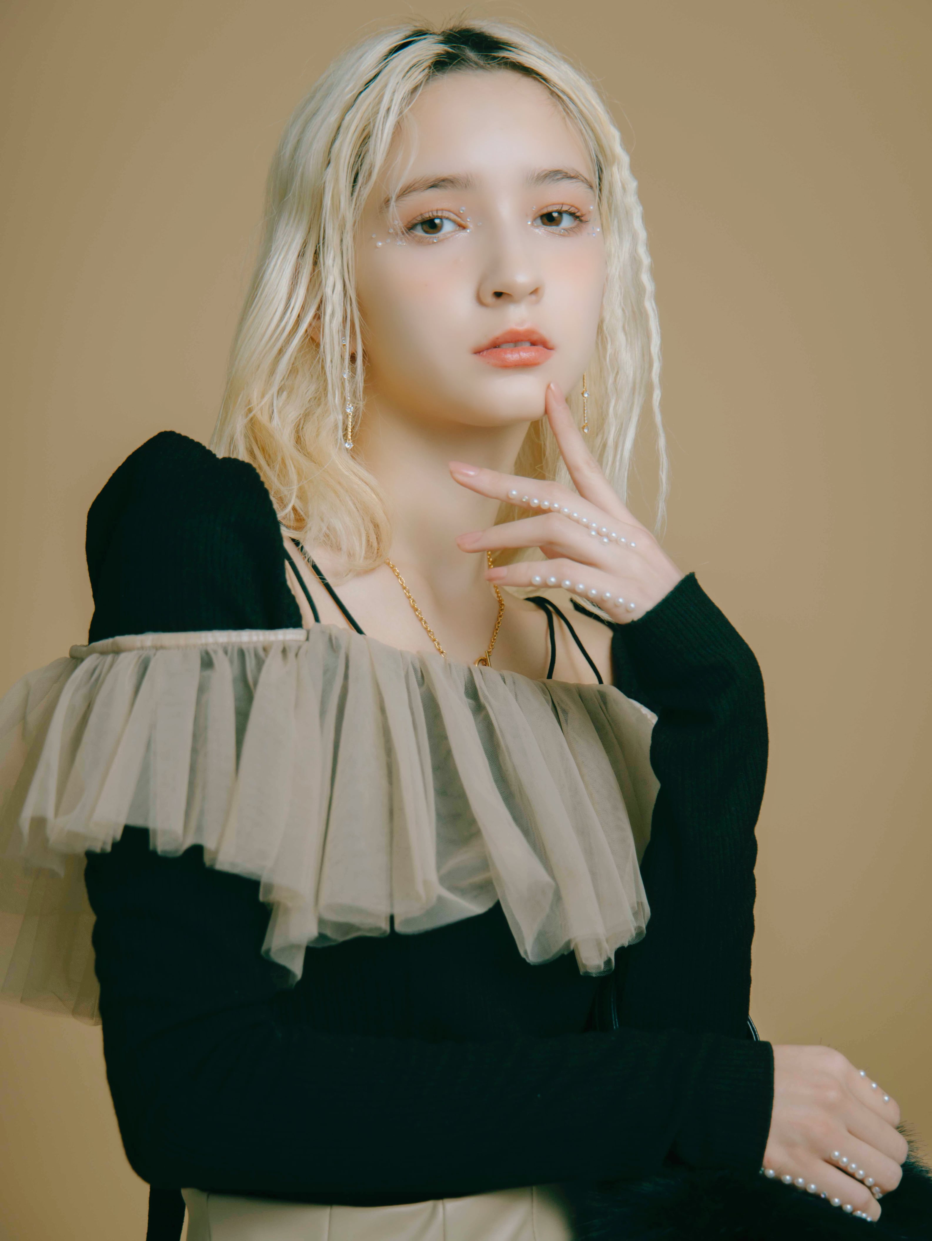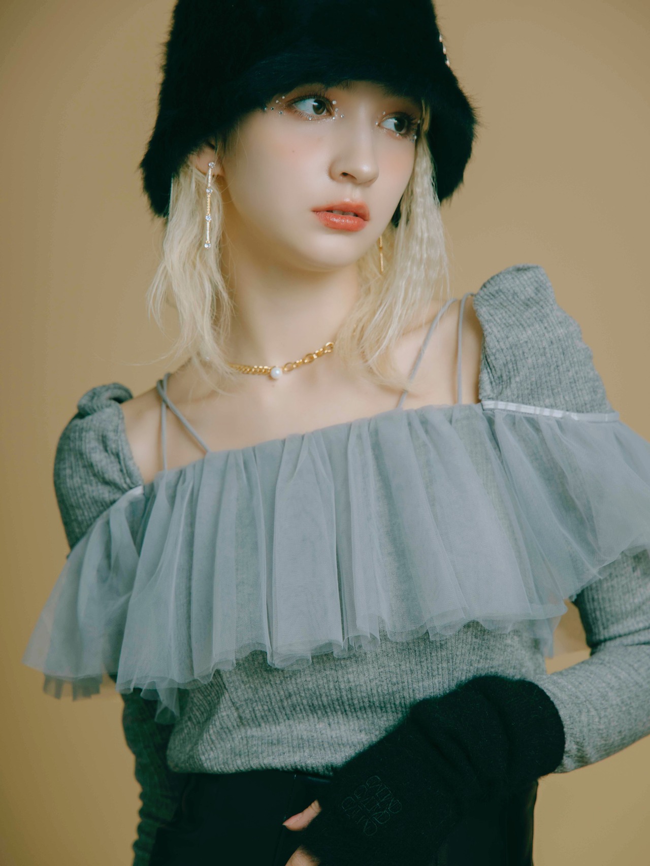 リブカットソーにチュールをふんだんにドッキングした華やかなトップス。