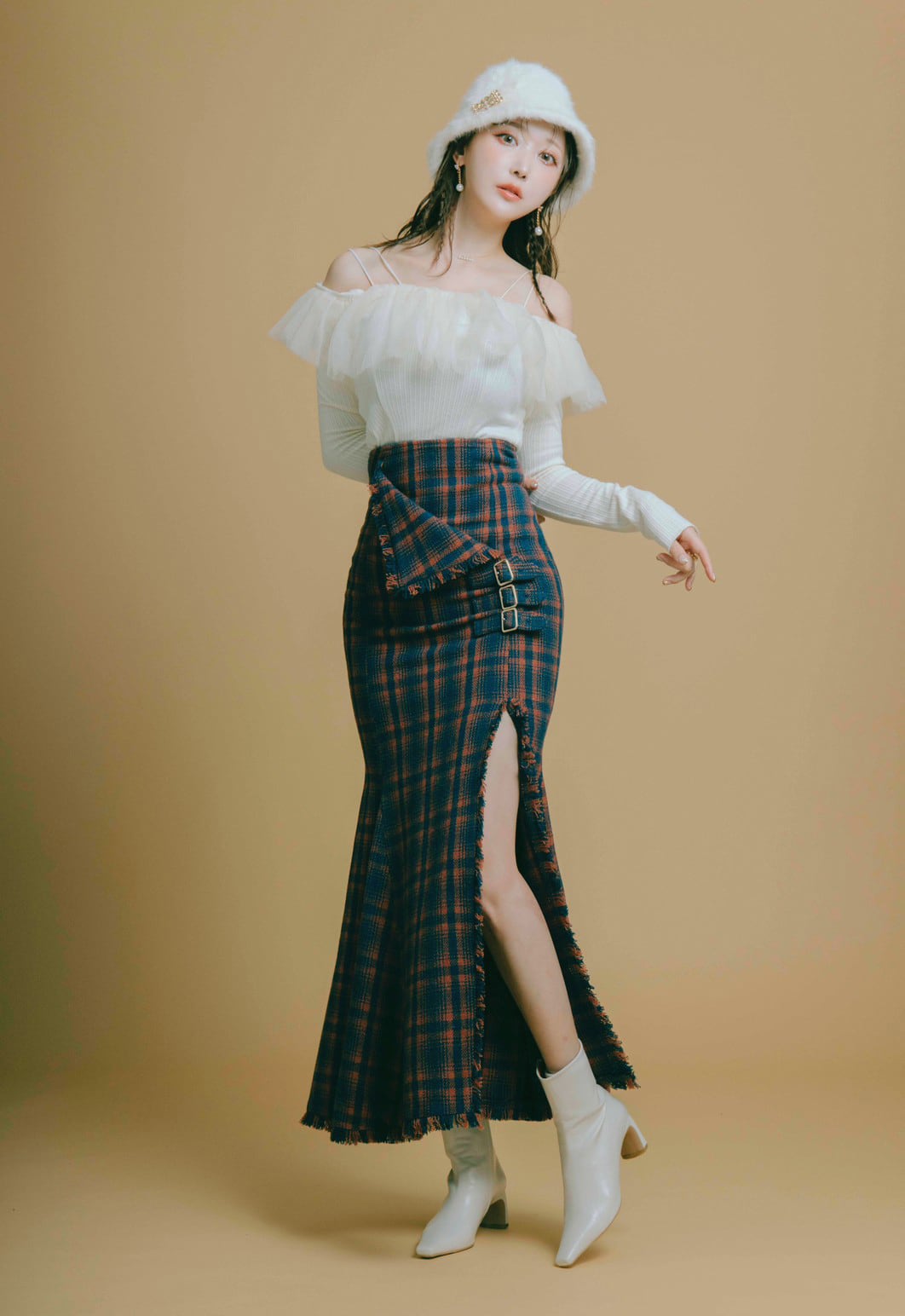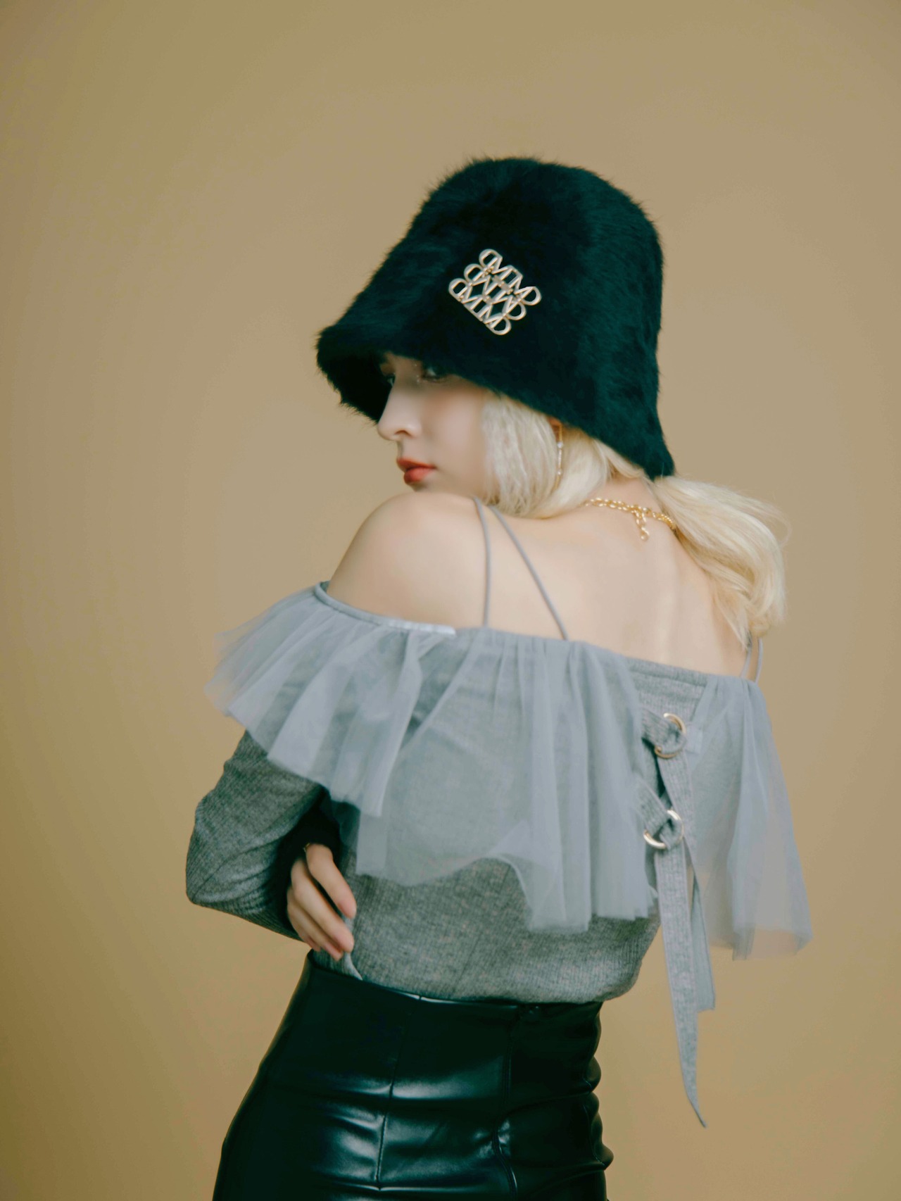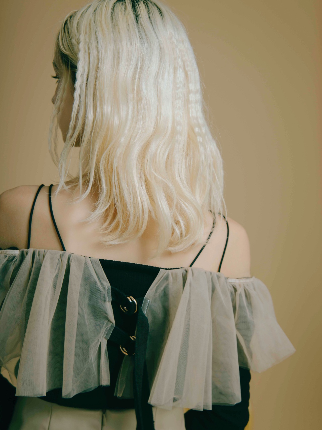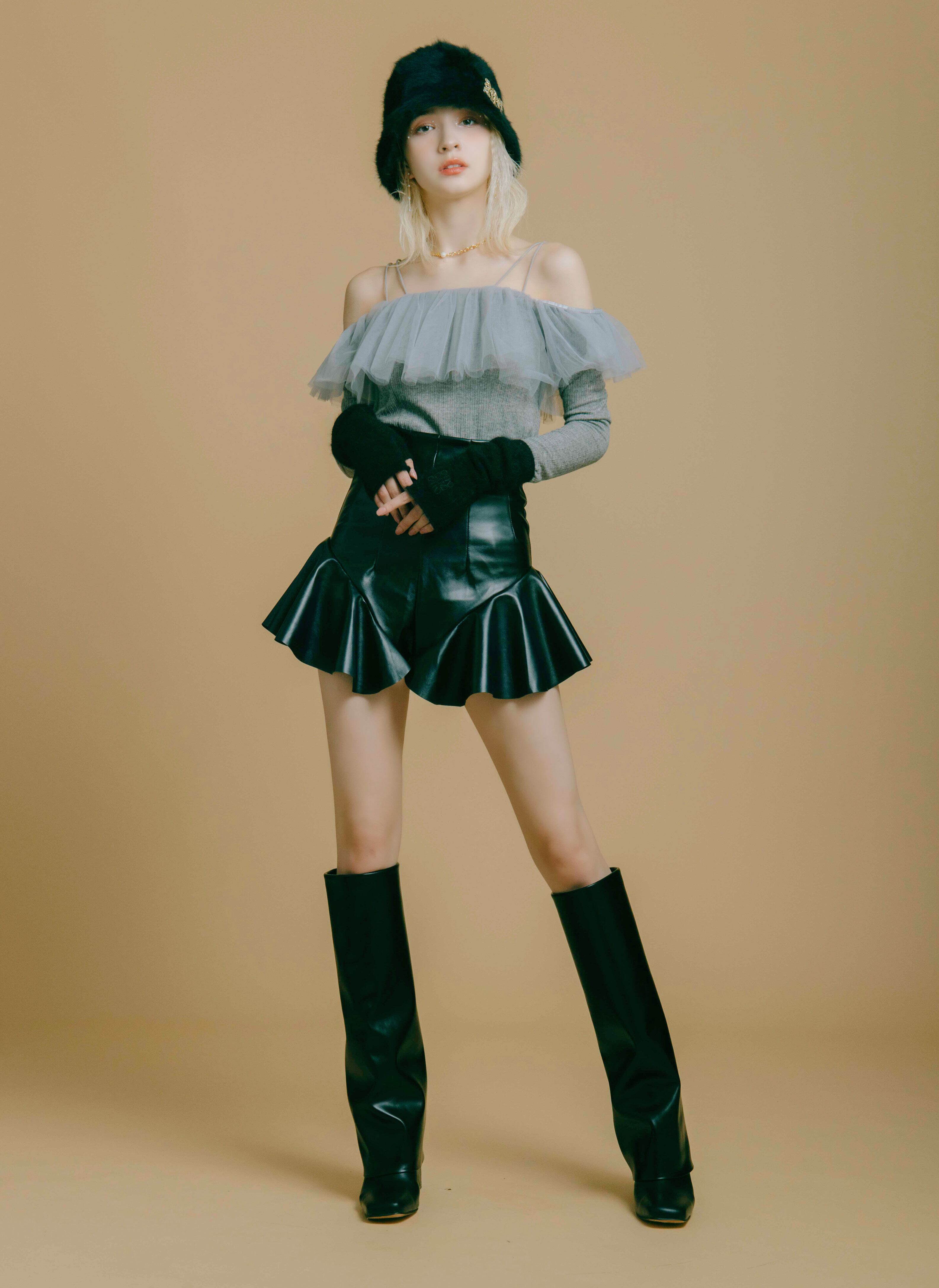 リブカットソーにチュールをふんだんにドッキングした華やかなトップス。