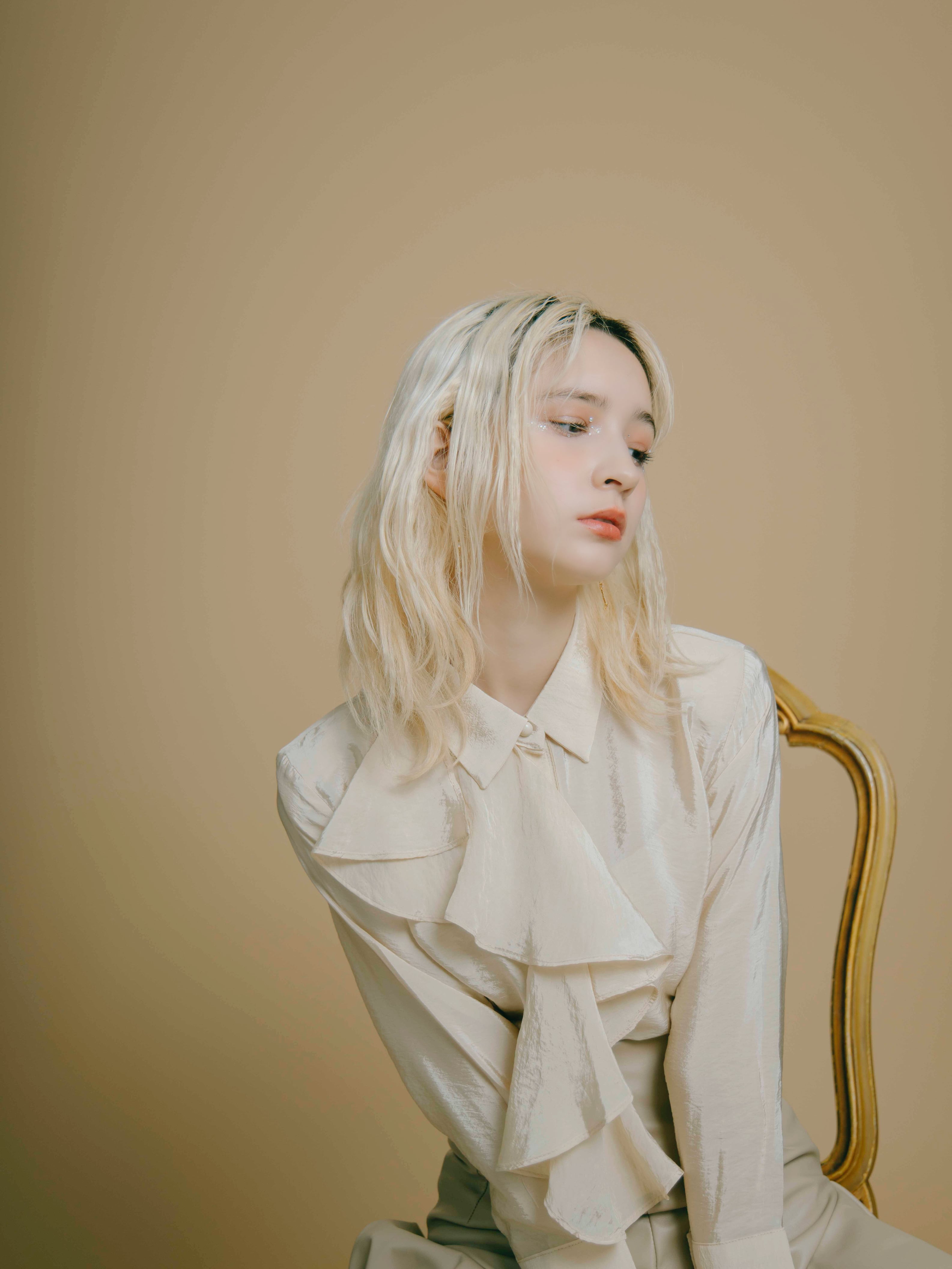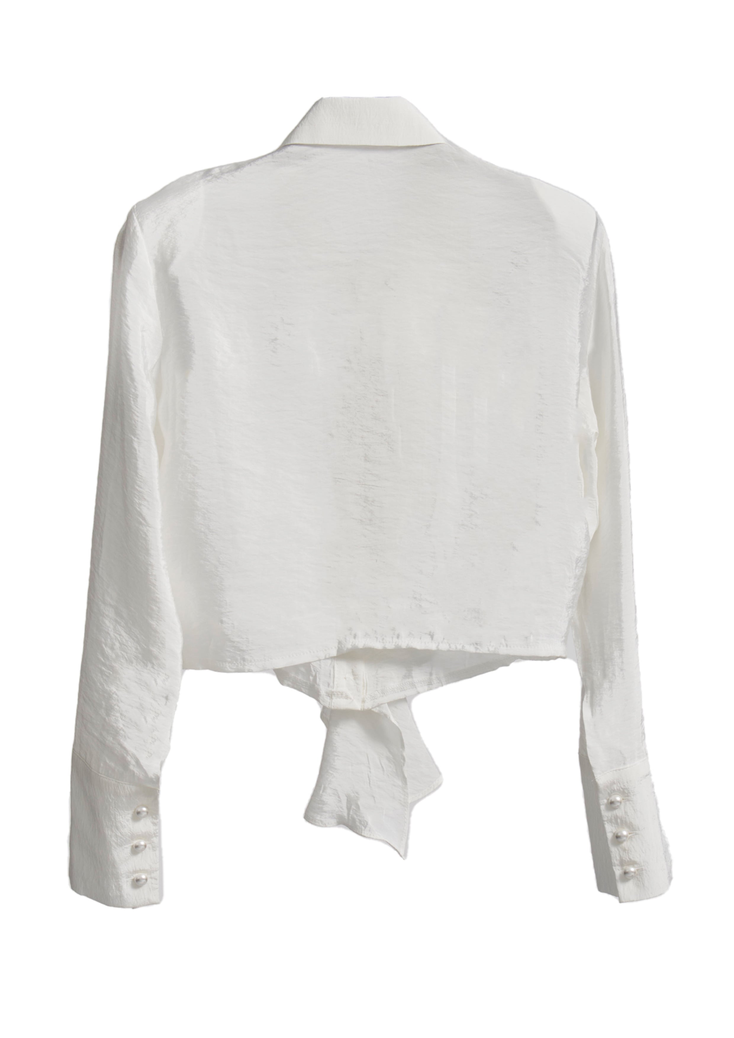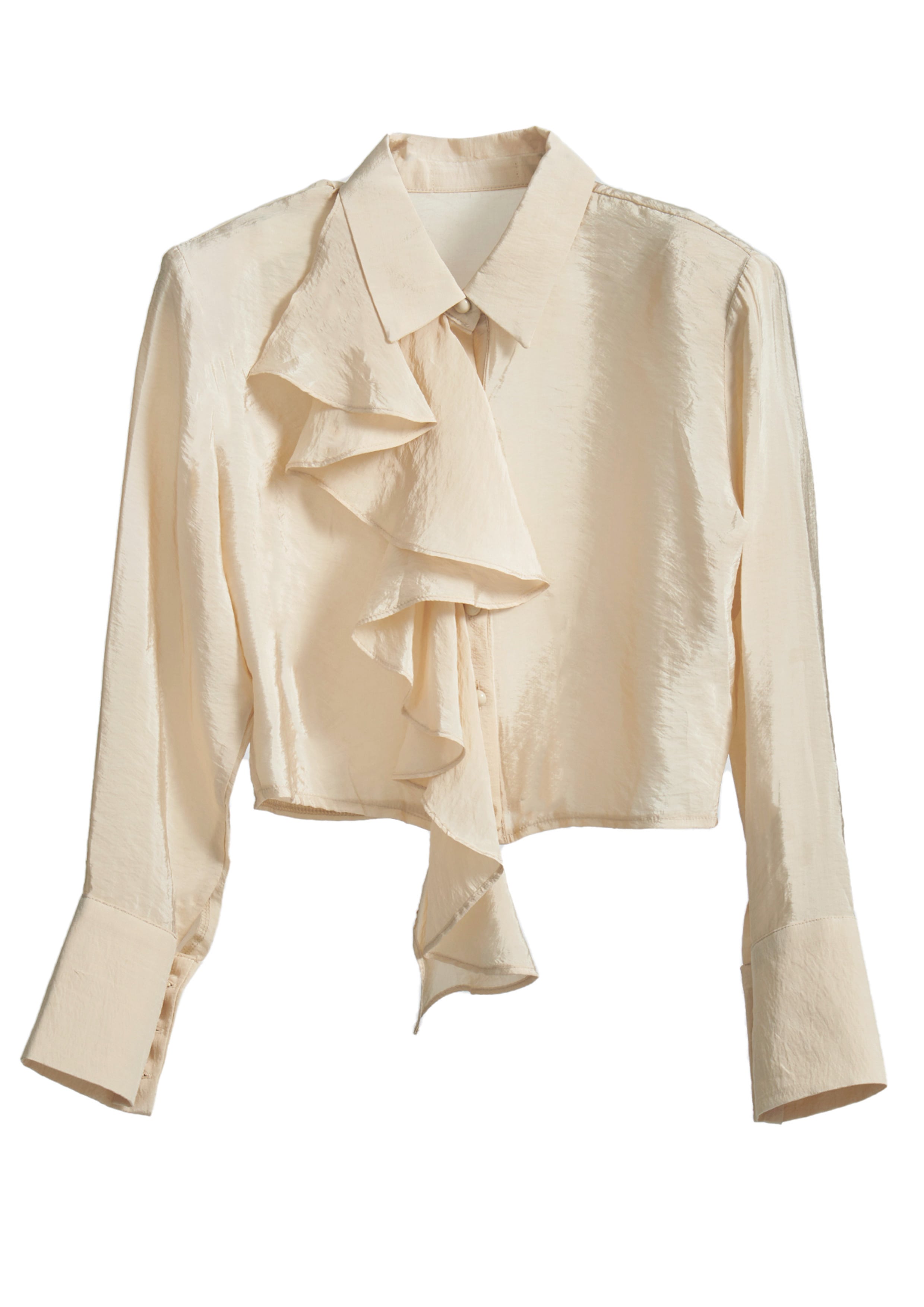 アシンメトリーなラッフルフリルが印象的なクロップド丈のブラウス。
