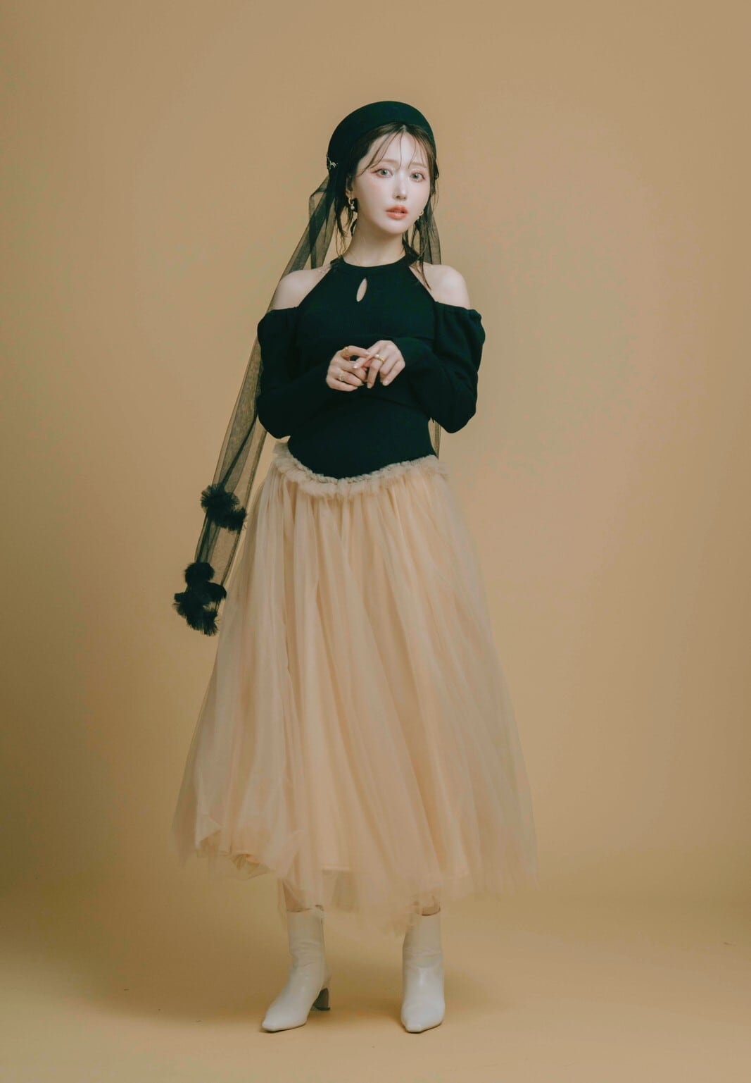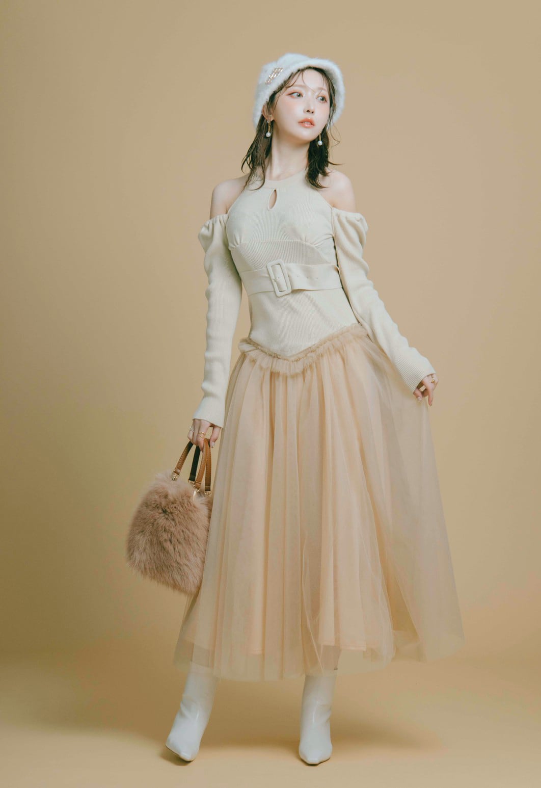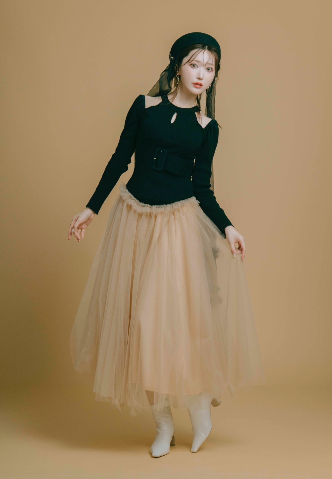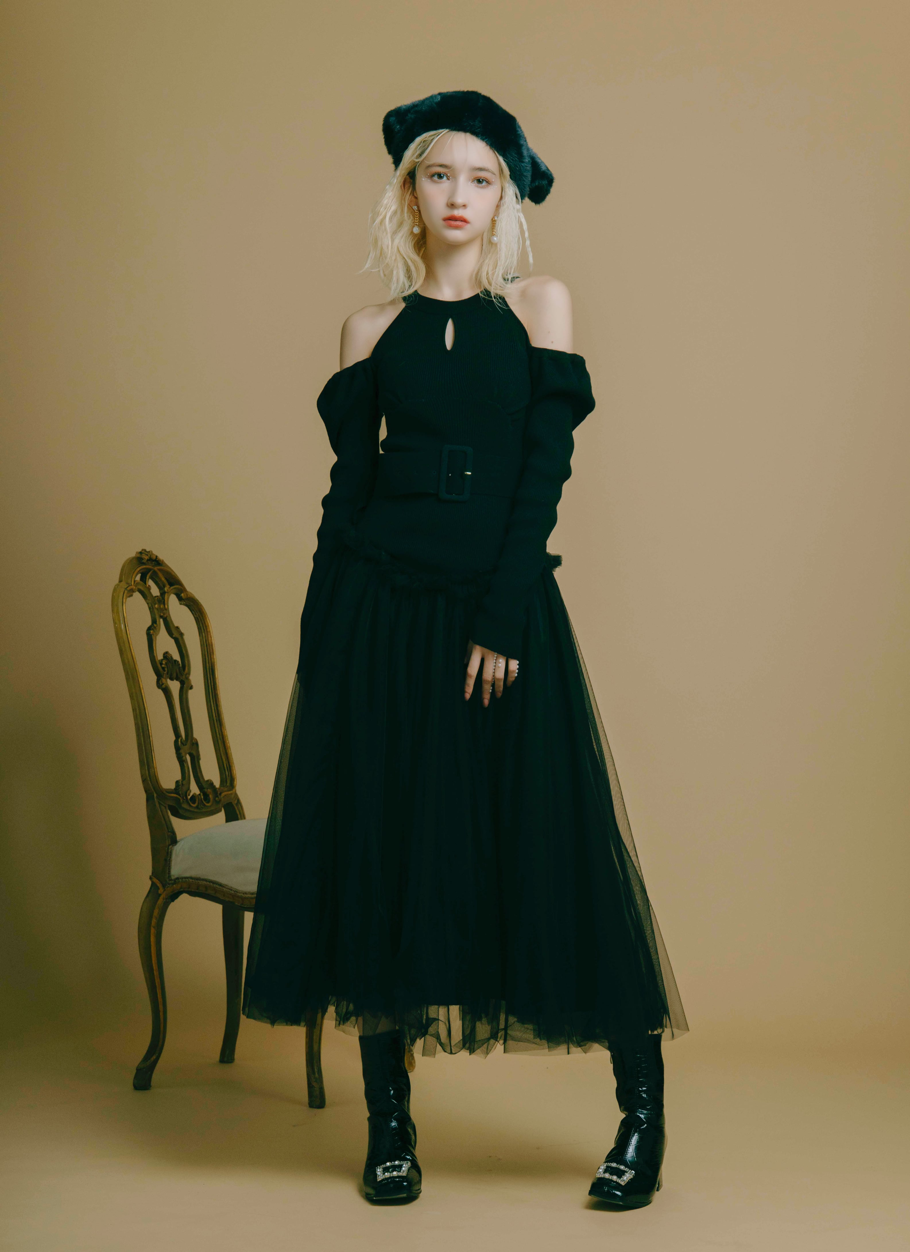 コルセットを思わせるようなニットとチュールの緩いV字切り替えラインと、エアリーなチュールスカートが、女性らしさを一層引き立て、ドラマティックに演出します。