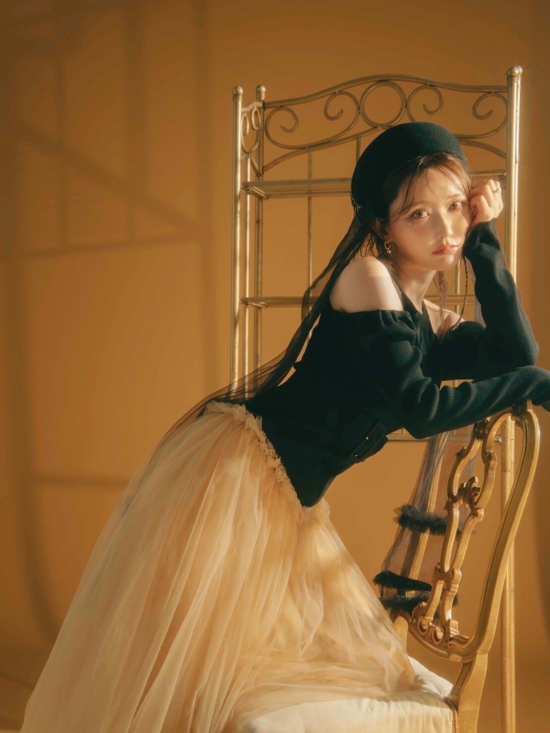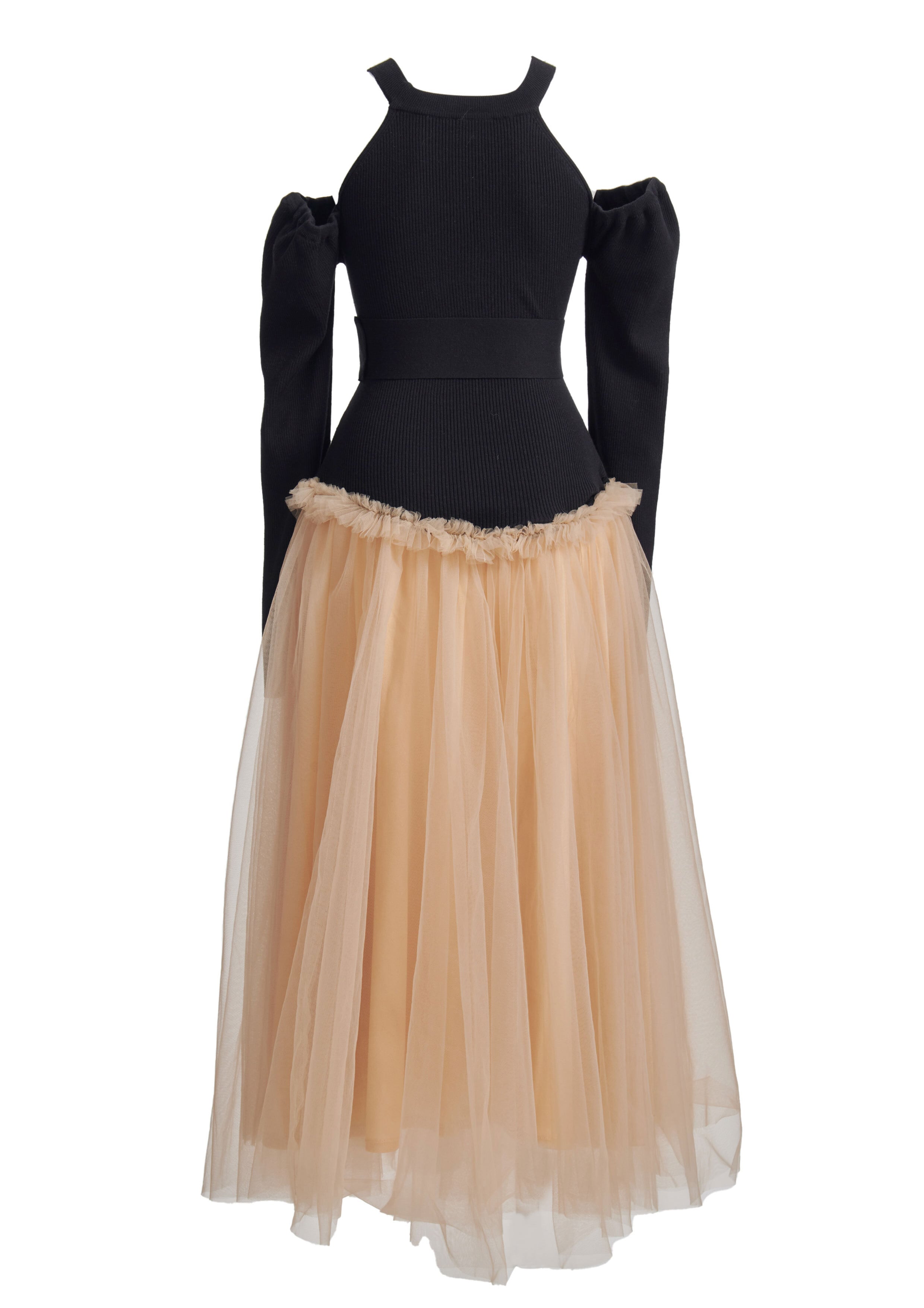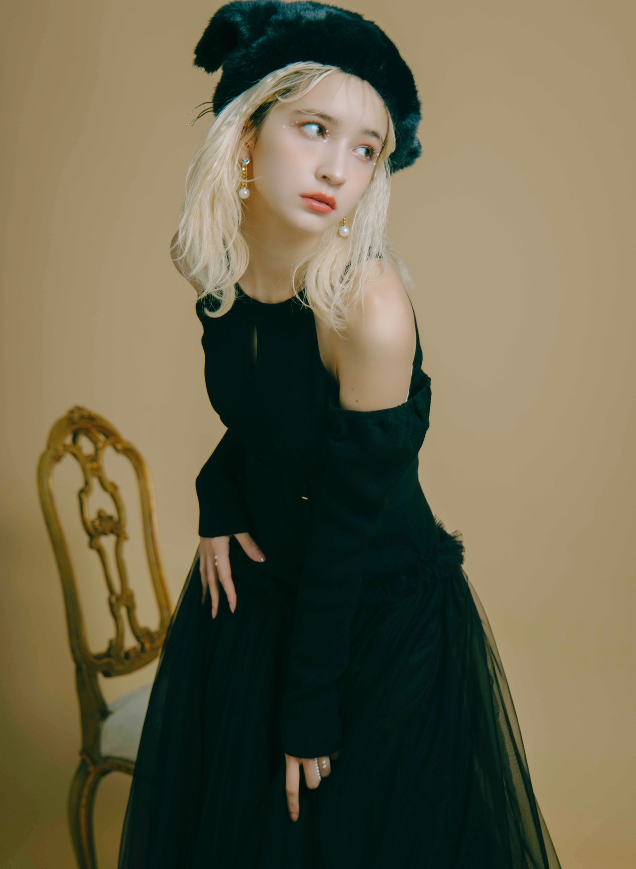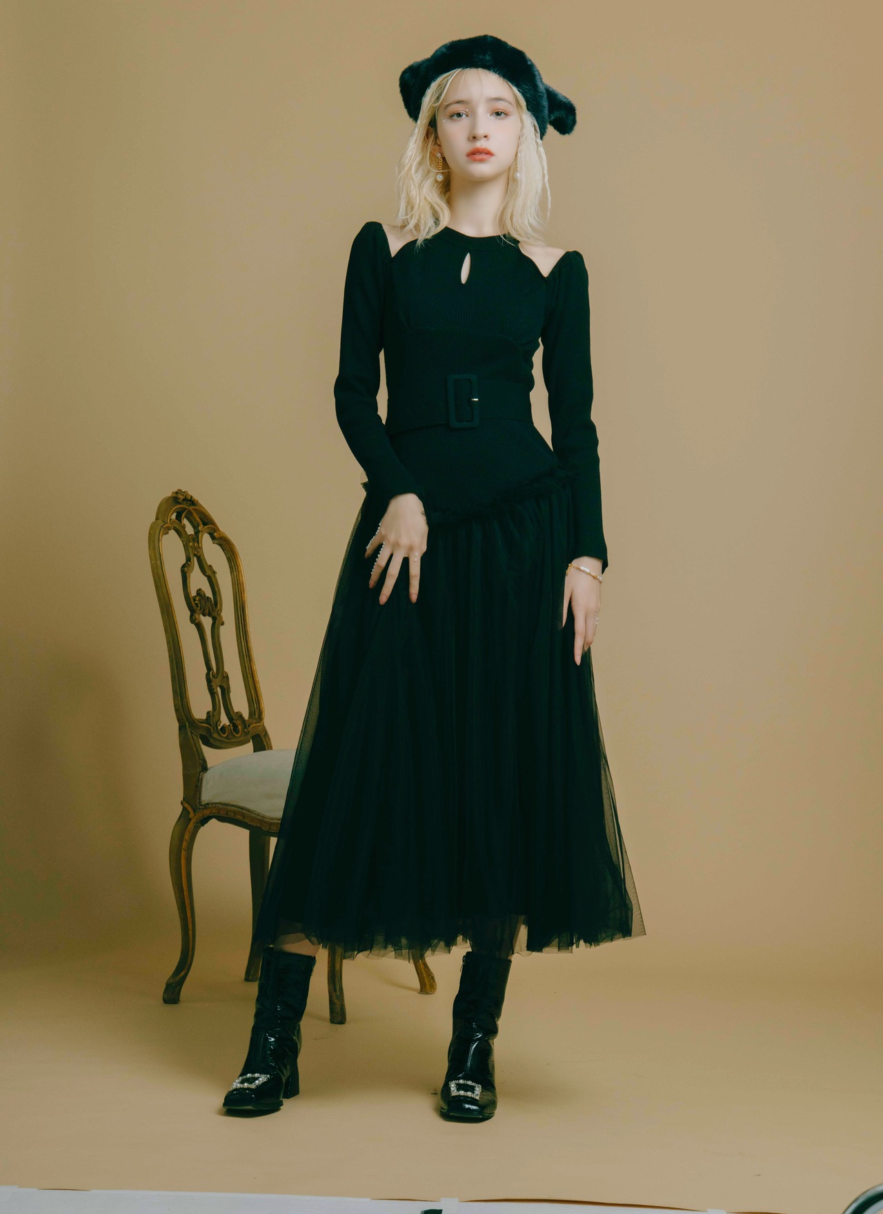 コルセットを思わせるようなニットとチュールの緩いV字切り替えラインと、エアリーなチュールスカートが、女性らしさを一層引き立て、ドラマティックに演出します。