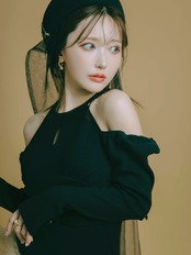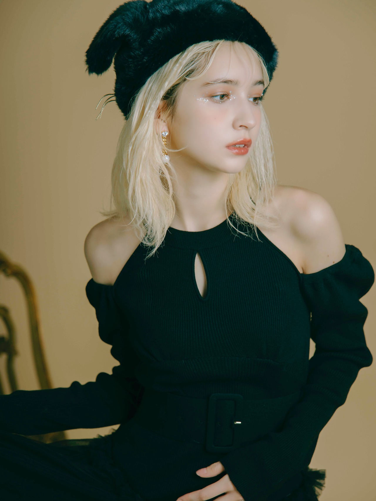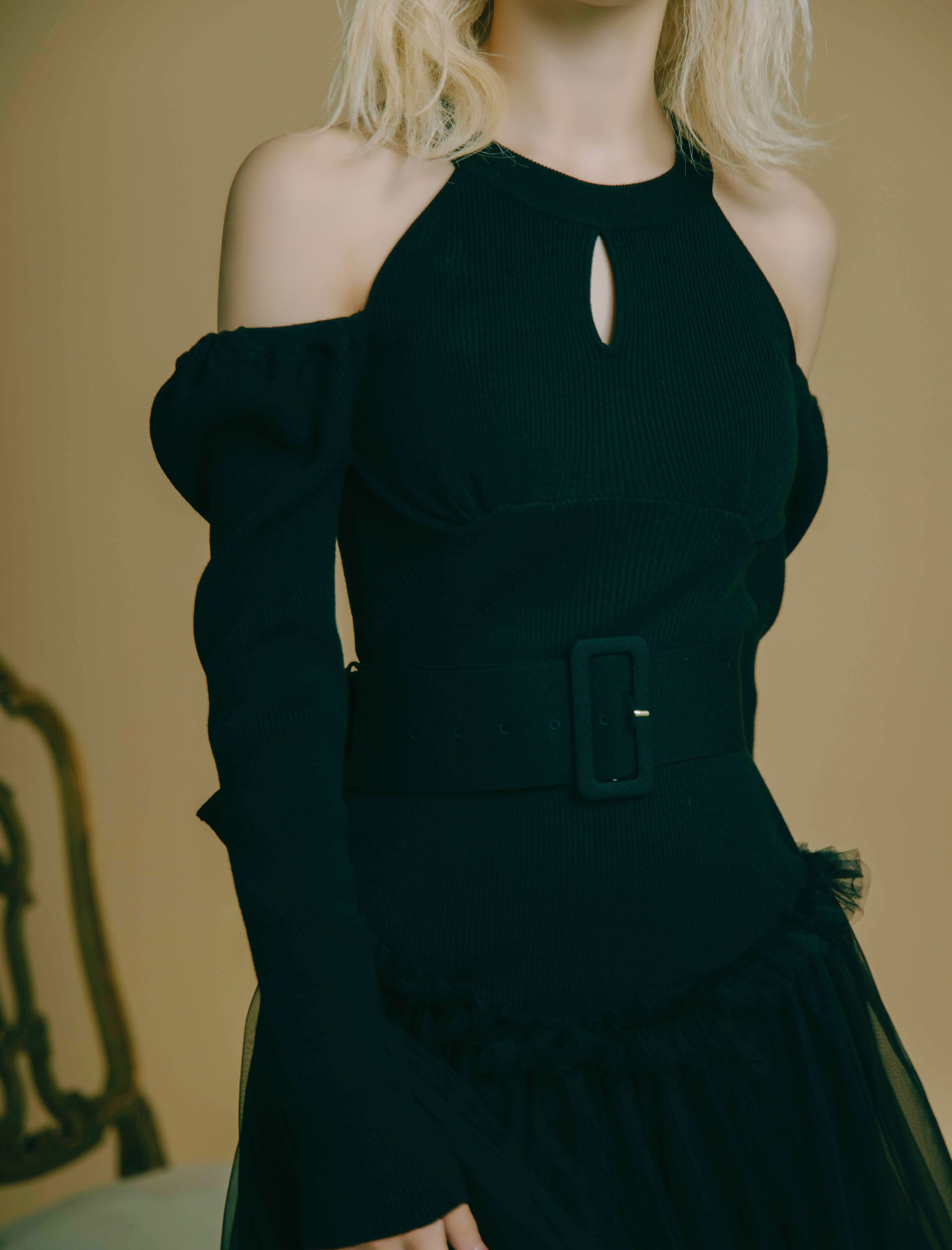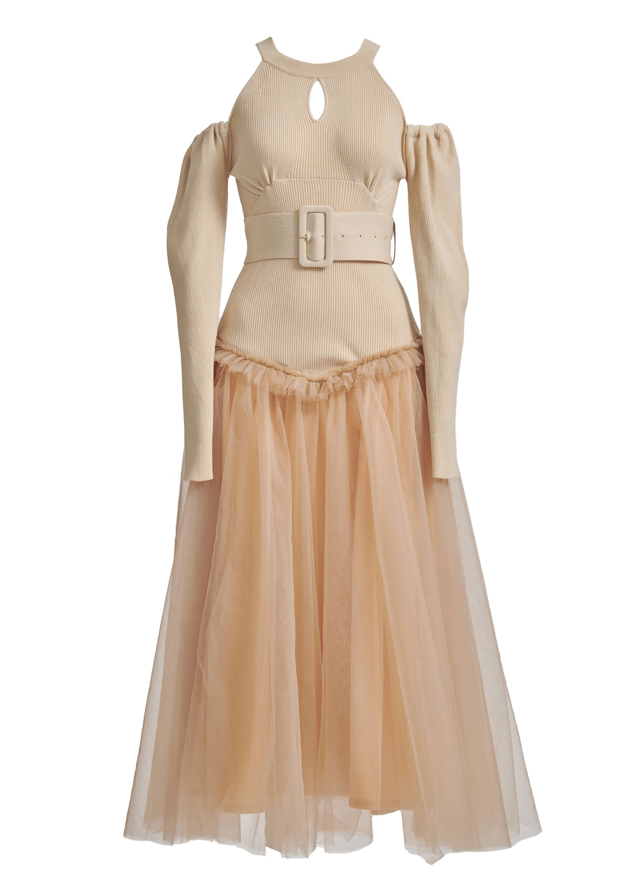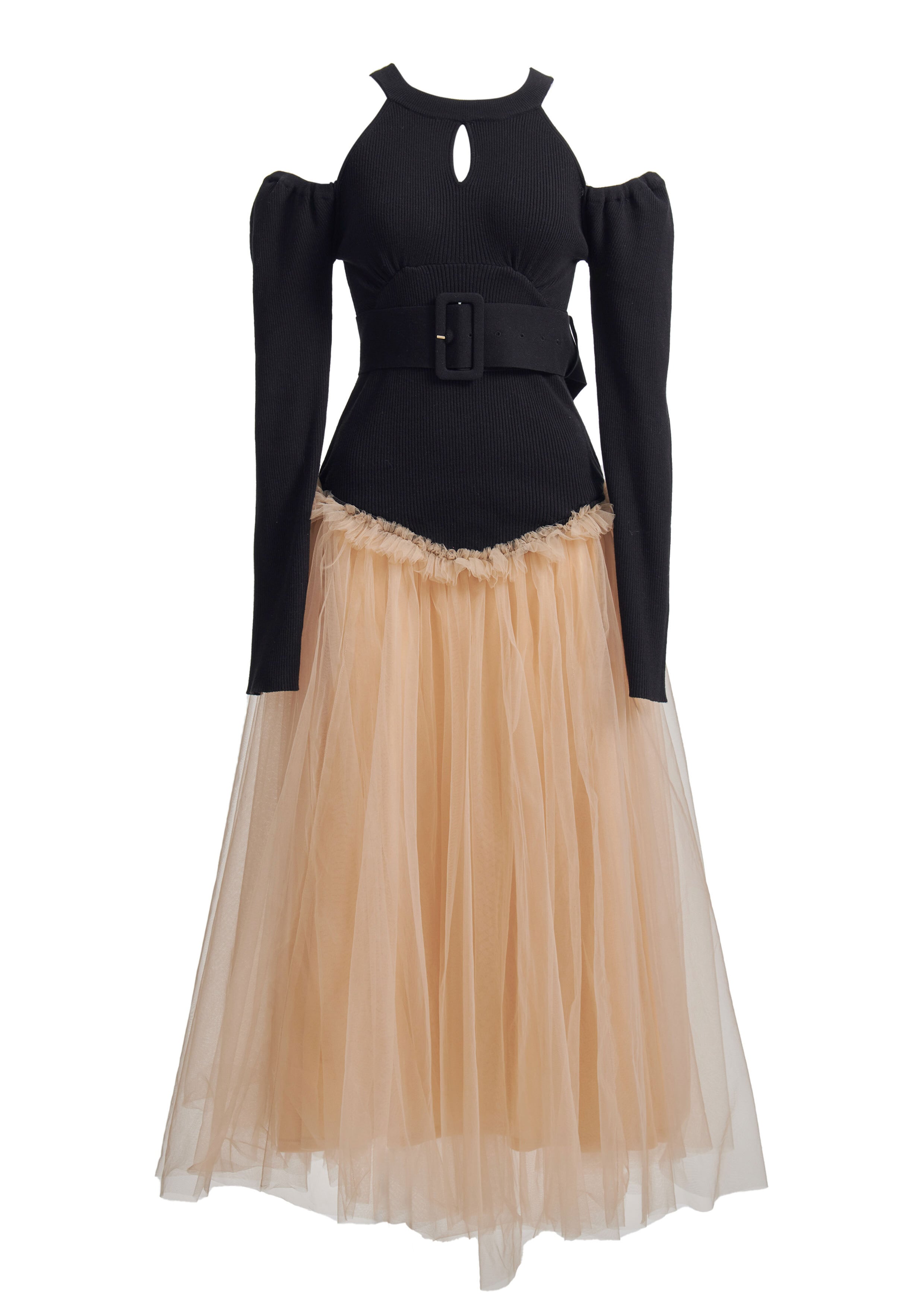 コルセットを思わせるようなニットとチュールの緩いV字切り替えラインと、エアリーなチュールスカートが、女性らしさを一層引き立て、ドラマティックに演出します。