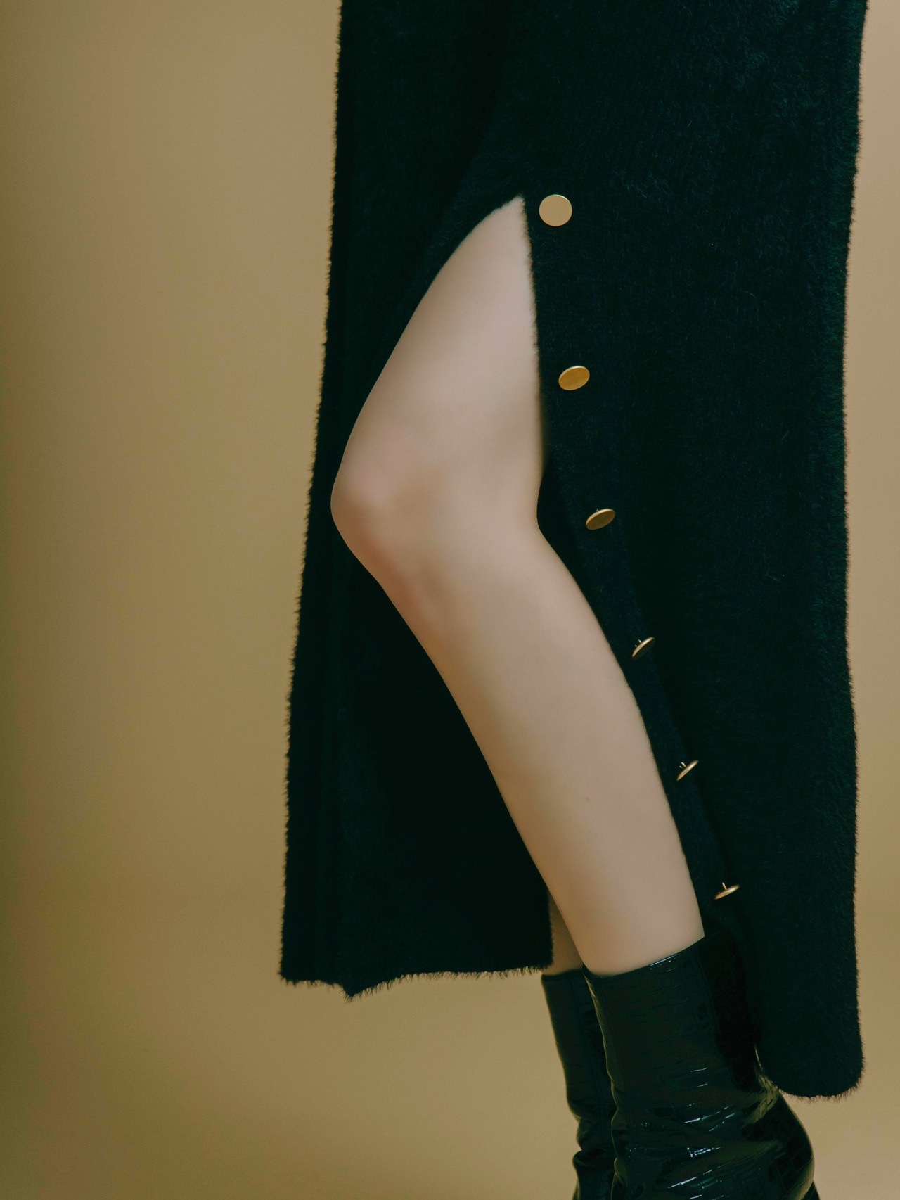 ゴールドボタンがアクセントのサイドスリットは、ボタンを締めてシンプルにも着ていただけます。お好みでボタンを開ければスリットとして、動くたびちらりと脚を覗かせ色っぽさも香ります。